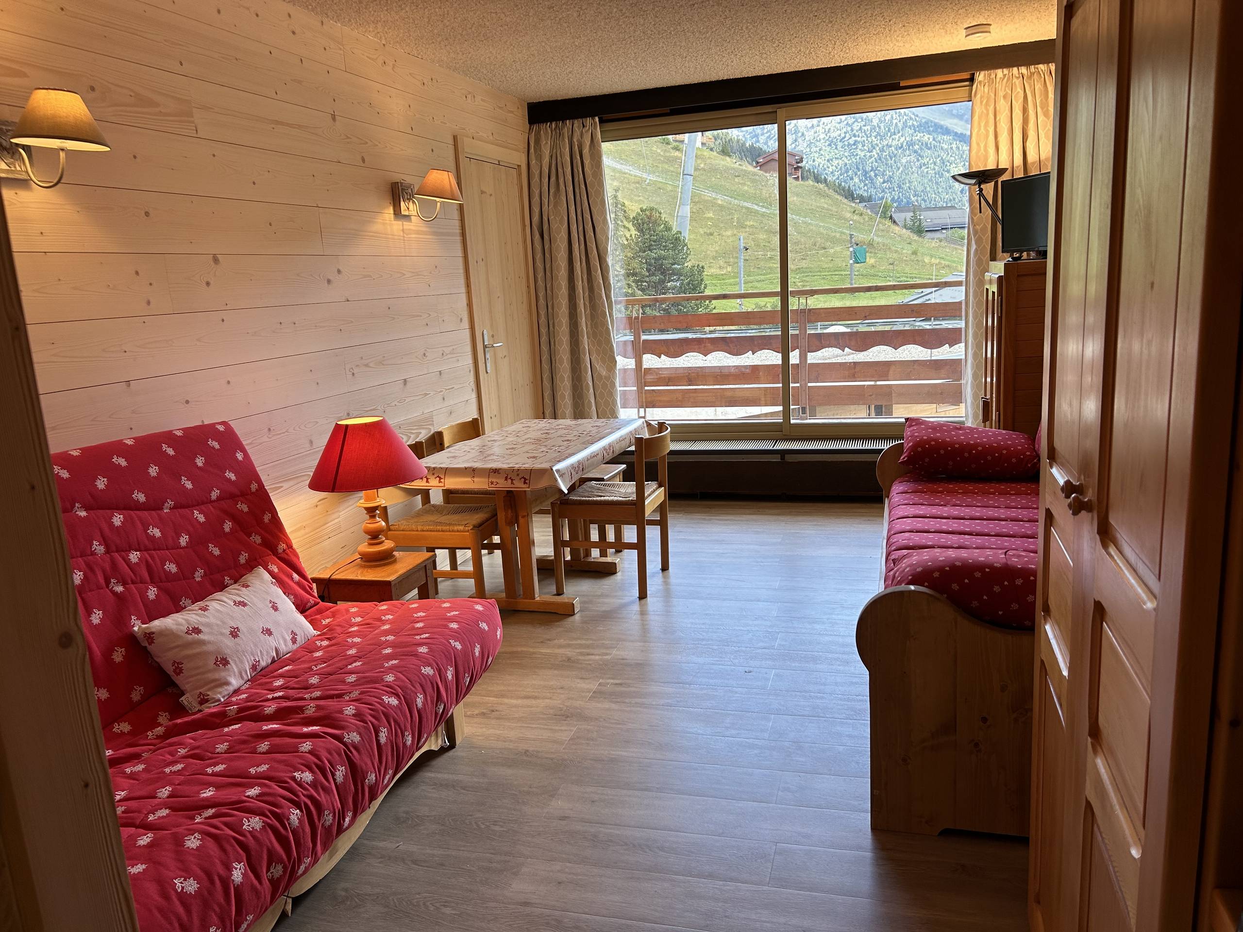 Living room with a sofa bed, a trundle bed and a sofa bed, television. Equipped with hob, microwave, dishwasher and refrigerator. Bathroom with toilet. South facing balcony. Non-smoking apartment. Ski locker and a lift in the residence. Pets forbidden.
