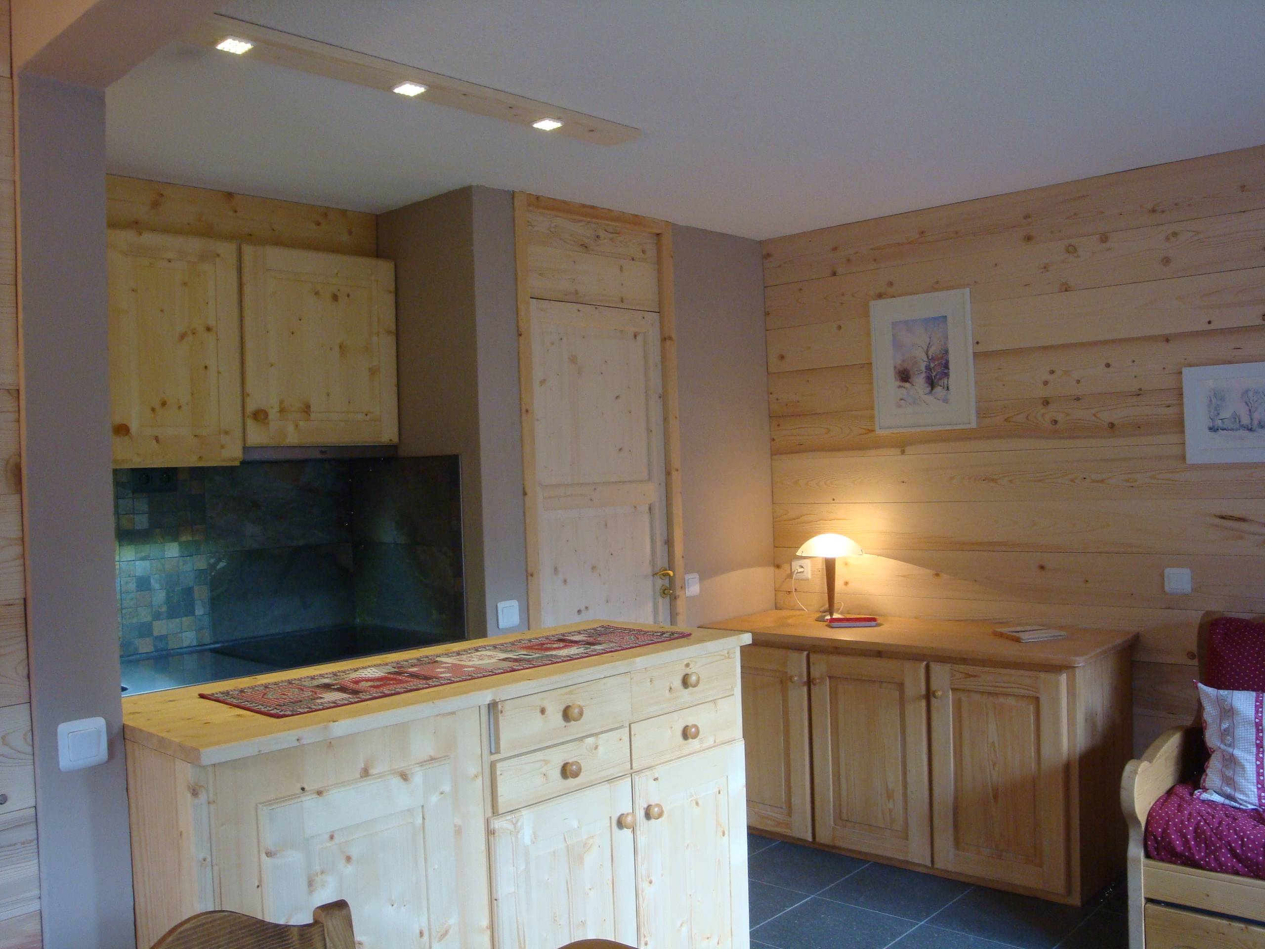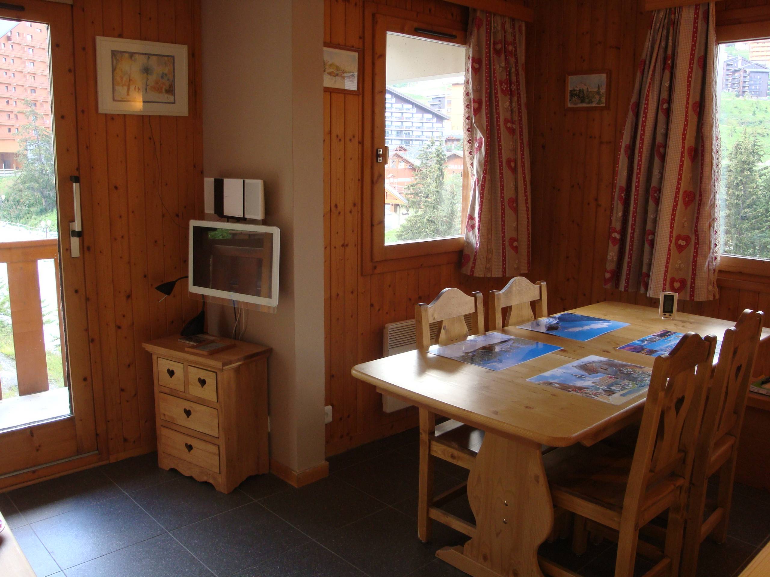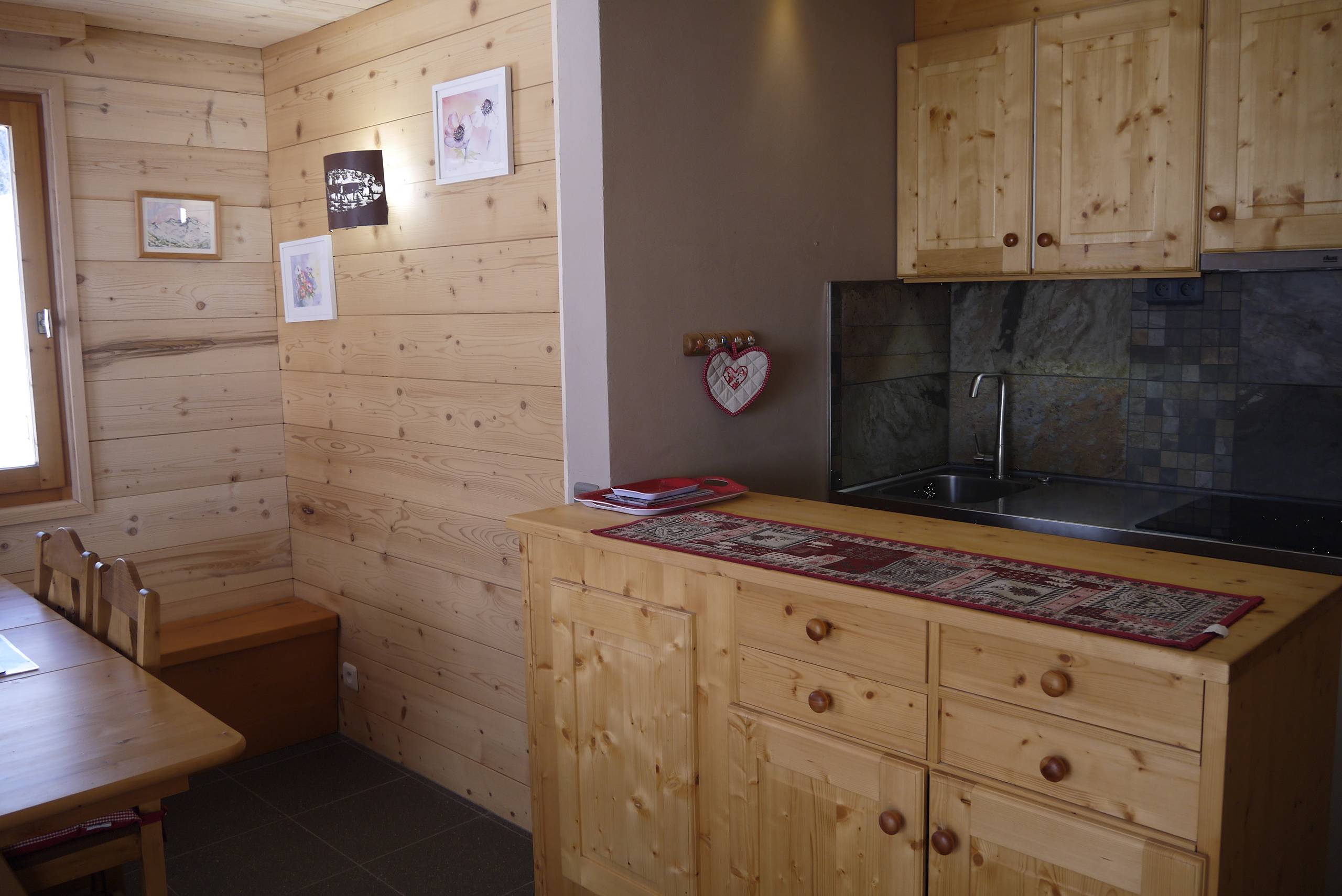 Lounge with a single bed, a pull-out bed (80x190) a TV, and a balcony southern exposure. A bedroom with a double bed (140x190). The kitchen is equipped with an electric hob, an oven, a microwave, and a dishwasher. The shower room and toilets are separated. LABEL MERIBEL. 4th floor. Non smoking apartment.