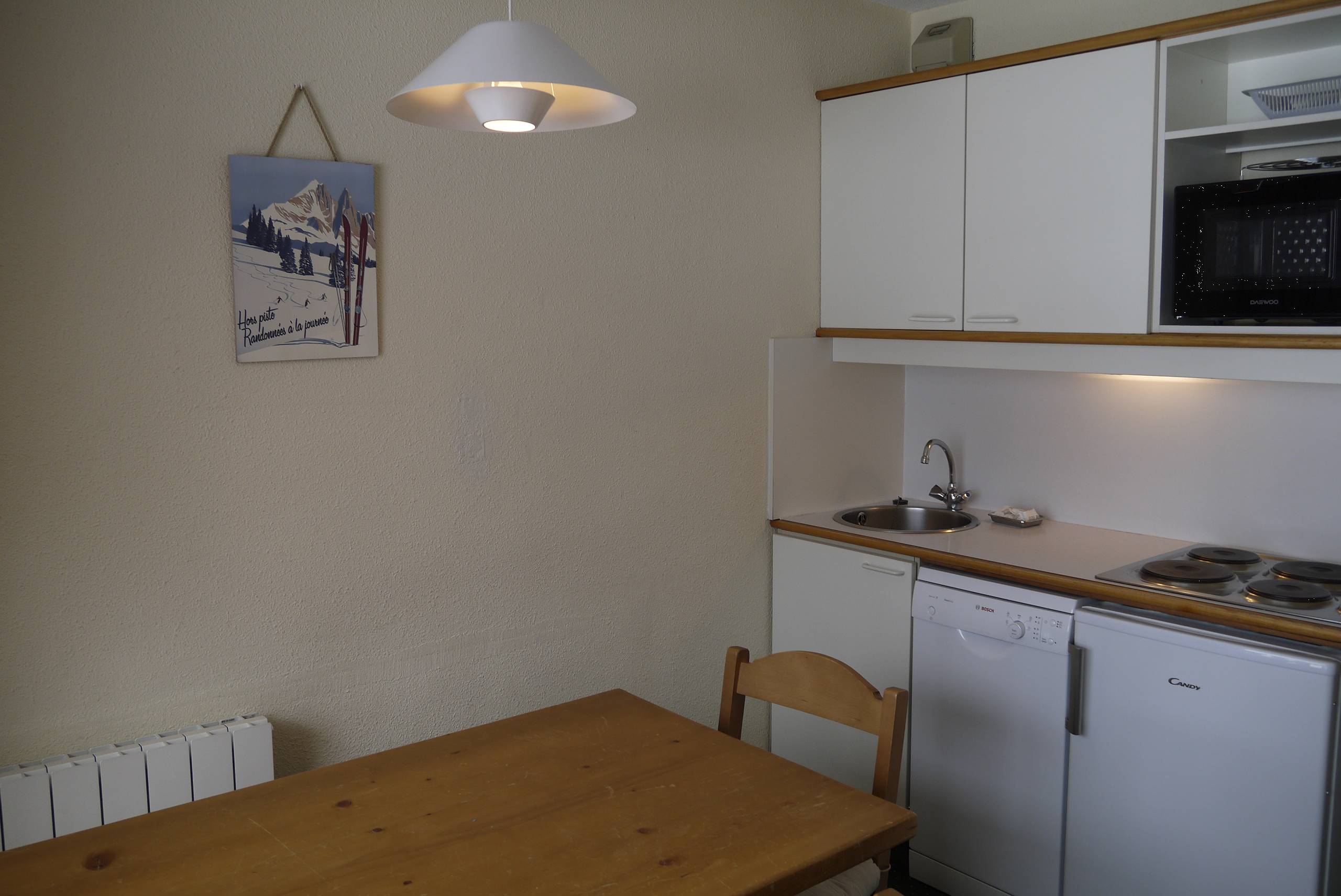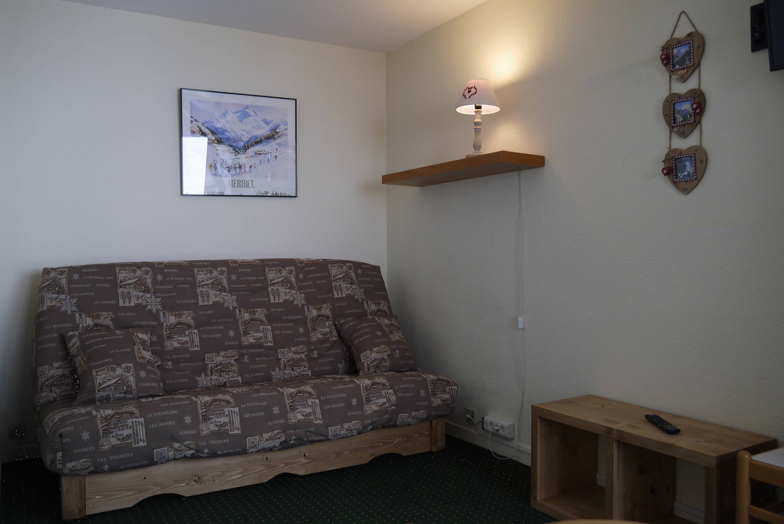Living room with one sofa bed (190x120) and TV. One room with 2 single beds pushed together (80x190). Equipped with a electric hob, oven, dishwasher and refrigerator. Bathroom with toilet. Balcony. Lift and ski locker in the residence.