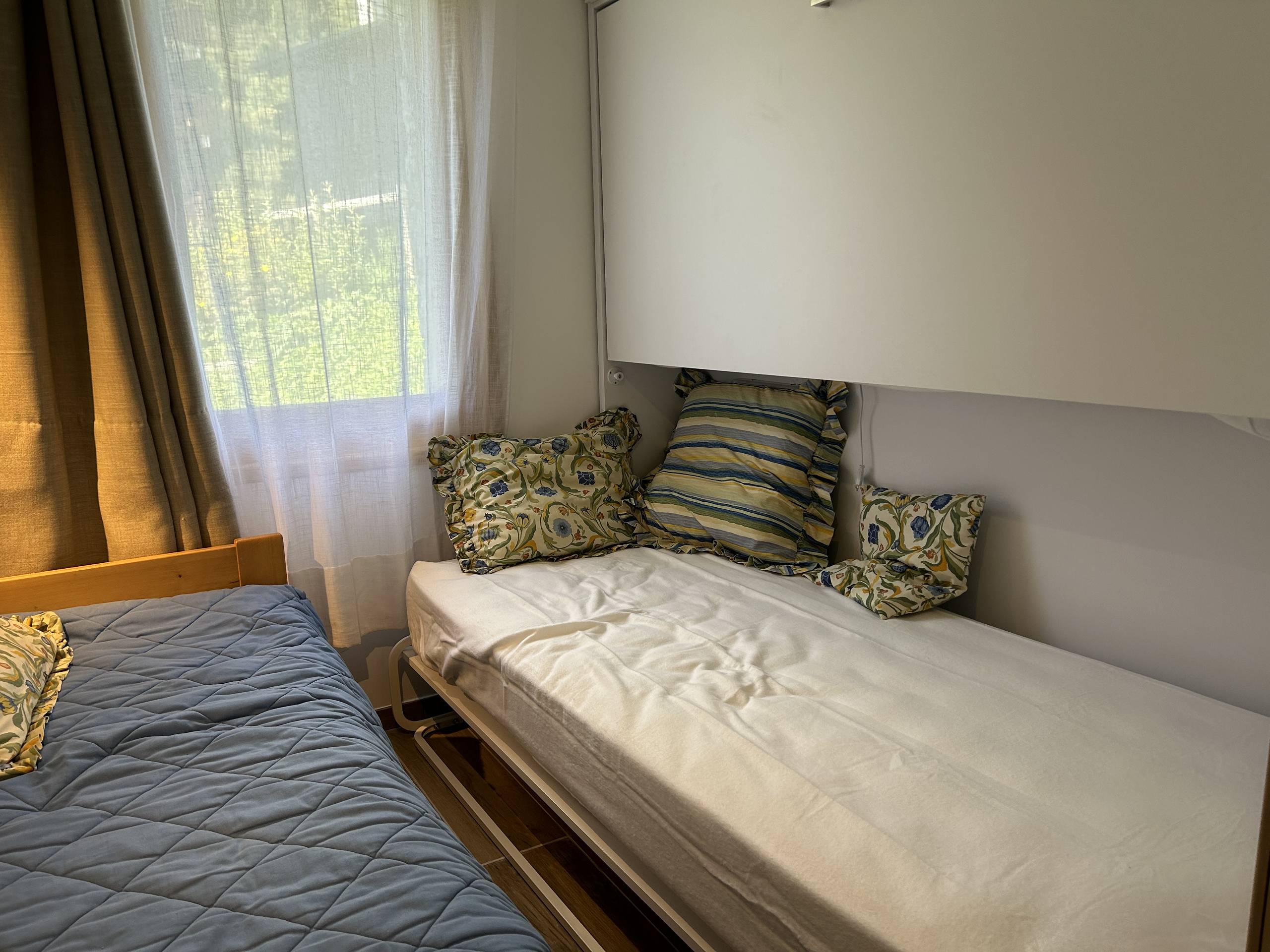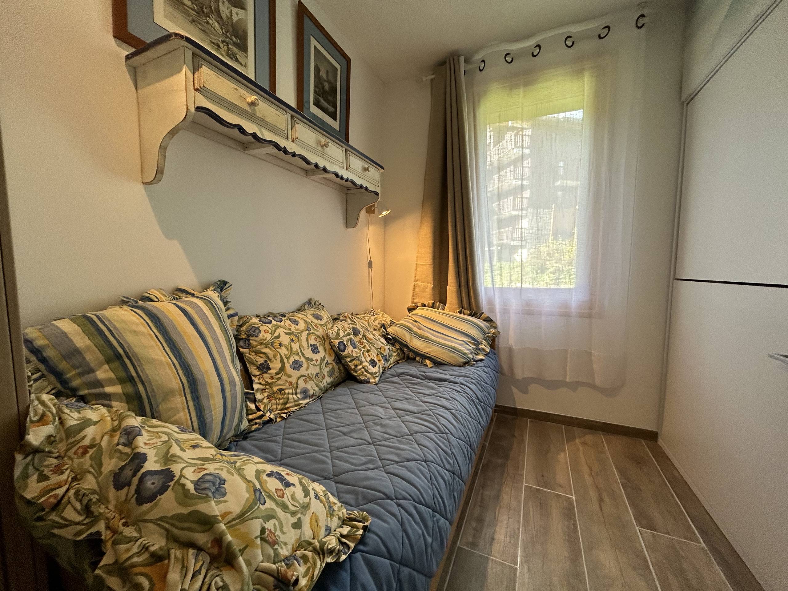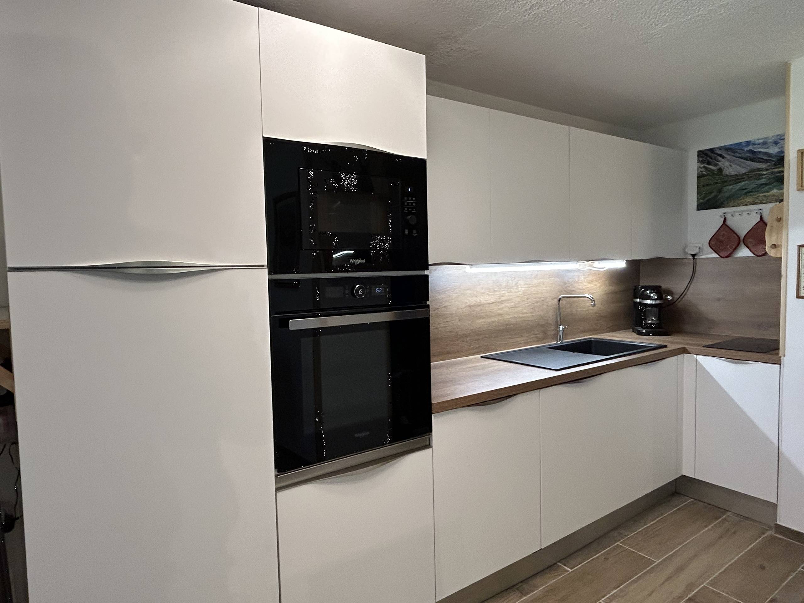 Studio with sofa 140x190. The cabine 2 beds 80x190 (top bed is condemned). The kitchen is fitted with electrib hob, microwave, hover, a dishwasher, a waching machine, toaster, kettle, coffee maker and a big fridge. The bathroom (italian shower) and toilets are separate. Balcony. No-smoking apartment, no animal. Ski lockers and elevator in the residence.