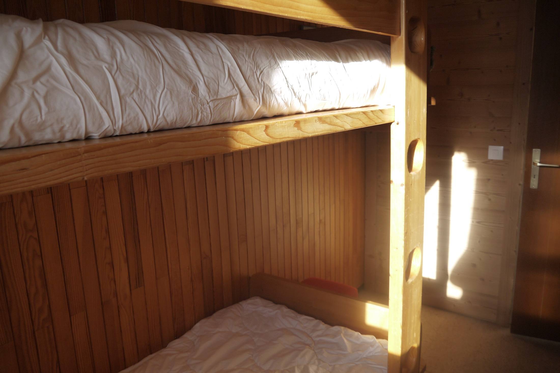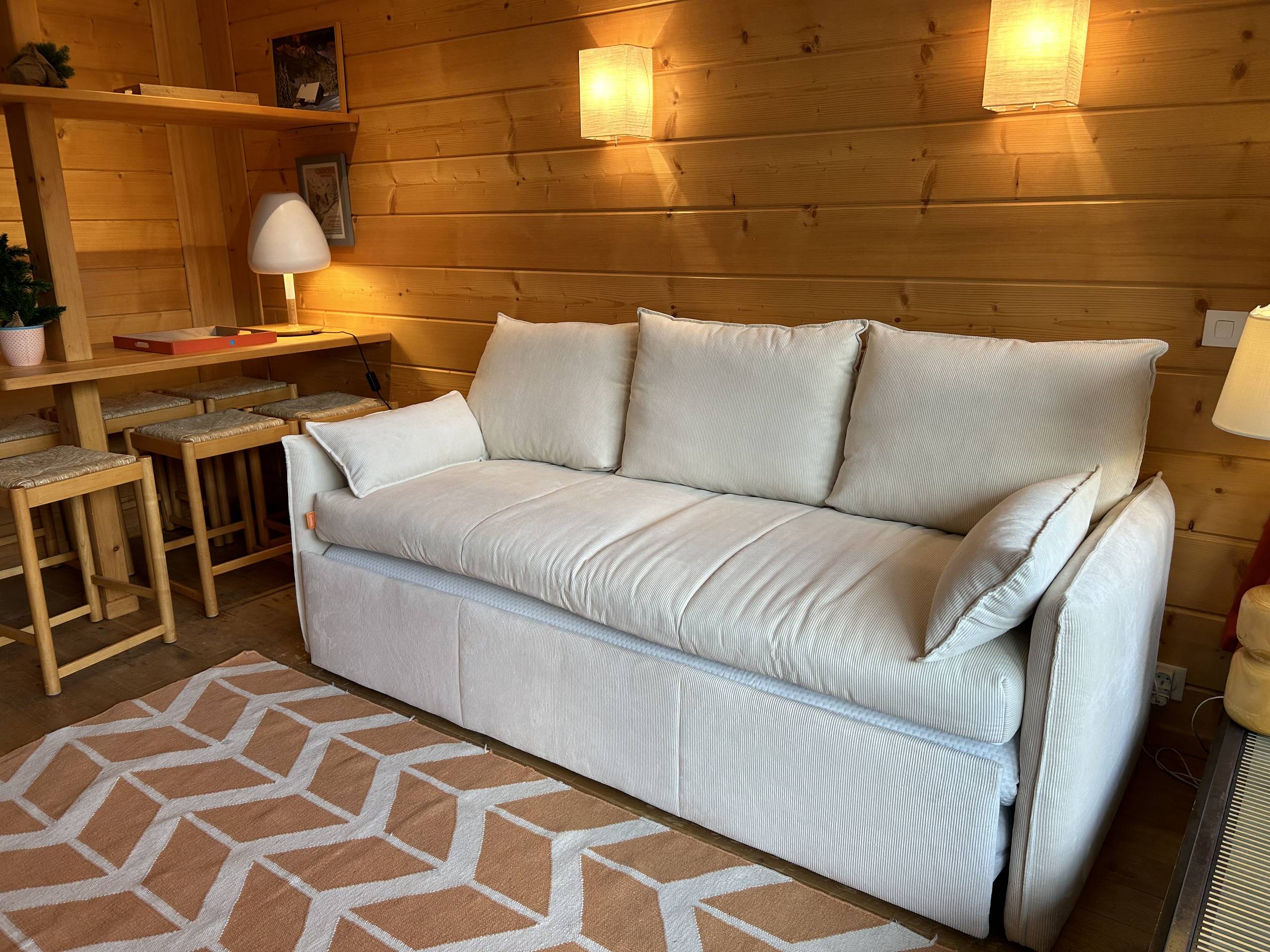 Living room with sofa bed (160x190). Bedroom with a set of bunk beds and a trundle bed (80x190). Equipped with hob, oven, dishwasher and refrigerator.