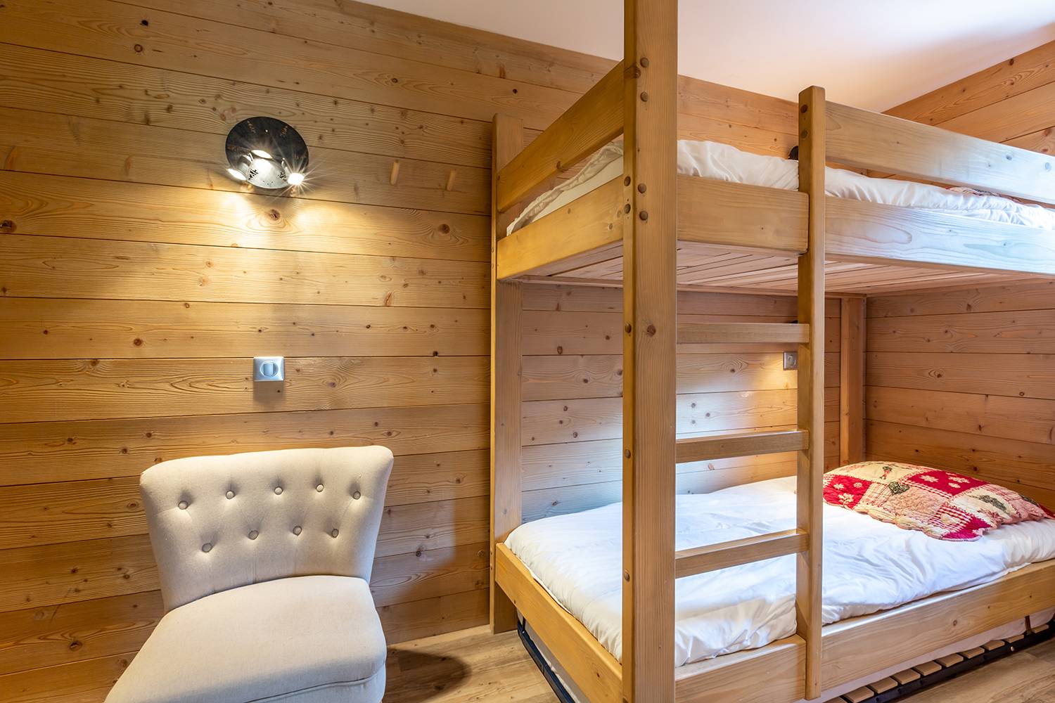 Living room with non convertible sofa and TV. Bedroom 1 with a set of bunk beds (3 sleeps 90x190). Bedroom 2 with double bed (140x190). American kitchen equipped with ceramic hob, oven, microwave, dishwasher, kettle, coffee machine and refrigerator.