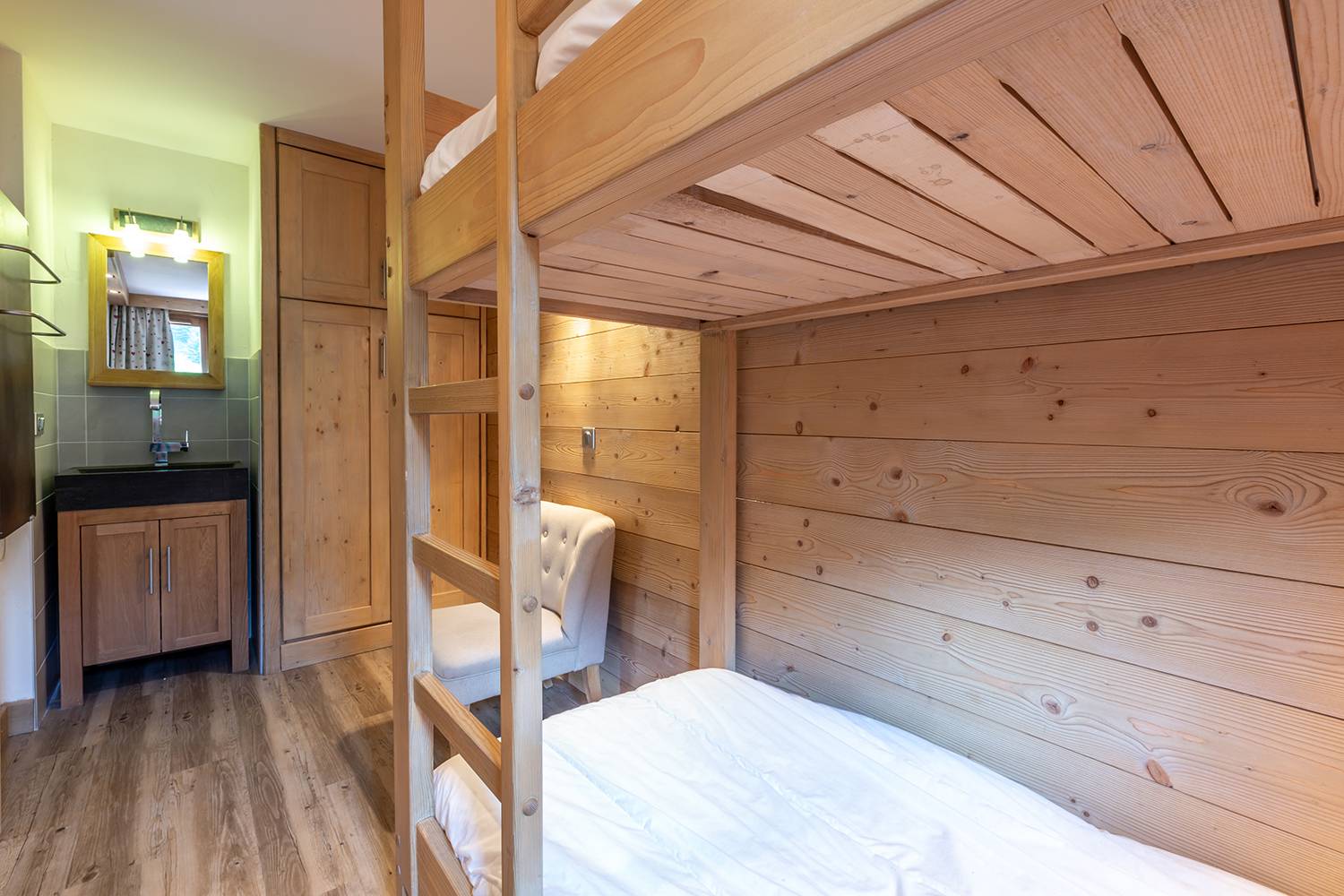 Living room with non convertible sofa and TV. Bedroom 1 with a set of bunk beds (3 sleeps 90x190). Bedroom 2 with double bed (140x190). American kitchen equipped with ceramic hob, oven, microwave, dishwasher, kettle, coffee machine and refrigerator.