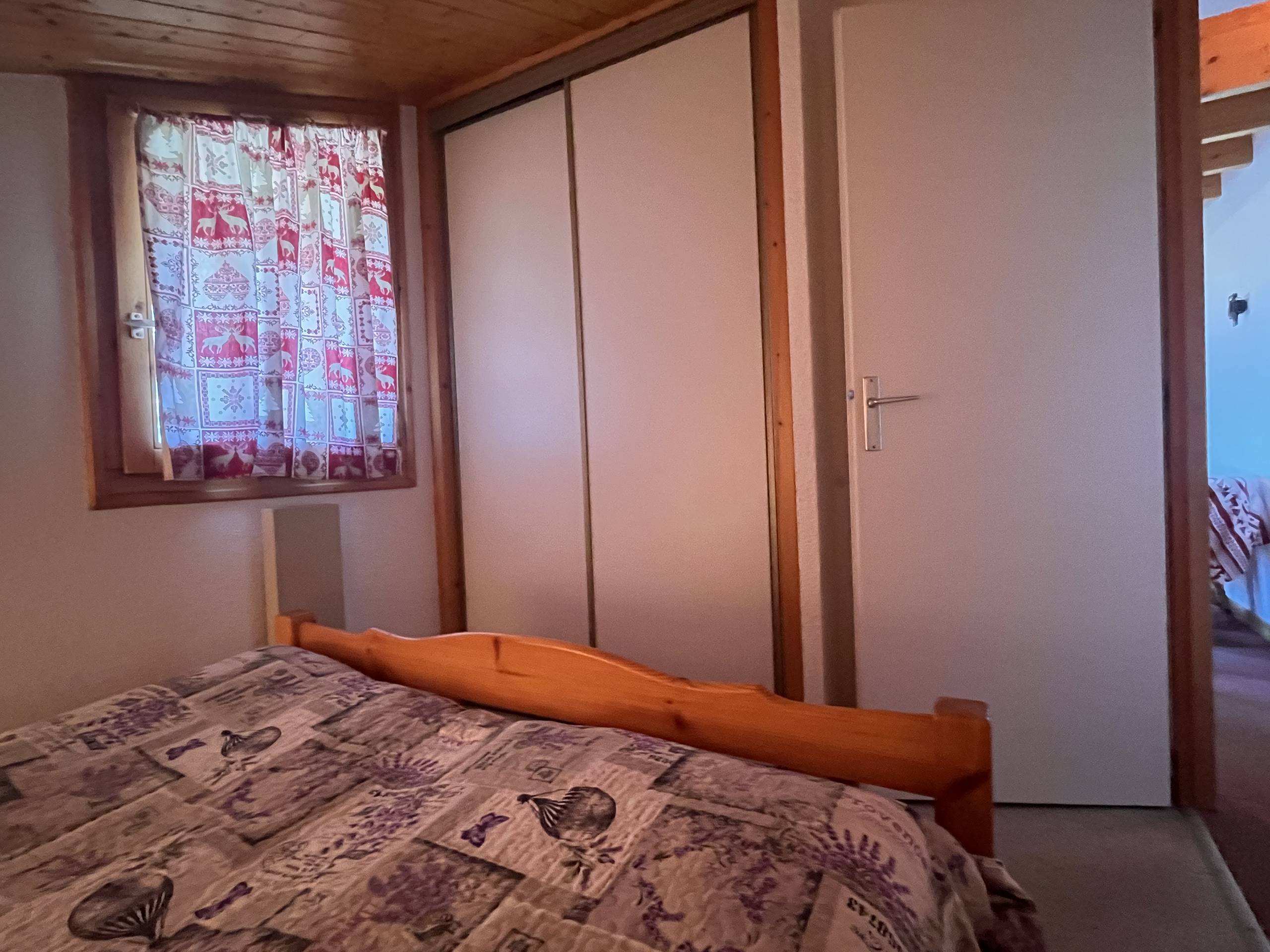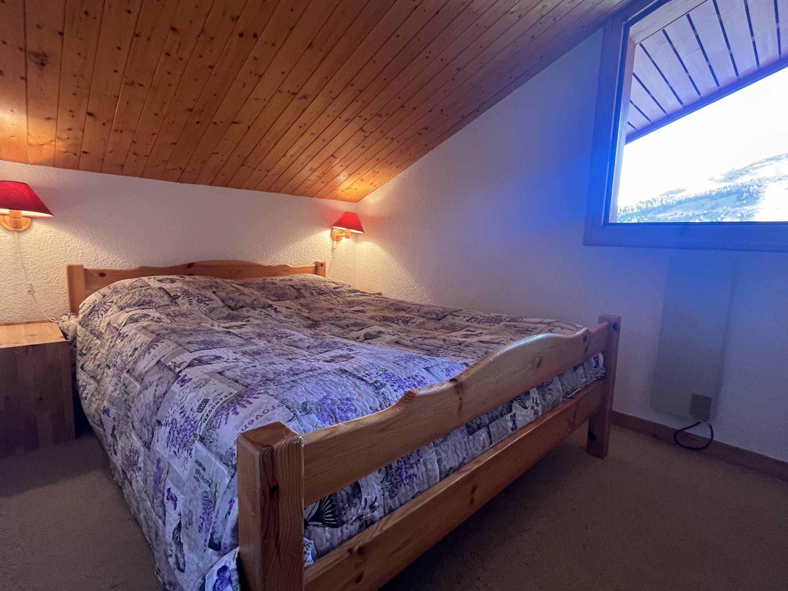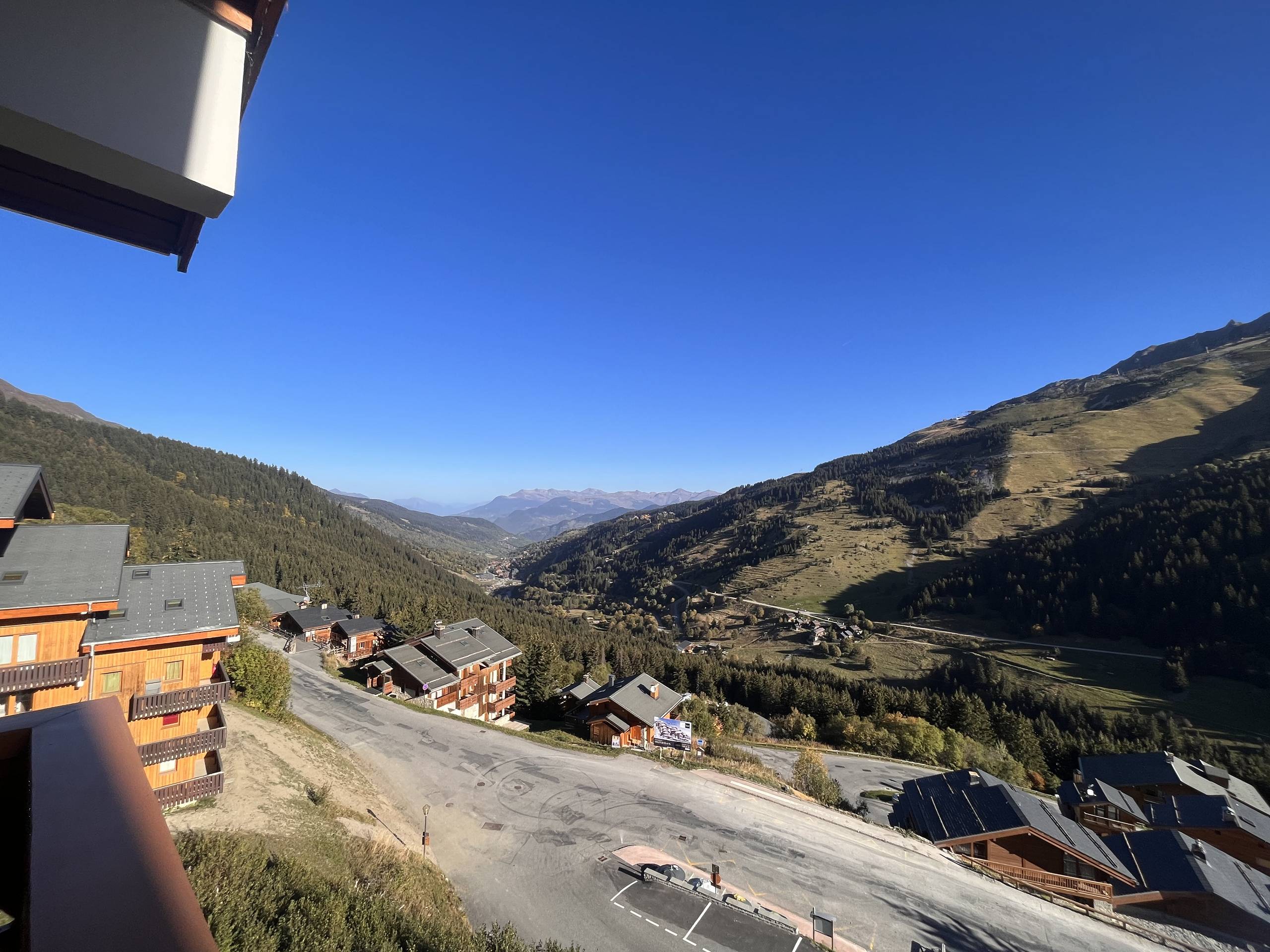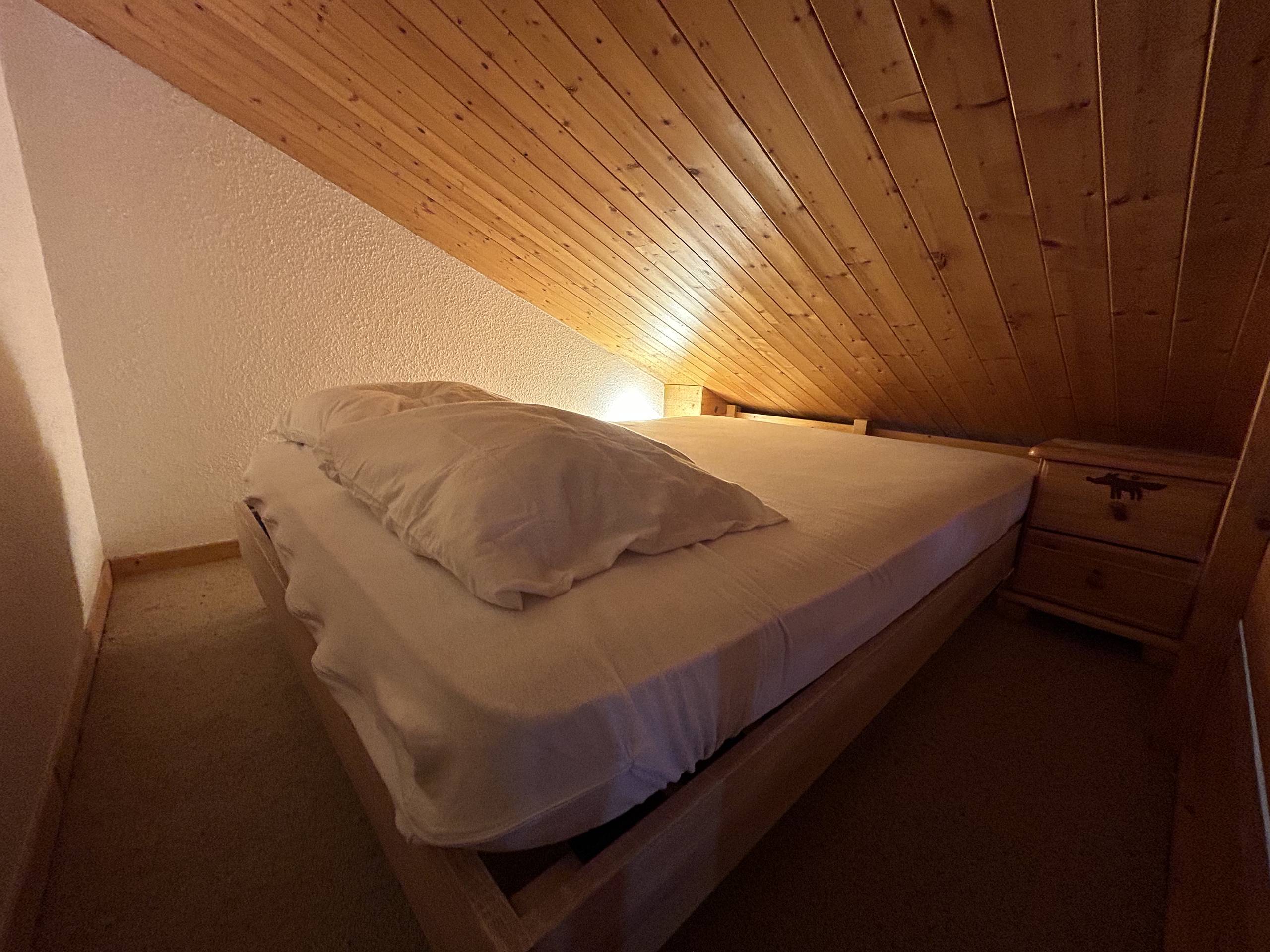 It is composed of an entrance, an attic bedroom (minimum height 110cm) with a single bed, a second bedroom also under the slope (minimum height 110cm) with a double bed and an open mezzanine space with a lot of sloping ceilings (max height 140cm and minimum 40cm at the feet) accessible by a miller's ladder (not suitable for children) with a double bed. The mezzanine area can only be considered for extra sleeping. The living room opens onto a balcony with panoramic views from Méribel to the Aiguille du Fruit, with the Saulire just opposite. Kitchenette equipped with dishwasher, electric hob (x4), oven, kettle and coffee maker. The fireplace in the apartment is not usable. A bathroom with bathtub, and a separate toilet.