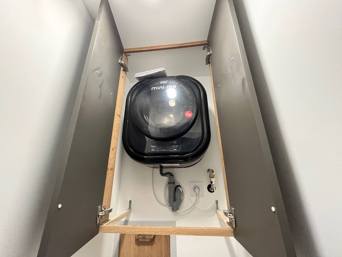 Italian-style shower room and separate toilet with a 3 kg washing machine for added convenience.