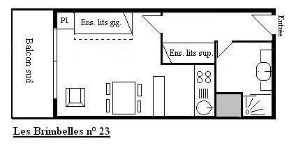 This apartment in the mountains located on the 3rd floor, with lift, includes an entrance with a set of bunk beds for 1 person and a bathroom with a toilet, an equipped kitchen open to the living room with a set of pull-out trundle beds, a television and a south facing balcony.