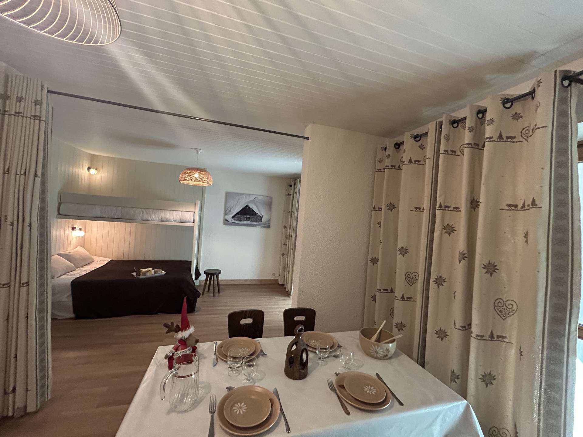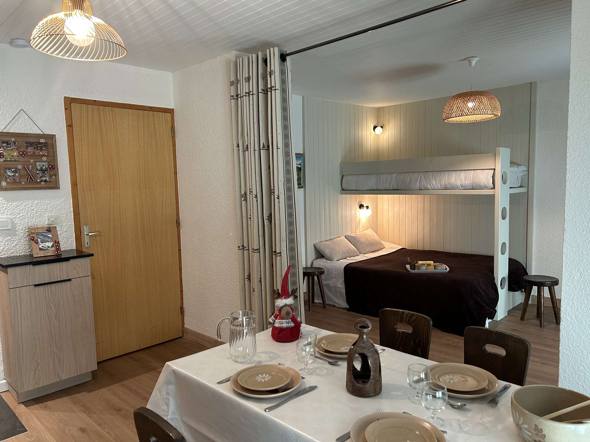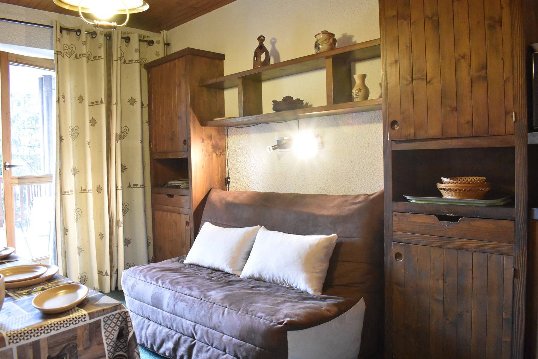 This rental in the mountains includes a living room with a double sofa bed, a television, an equipped kitchen, a bedroom separated from the living room by a curtain with 1 double bed, a bathroom and a separate toilet.