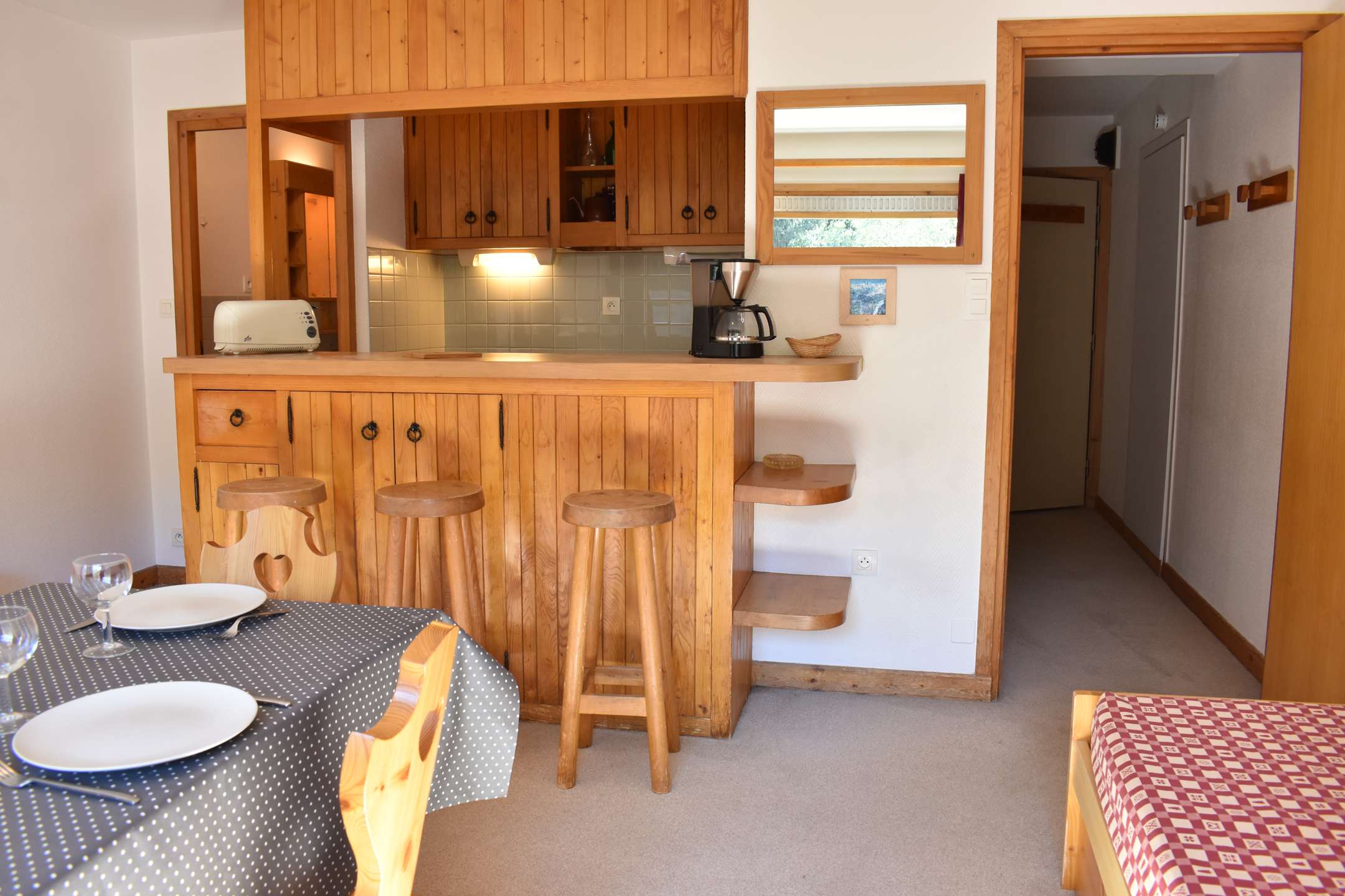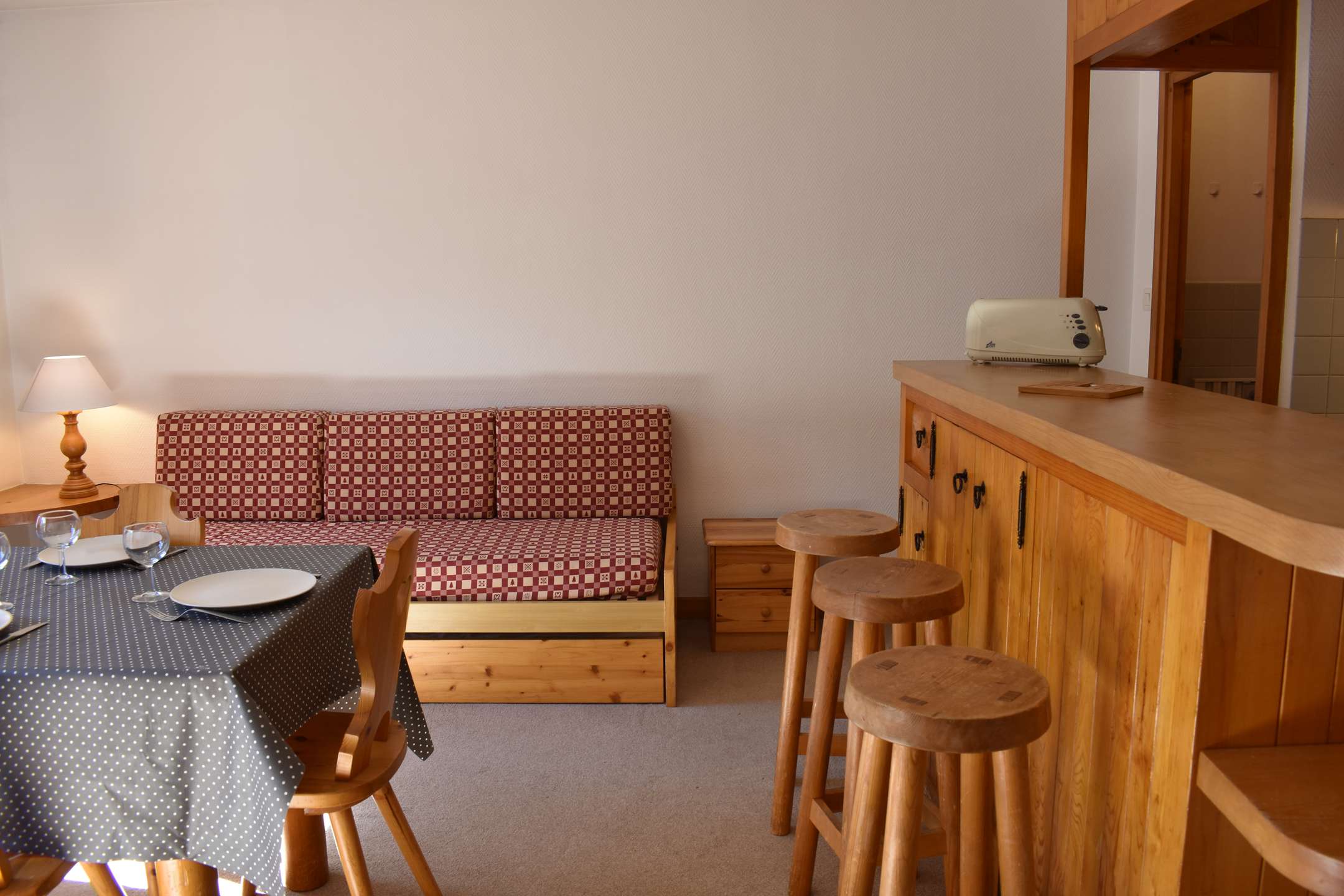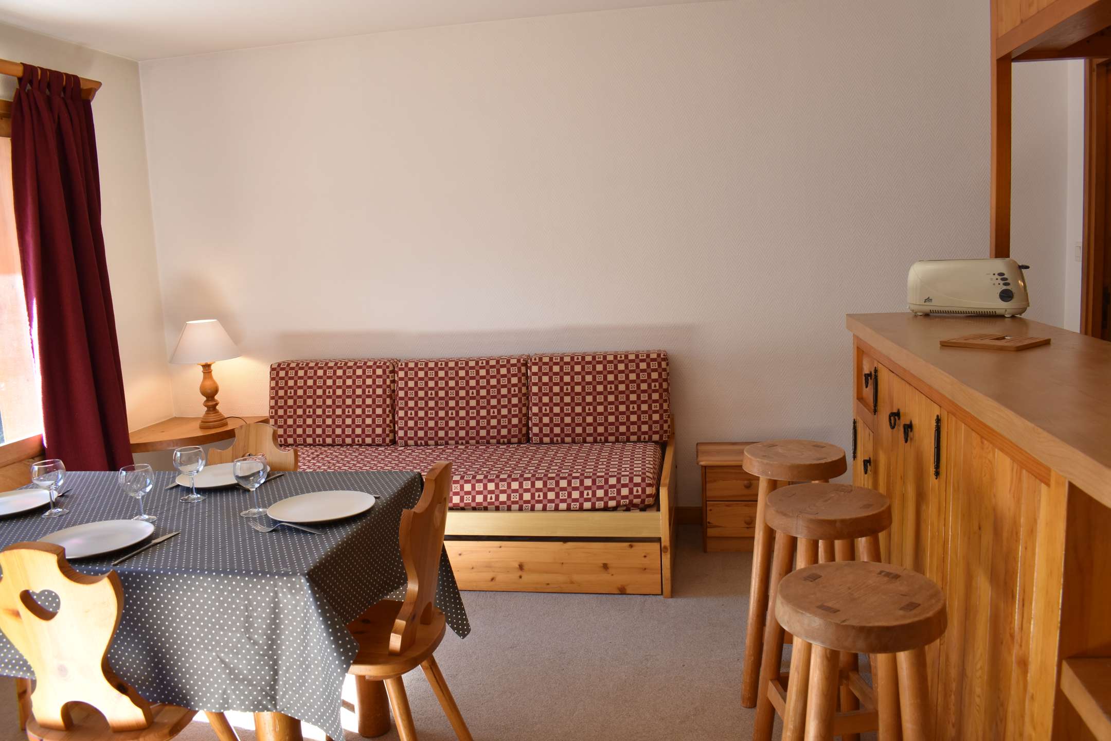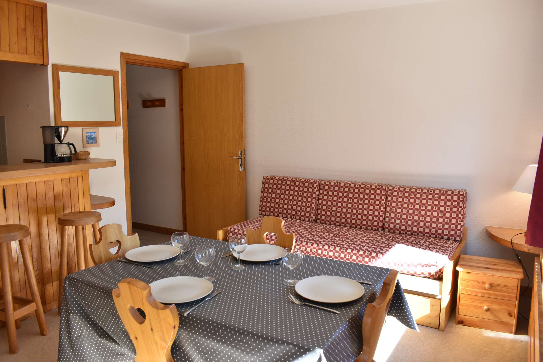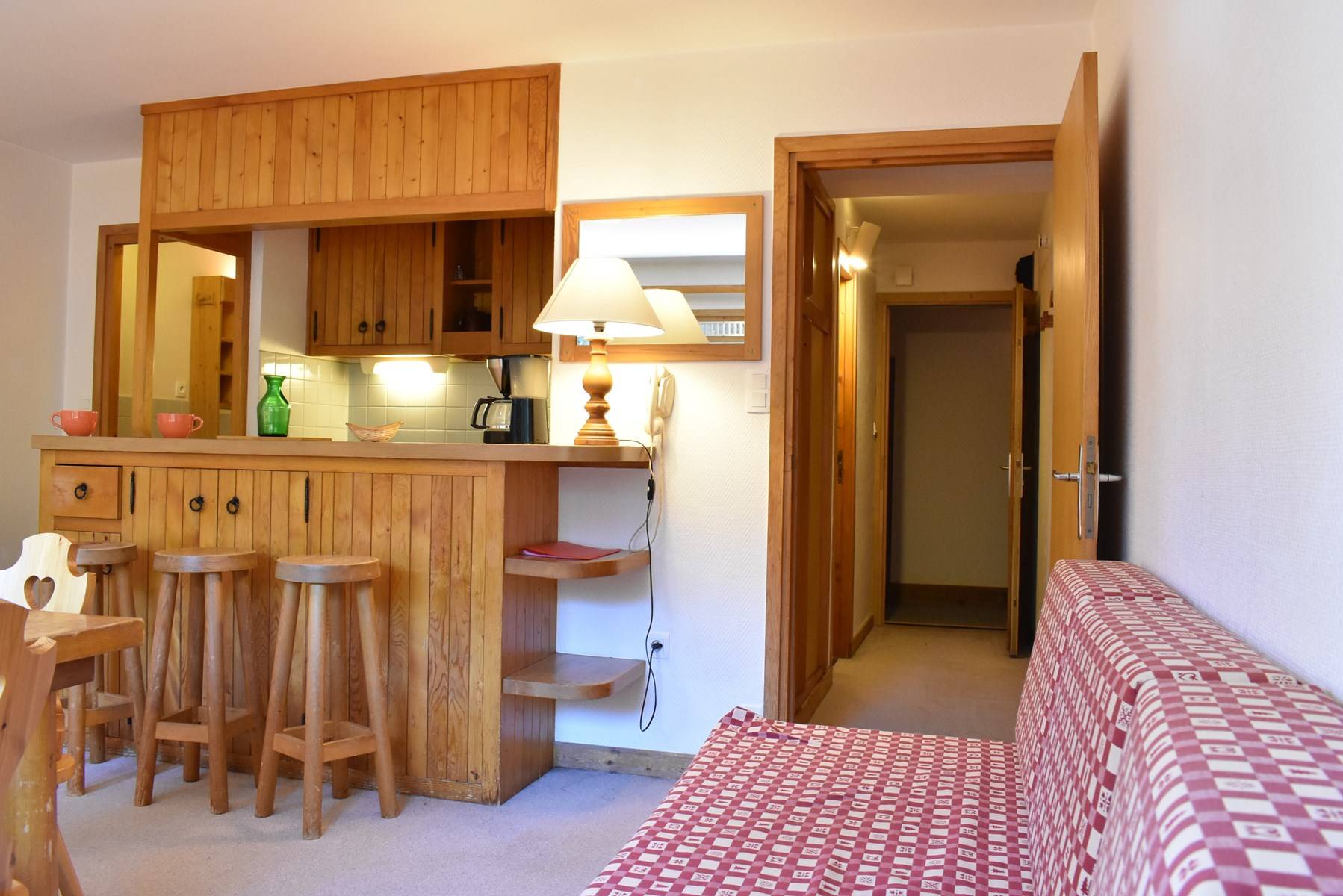 This studio apartment in the mountains located on the second floor by elevator (then go down 1/2 floor on foot) includes a living room (south-facing balcony) with two sets of pull-out pull-out beds, an equipped kitchen and a bathroom with separate WC. Access to shared ski storage.