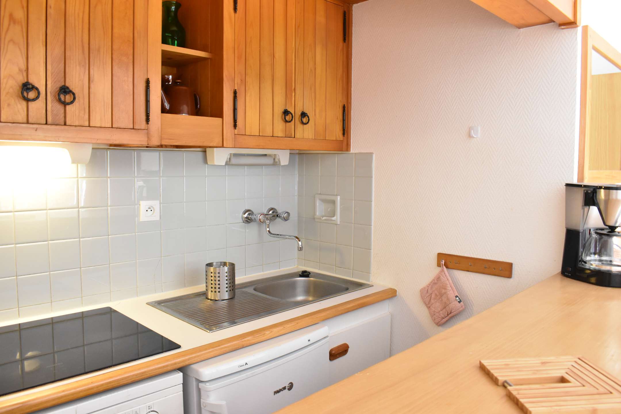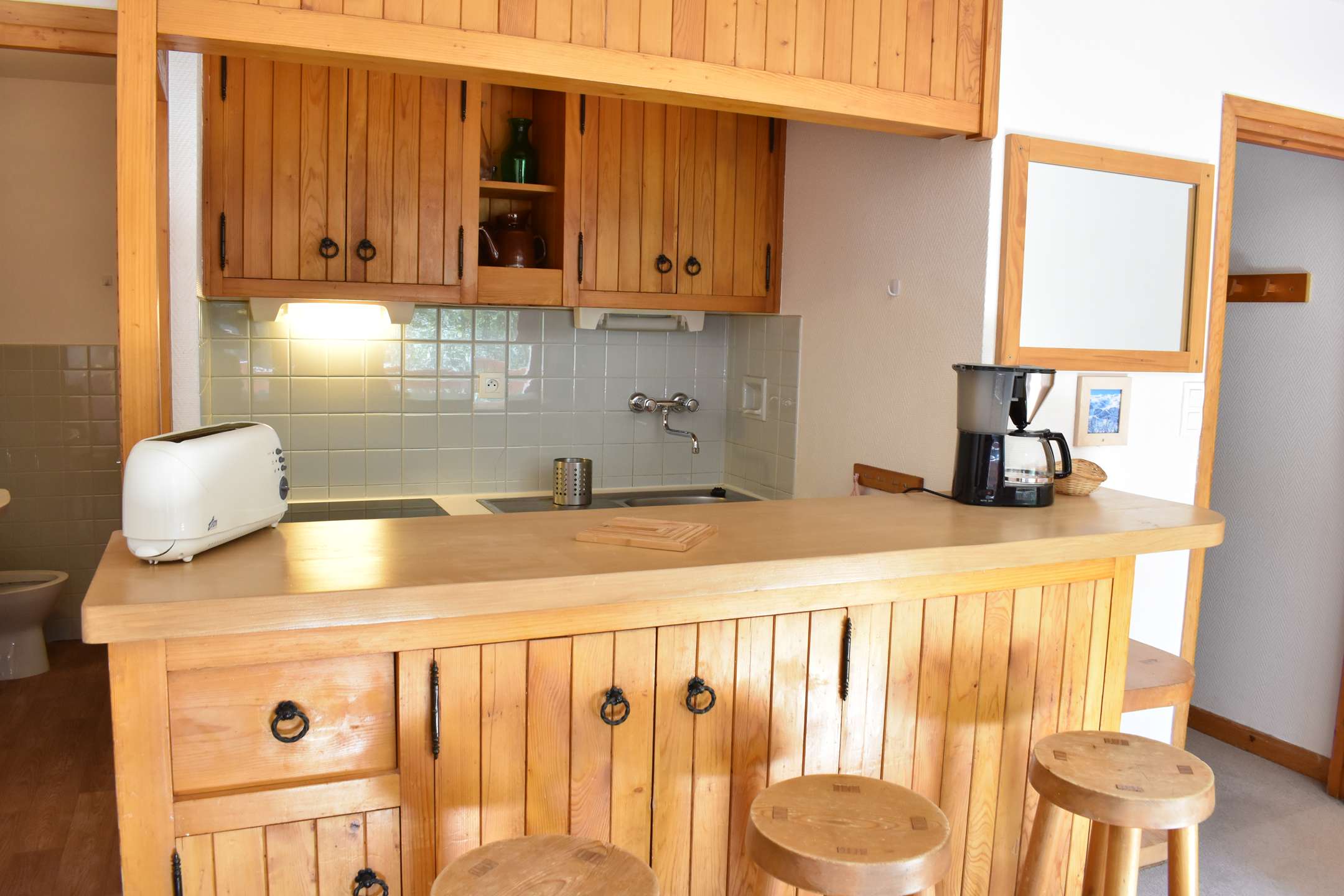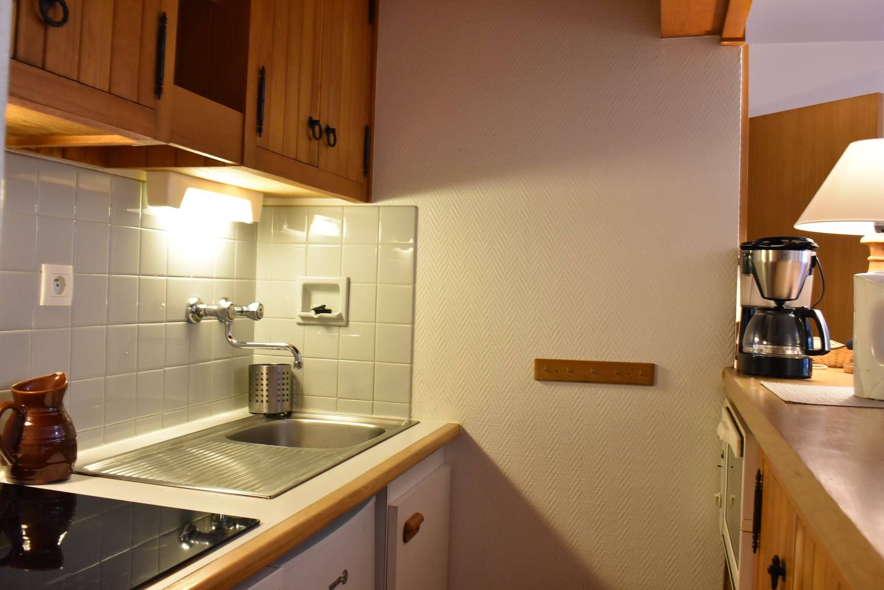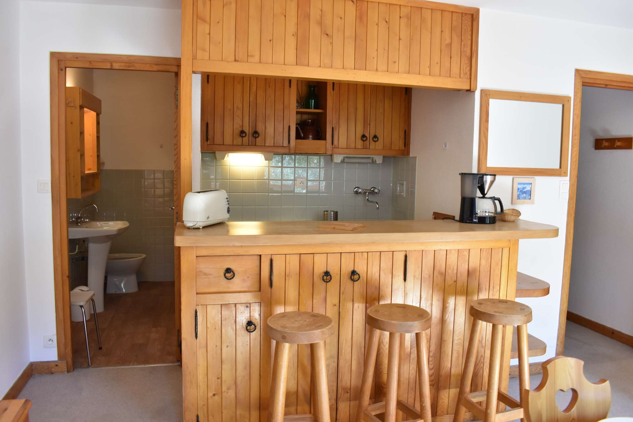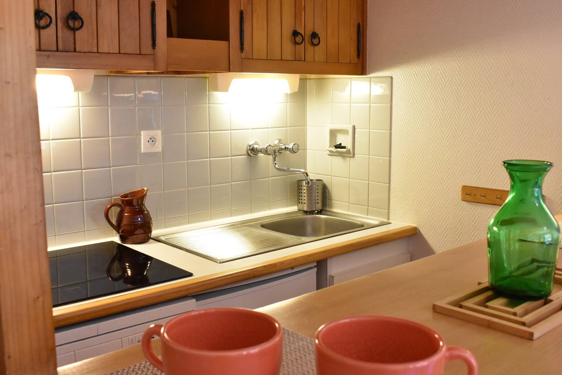 This studio apartment in the mountains located on the second floor by elevator (then go down 1/2 floor on foot) includes a living room (south-facing balcony) with two sets of pull-out pull-out beds, an equipped kitchen and a bathroom with separate WC. Access to shared ski storage.