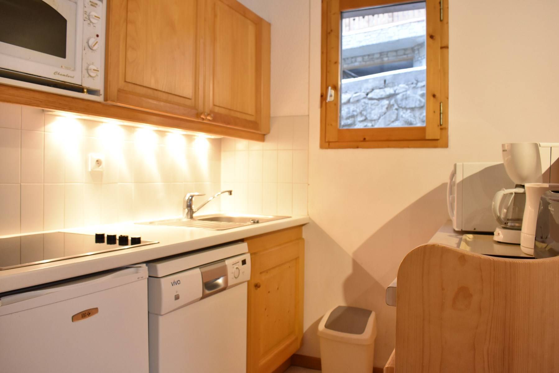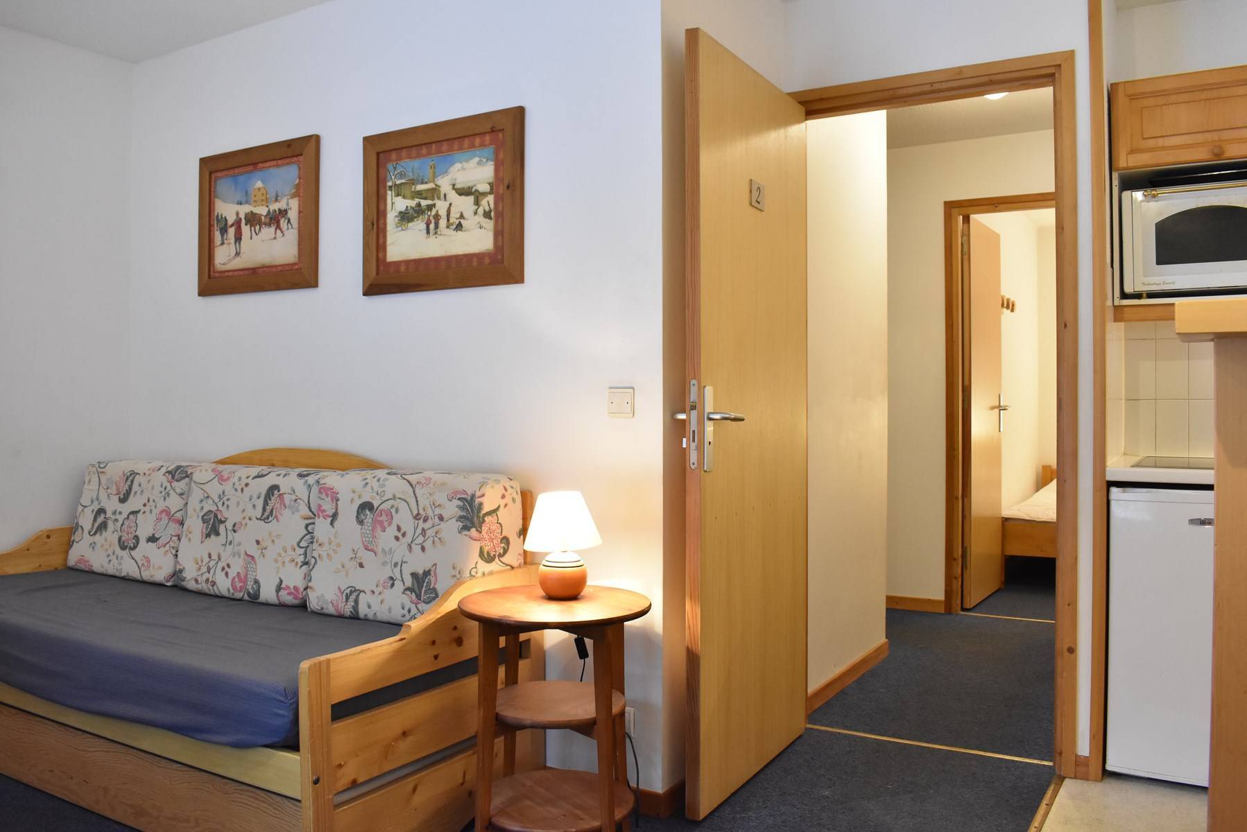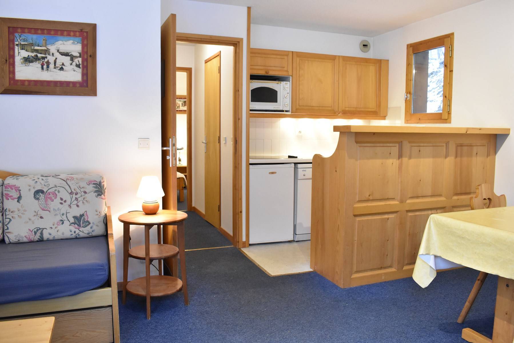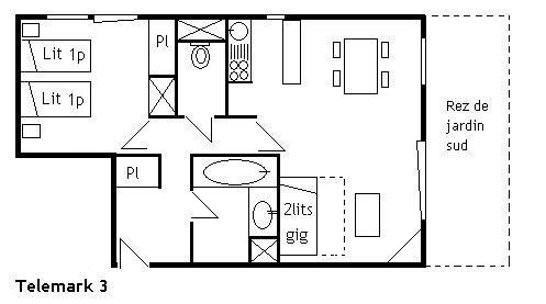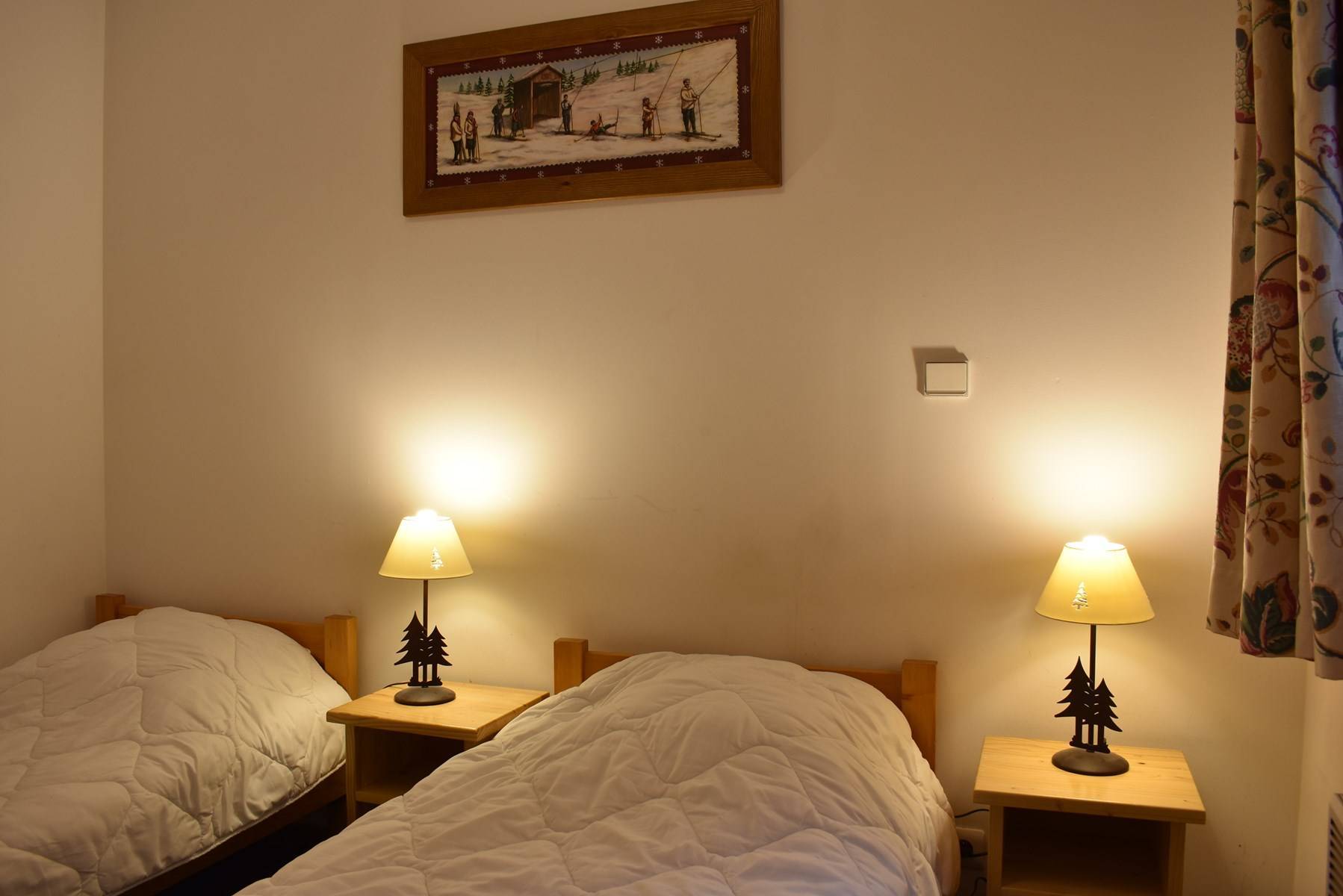 This apartment in the mountains located on the 1st floor, with elevator, includes an equipped kitchen open to the living room with a dining area and 1 living room with a set of pull-out trundle beds opening onto a south-facing garden level, 1 bedroom with 2 single beds East facing, 1 bathroom and 1 separate toilet.