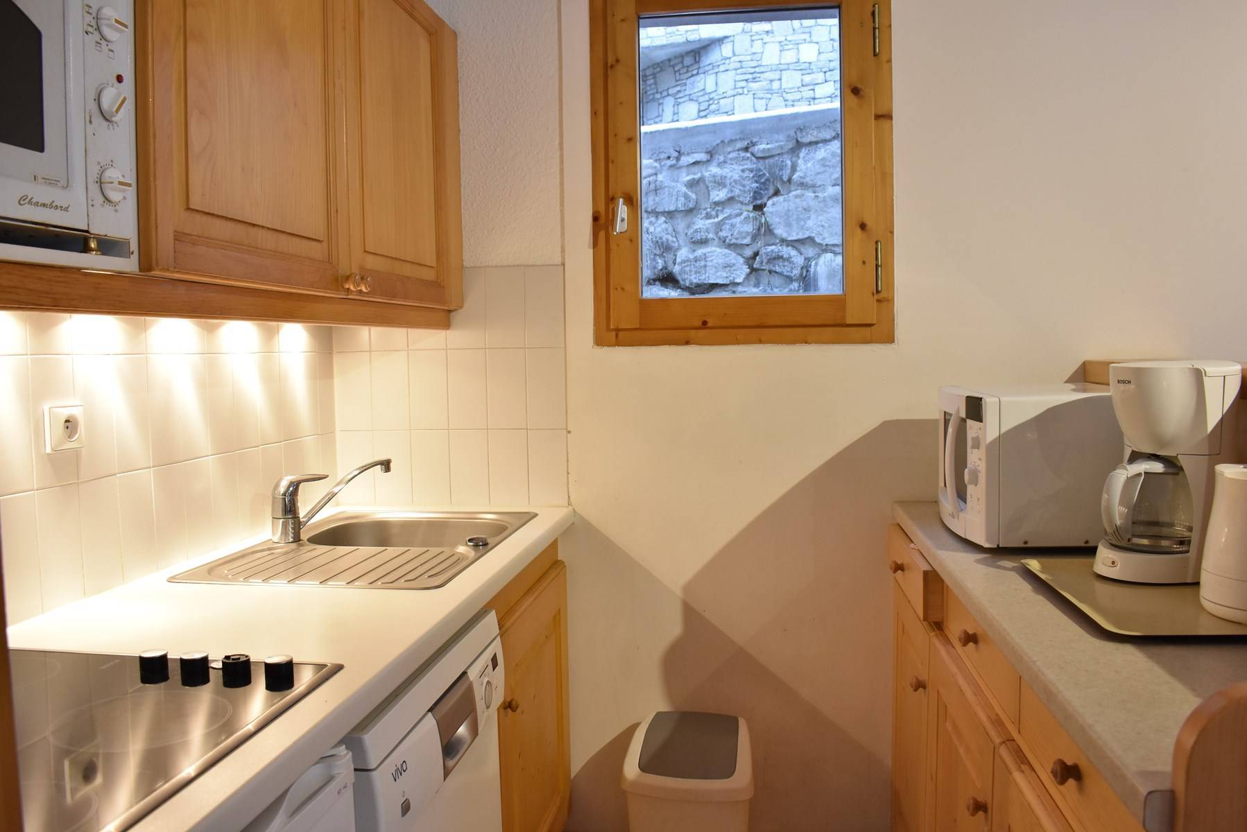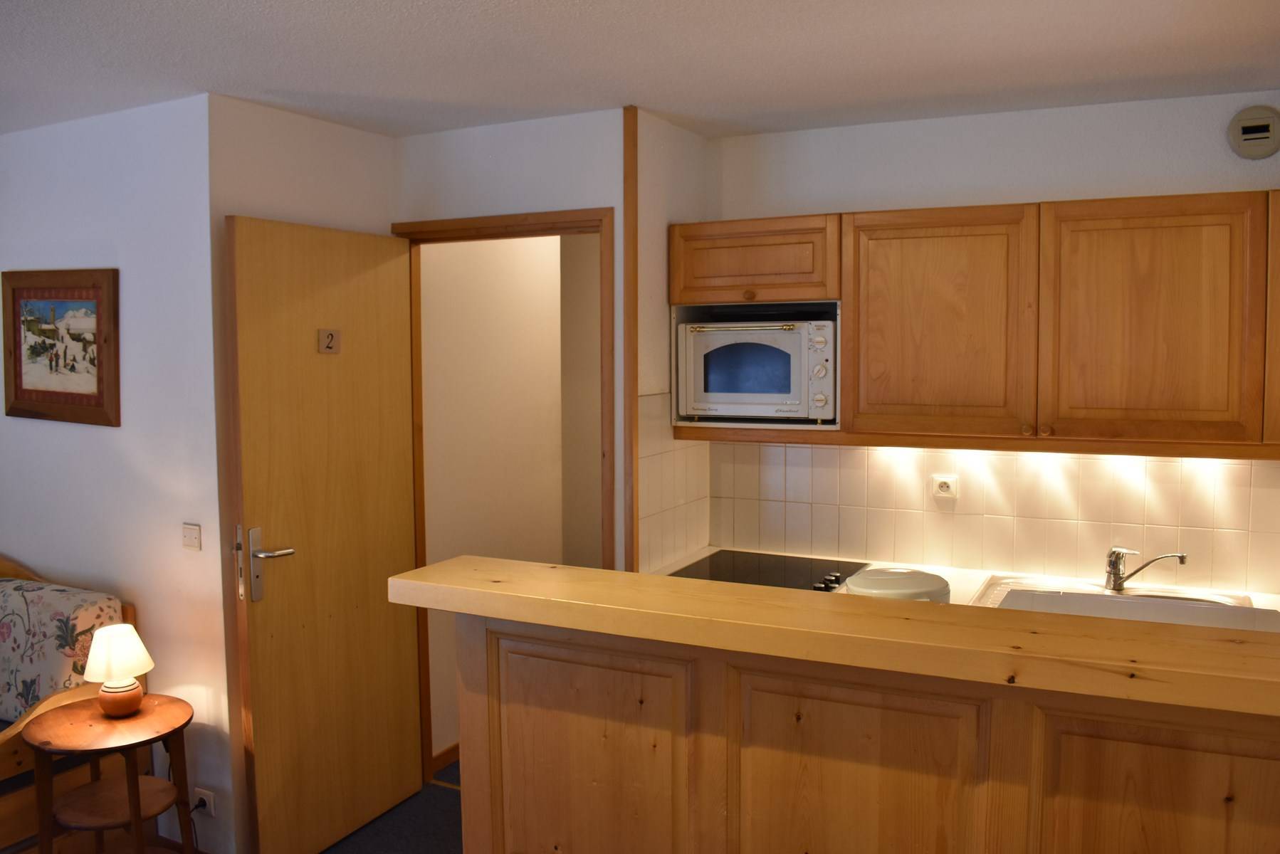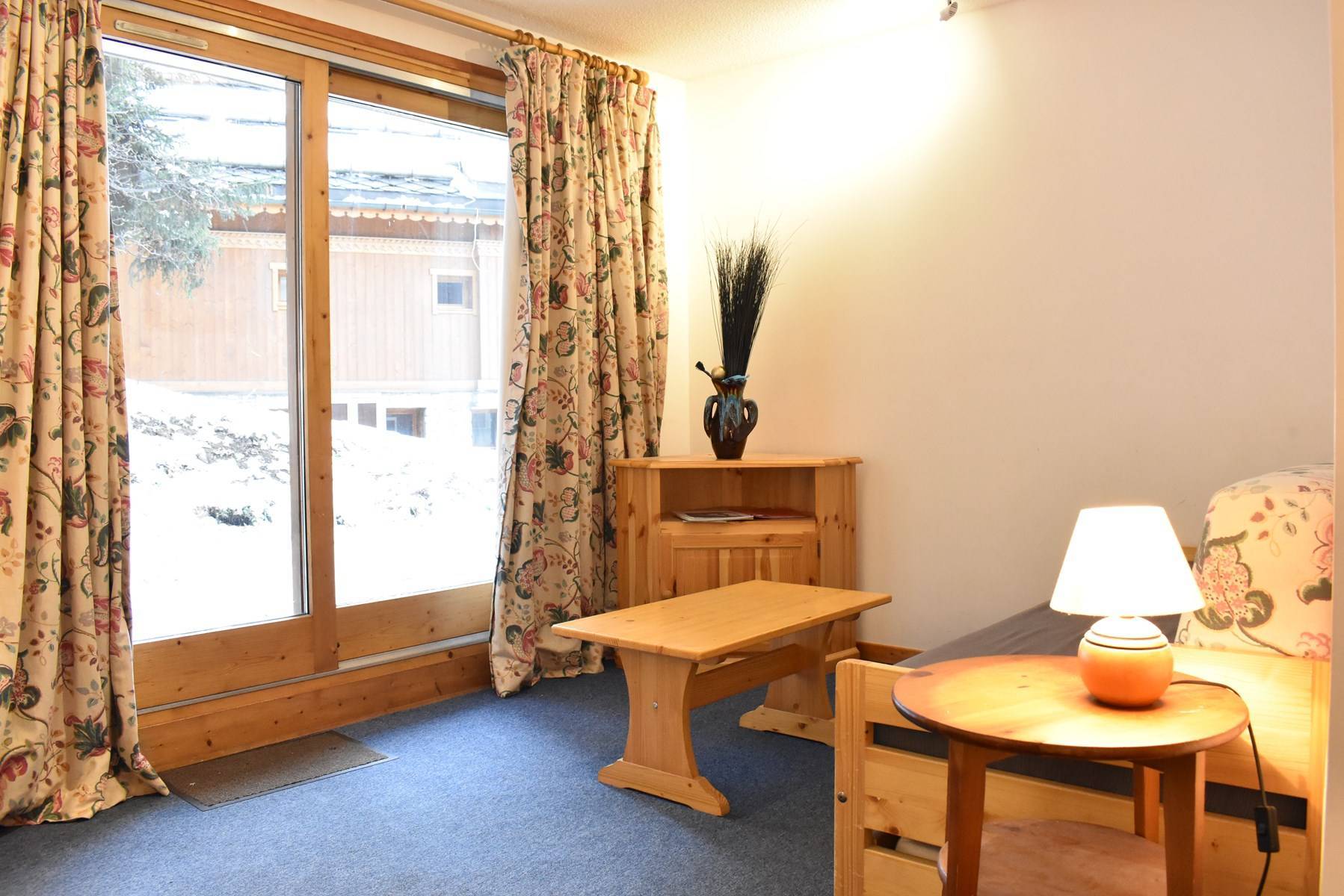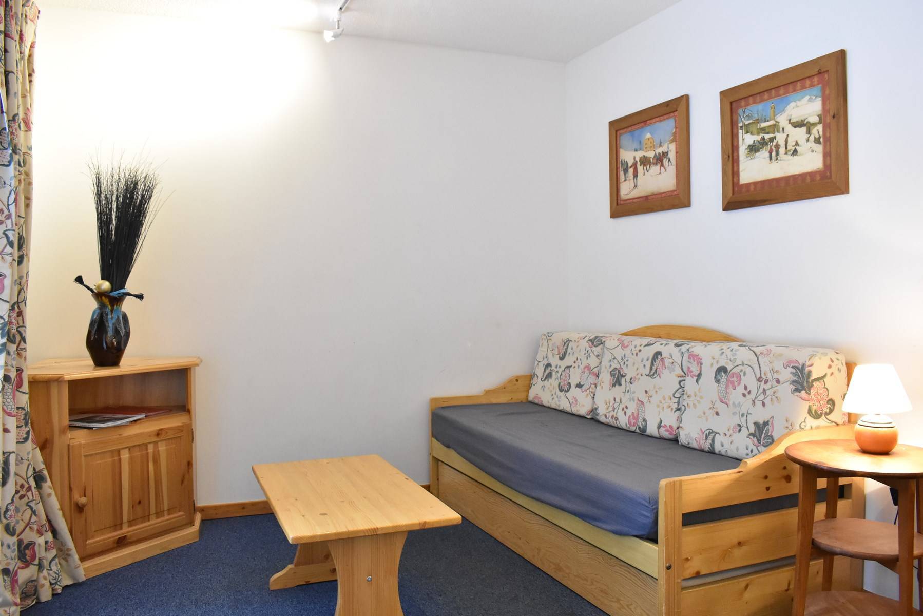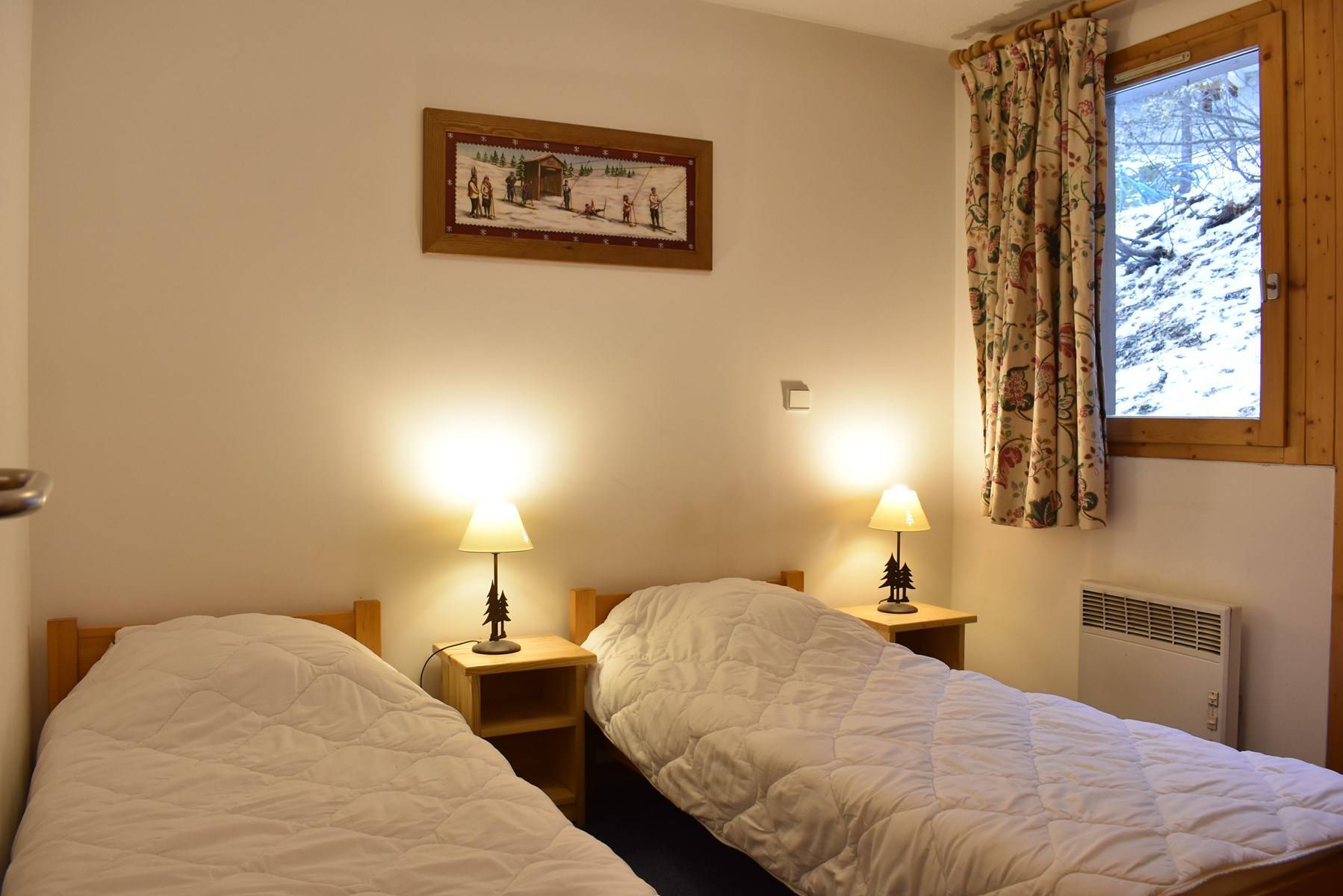 This apartment in the mountains located on the 1st floor, with elevator, includes an equipped kitchen open to the living room with a dining area and 1 living room with a set of pull-out trundle beds opening onto a south-facing garden level, 1 bedroom with 2 single beds East facing, 1 bathroom and 1 separate toilet.