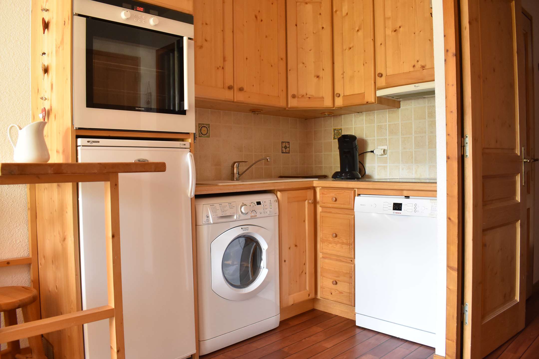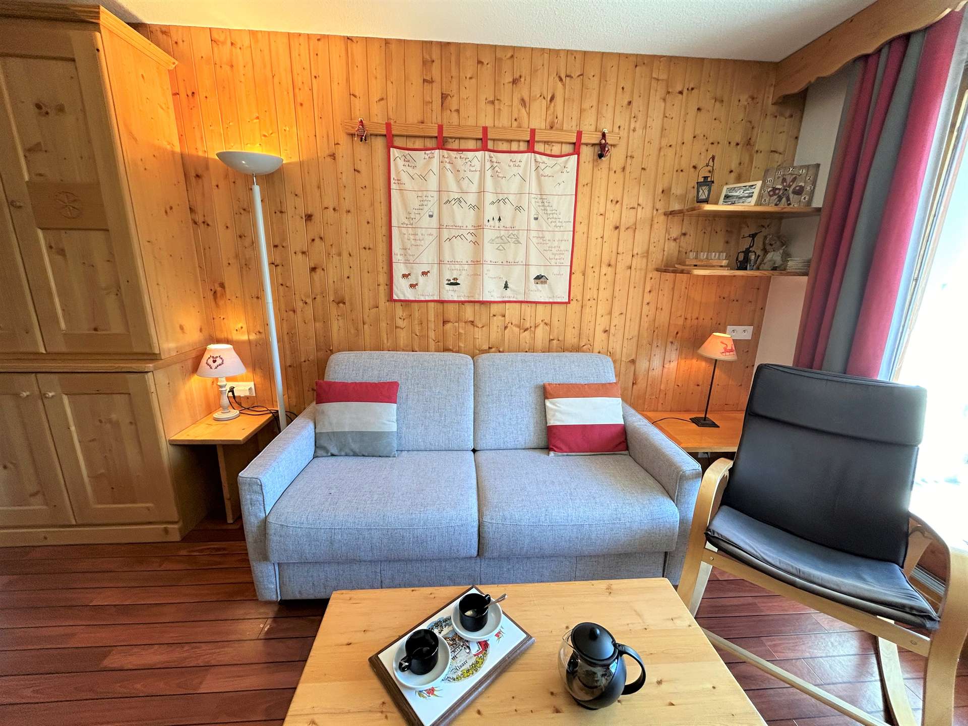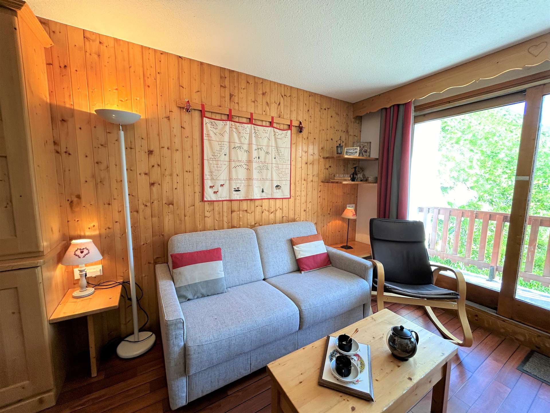 This pretty apartment in the mountains located on the 1st floor of the residence with elevator includes an equipped kitchen with dishwasher, washing machine/dryer, a living room with dining area, a living room with a sofa bed convertible into 140, a television overlooking a south balcony, an entrance with 1 low drop-down bed for 1 person in 80, a bedroom with a bed for 2 people in 140, a bathroom and a separate toilet. A ski locker is at your disposal at the entrance to the residence.