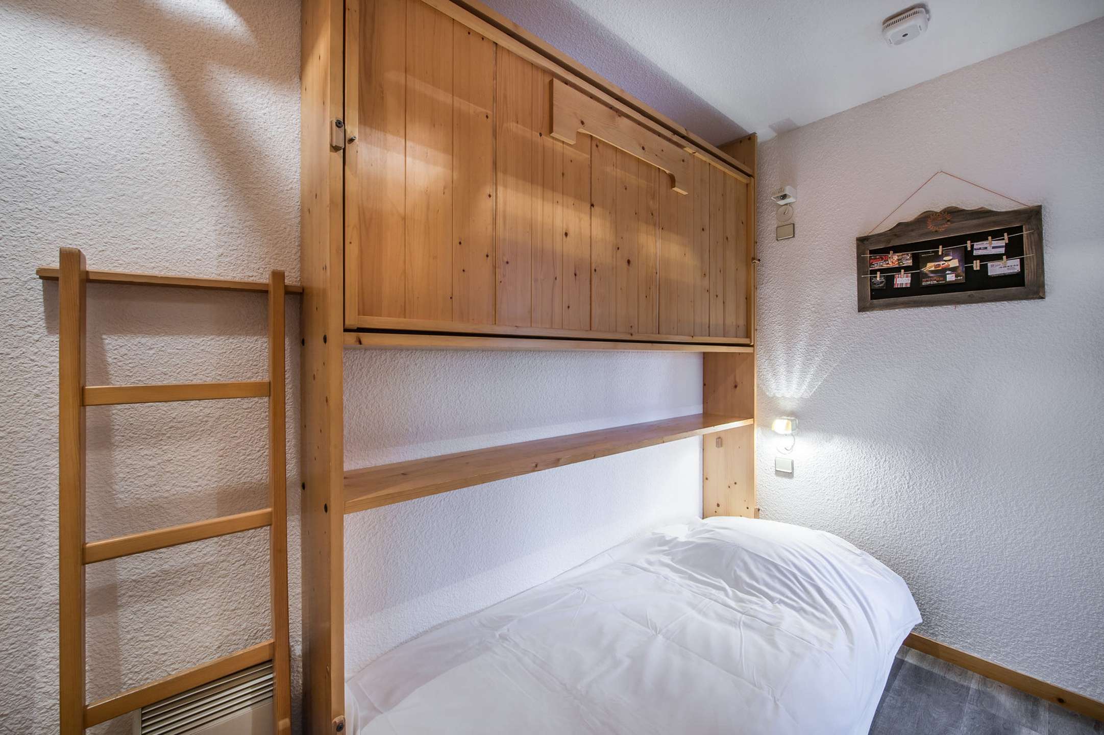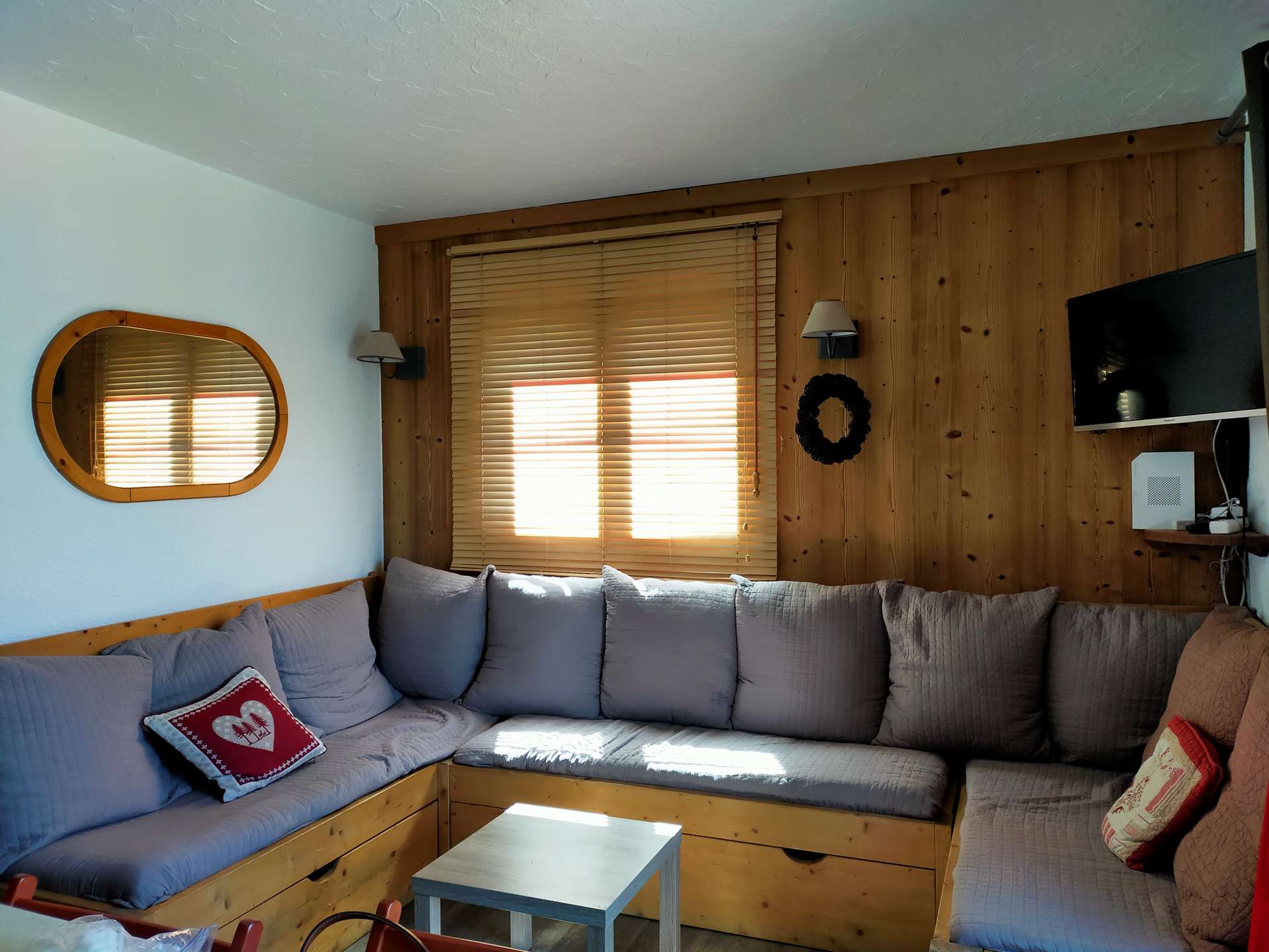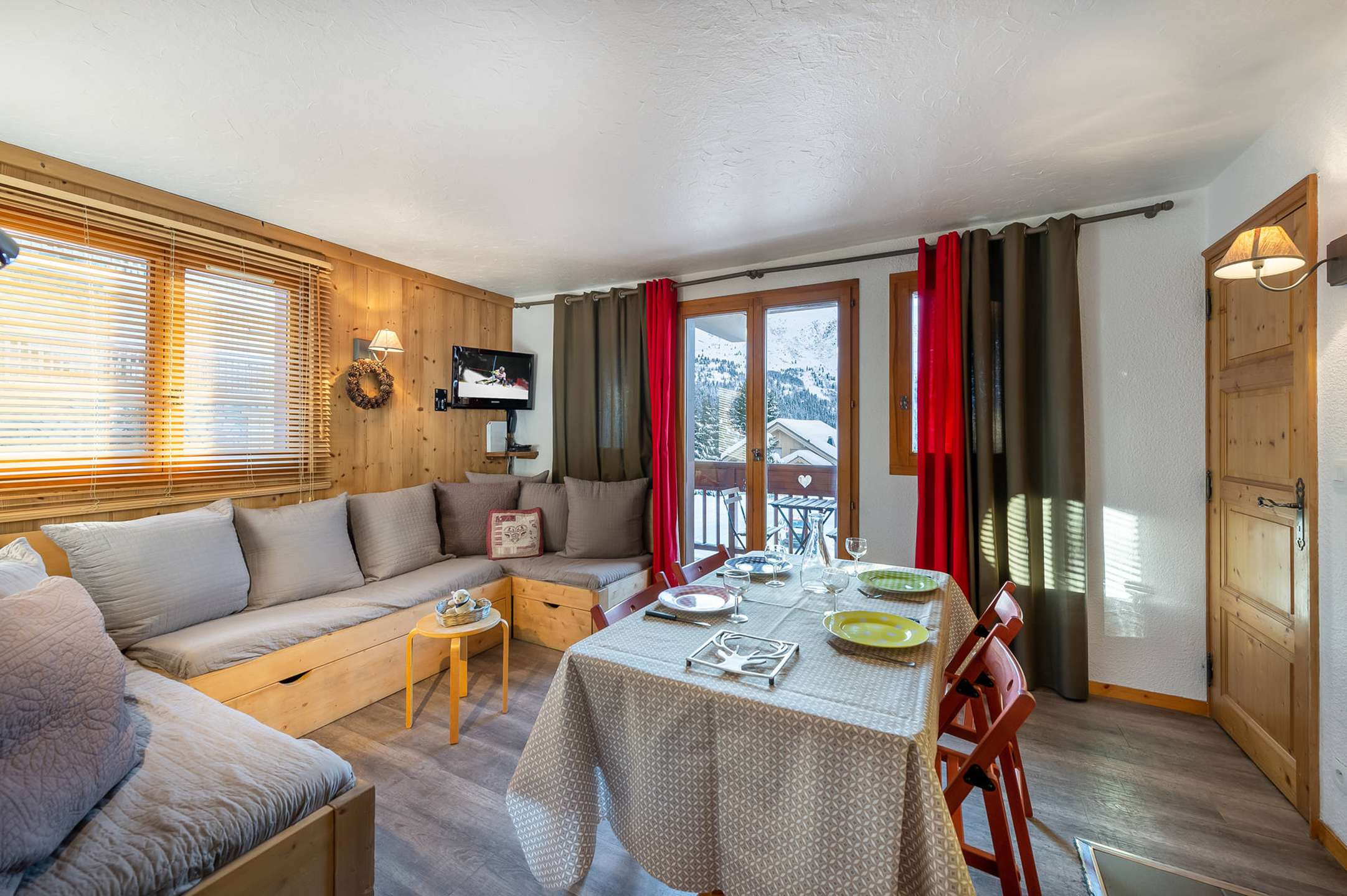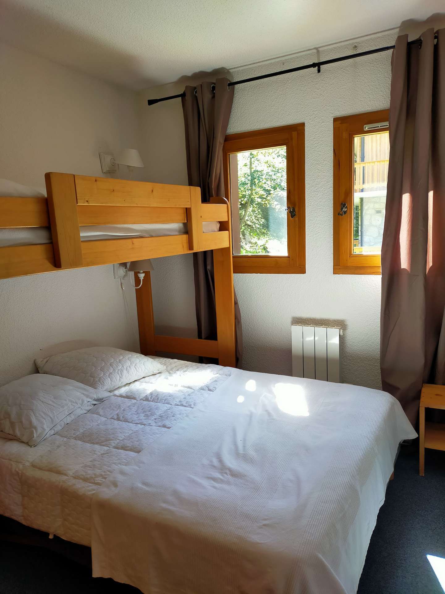 This mountain apartment is located on the 1st floor with an elevator and includes a fully equipped kitchen open to the living room with a dining area and a very welcoming lounge with a TV. This bright and pleasant living space opens onto a west-facing balcony. You will find a bedroom with two single beds (80x190 cm), which can be pushed together, and a small sink area. A second bedroom has a double bed (140 cm) and a raised single bed (80 cm). There is a bathroom with both a bathtub and a shower, as well as a separate toilet.