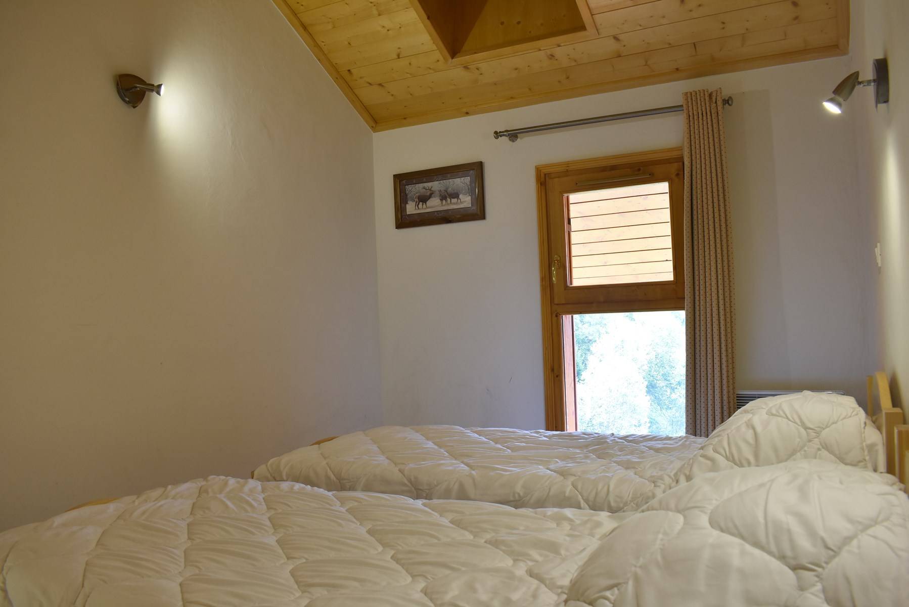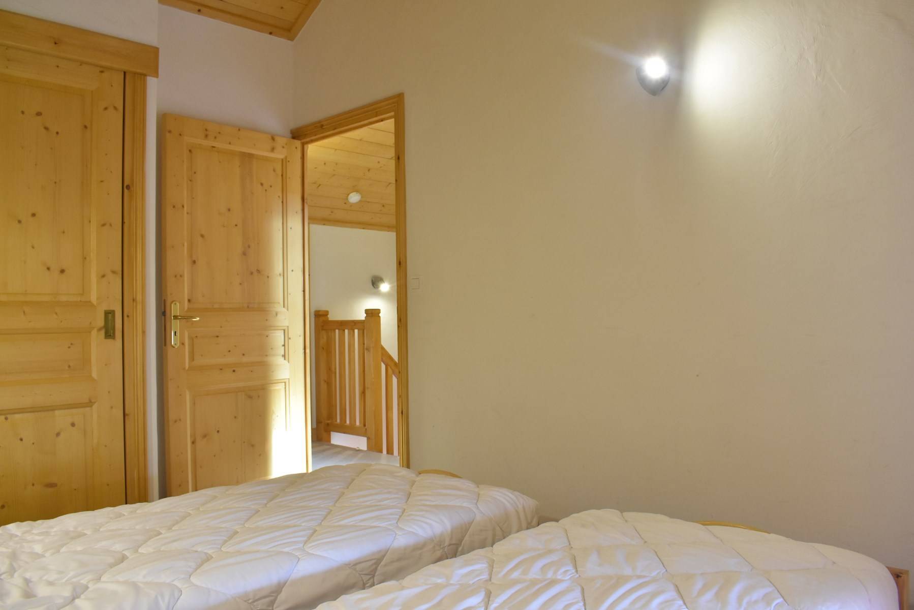Upstairs, you have 2 bedrooms with 2 single beds facing south and 1 bathroom with WC.
