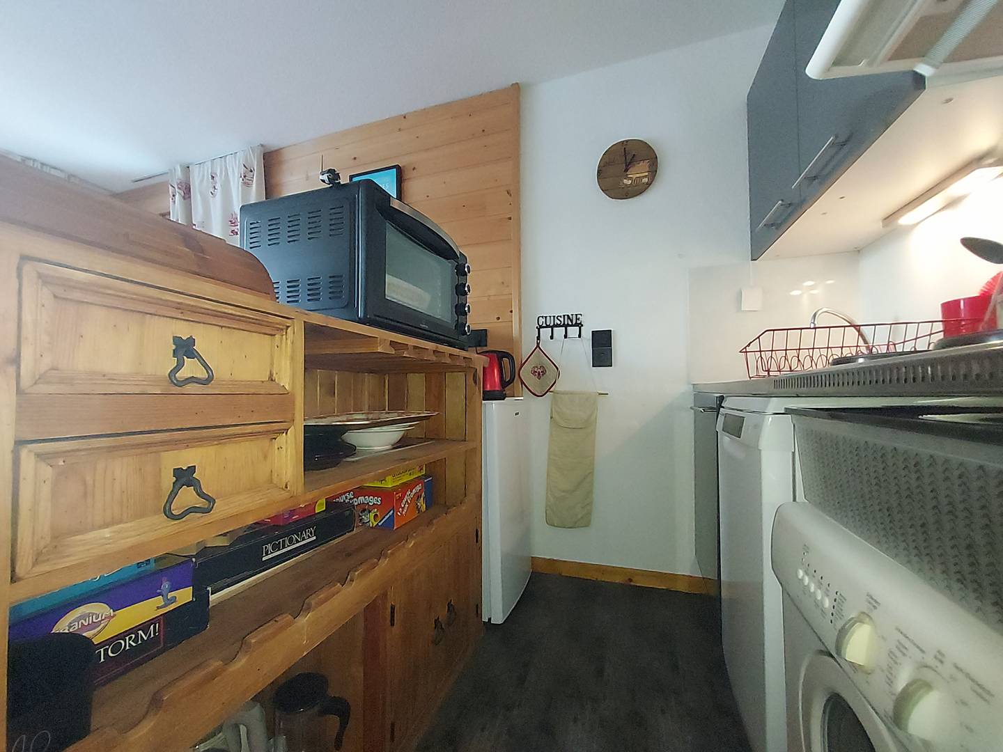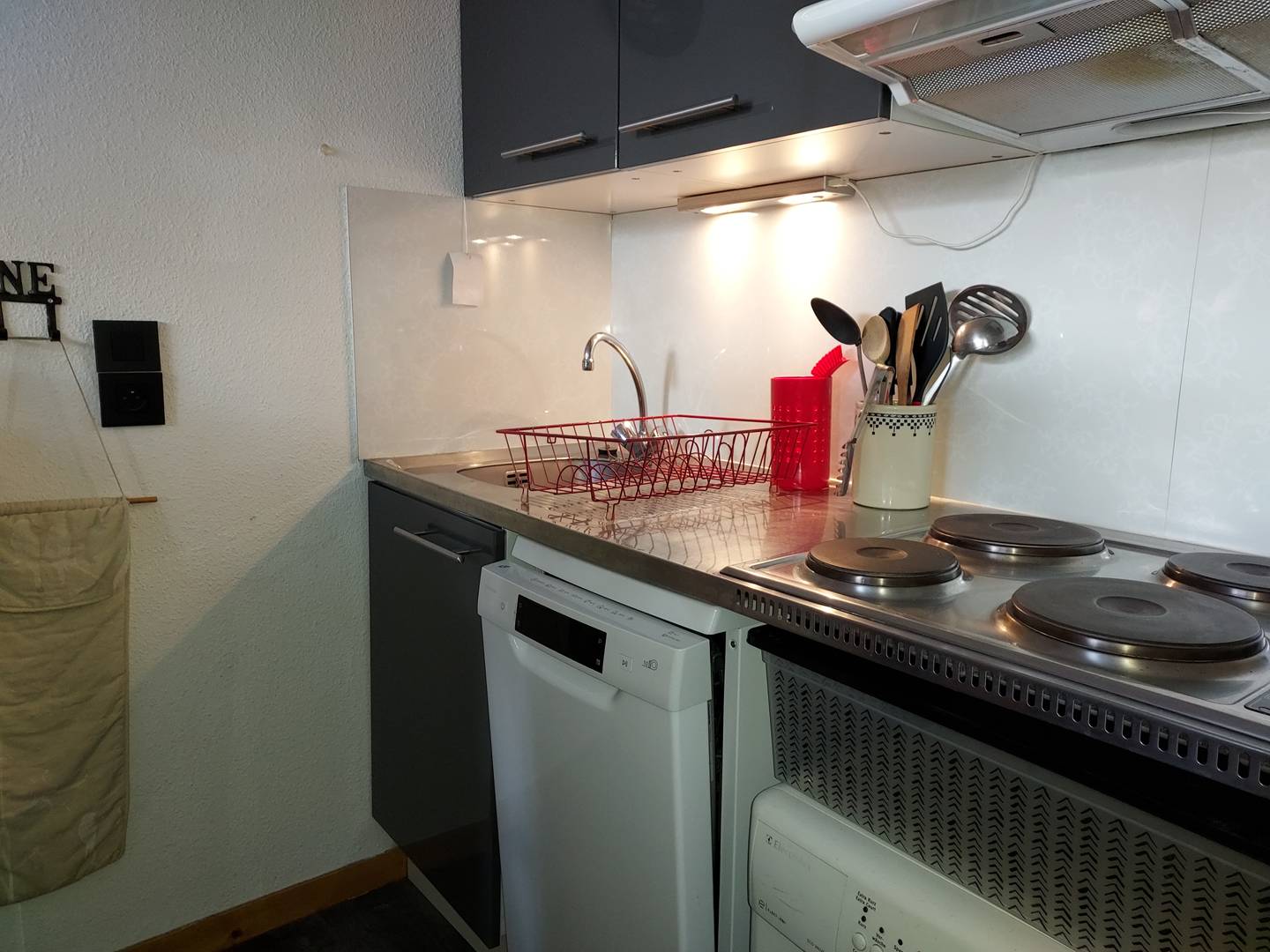 - Open-plan kitchen equipped with 4 electric hobs, washing machine, microwave and mini-oven, refrigerator, and dishwasher.