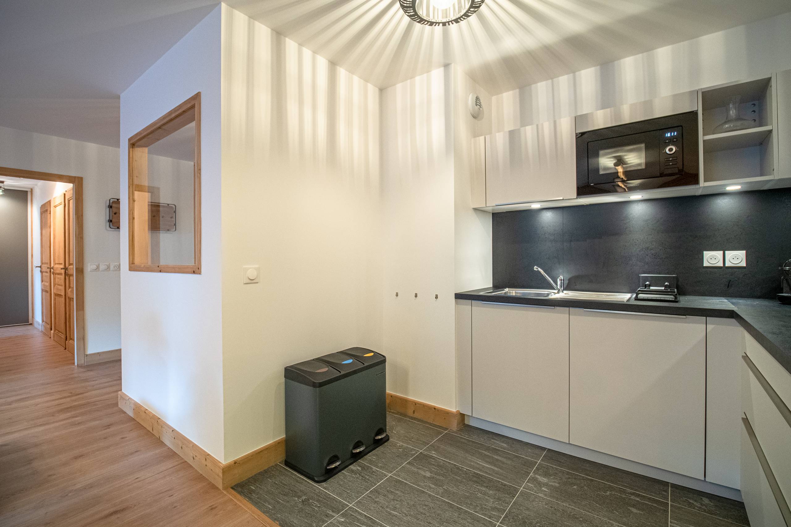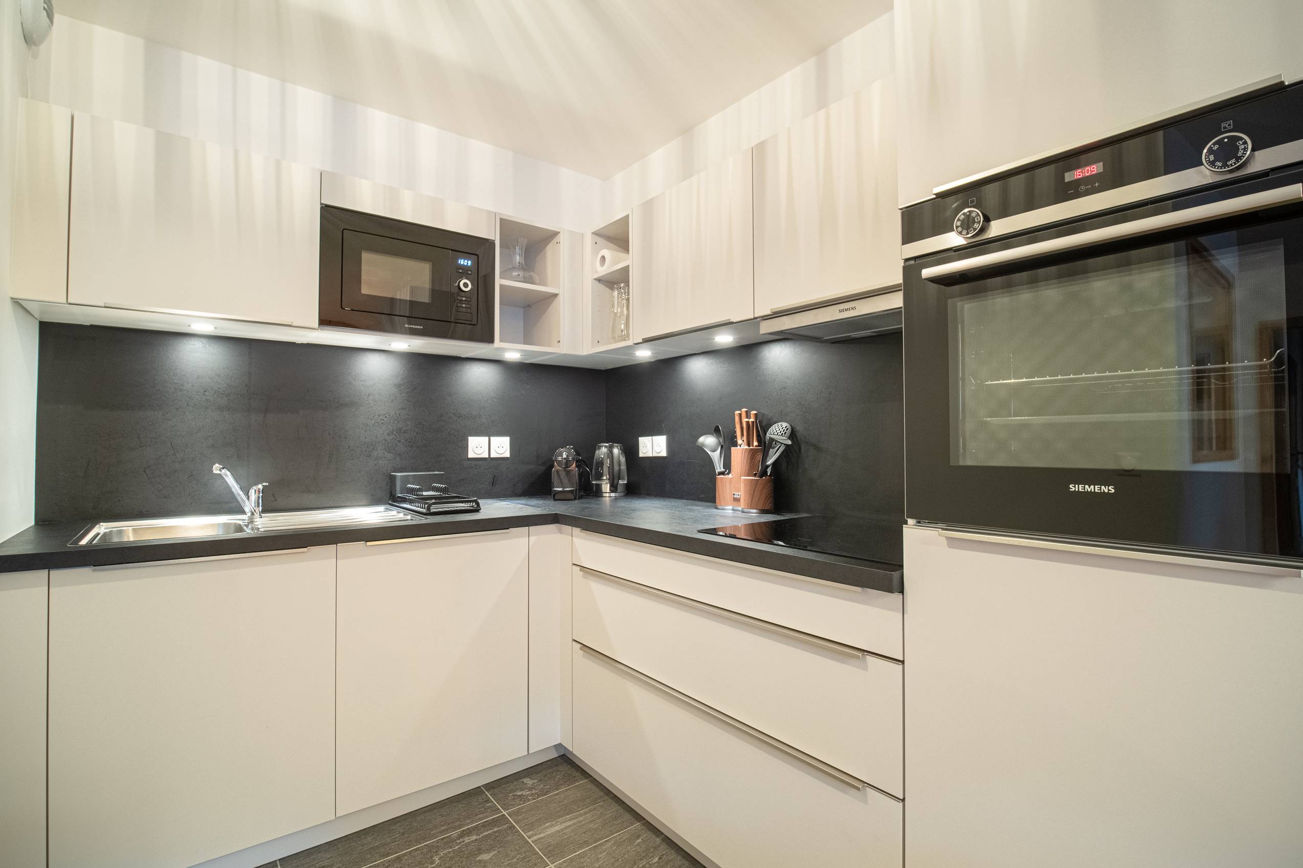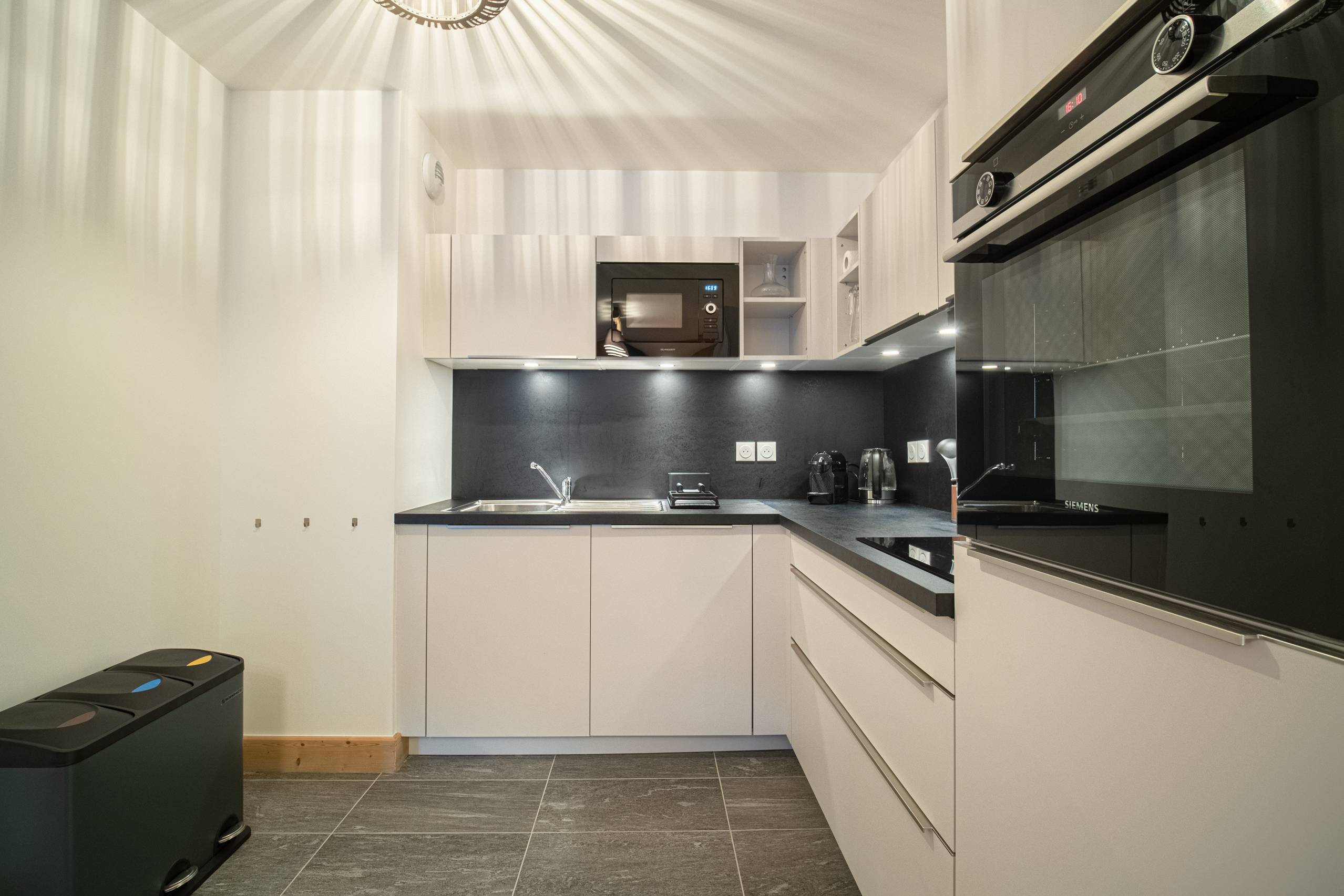 - Kitchen open to the living room, perfectly equipped with dishwasher, induction cooker, traditional oven, microwave, refrigerator with freezer, Nespresso coffee machine, electric kettle, toaster, raclette machine.