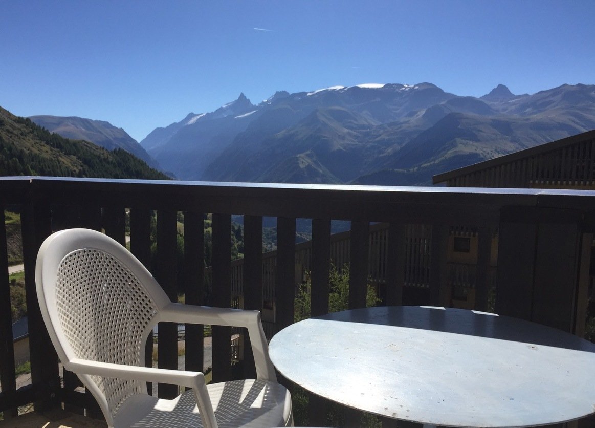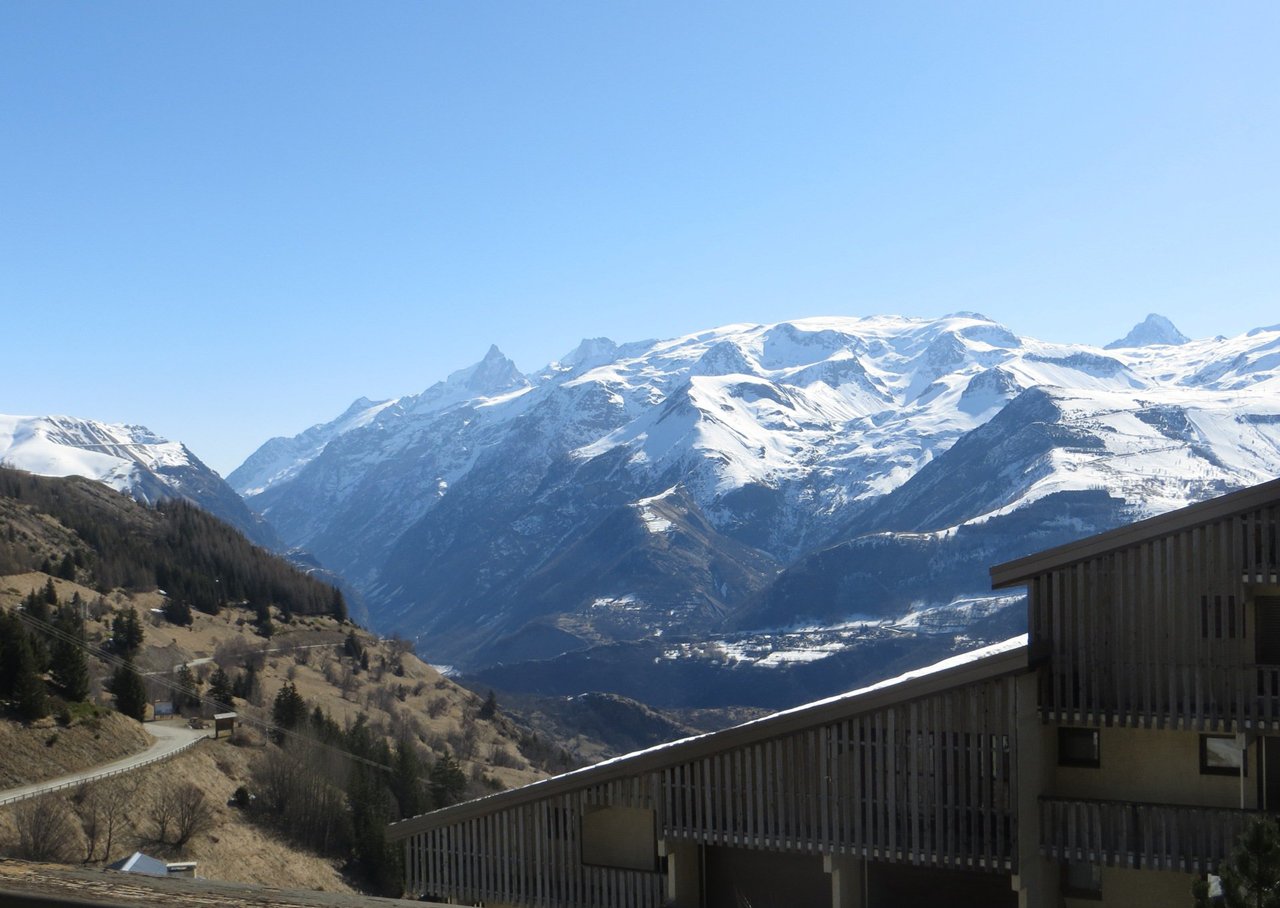 Chaleureux petit studio dans une résidence skis aux pieds. Le Balcon avec un mobilier de jardin offre une vue dégagée plein sud sur le massif des Ecrins.