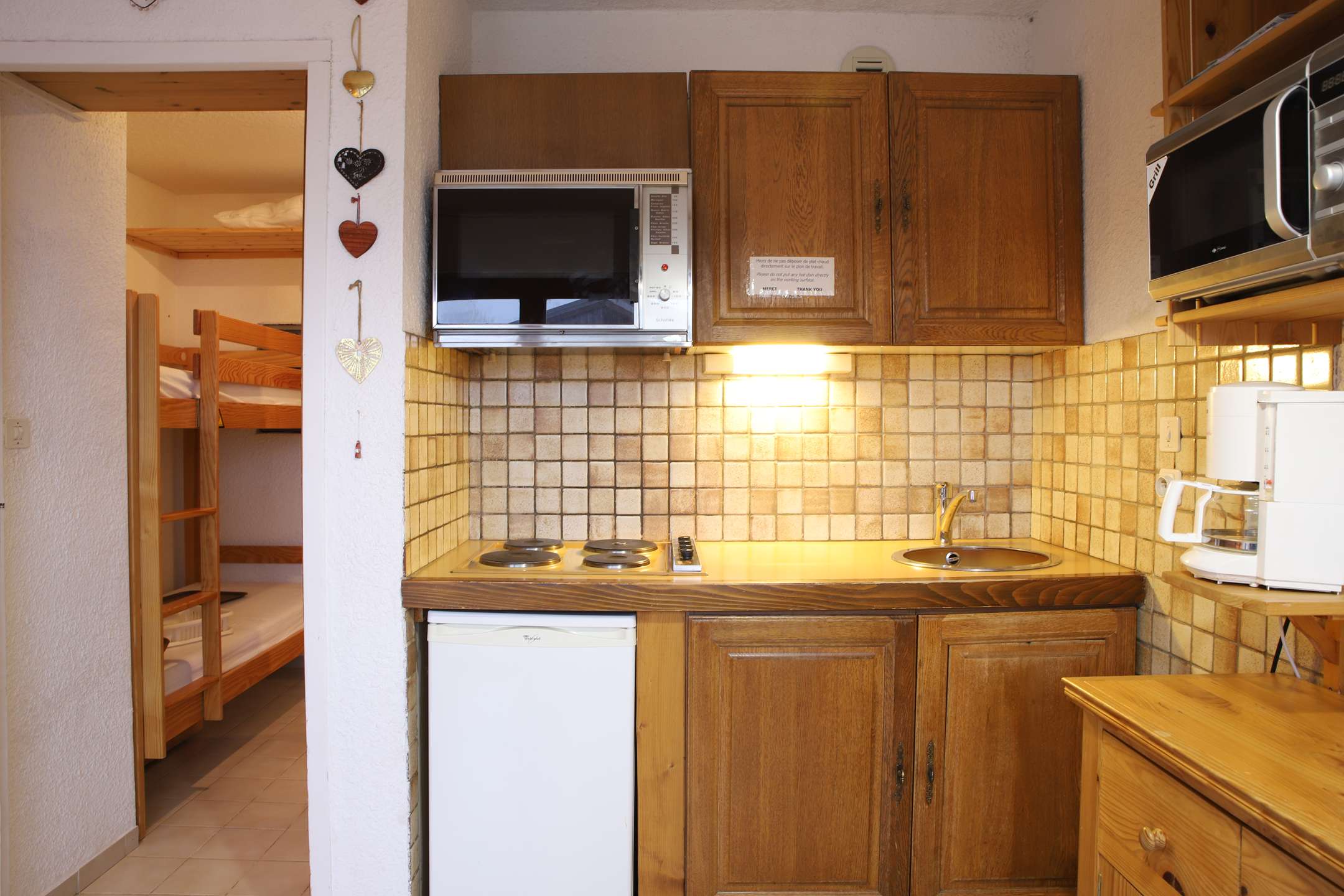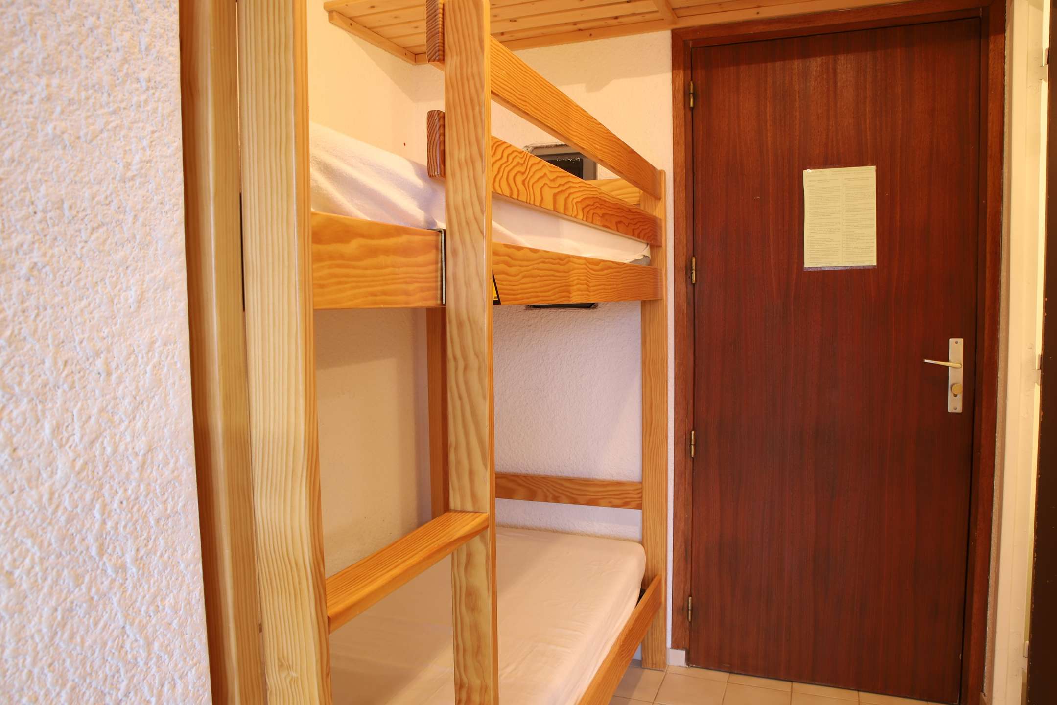 Il est composé d'un séjour avec un canapé convertible gigogne ( 2 personnes), d'un coin cuisine équipé, d'un coin cabine ouvert dans le couloir de l'entrée avec un lit superposé ( 2 lits 1 personne), d'une salle de bain munie d'une douche, entièrement rénovée .