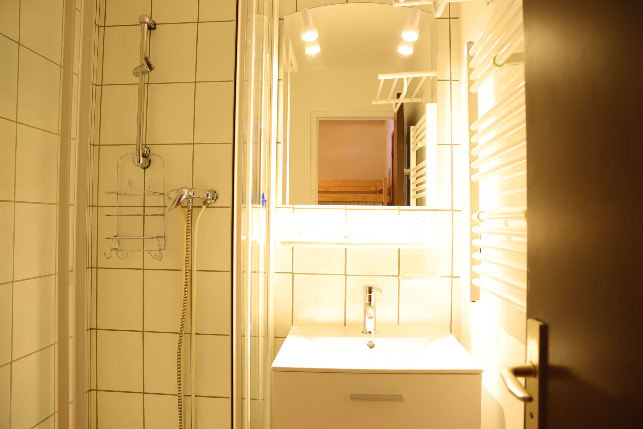 Il est composé d'un séjour avec un canapé convertible gigogne ( 2 personnes) , d'un coin cuisine entièrement équipé, d'un coin cabine ouvert dans le couloir de l'entrée avec 1 lit superposé ( 2 lits 1 personne) et d'une salle de bain avec une douche et des toilettes. Appartement classé meublé de tourisme 2 étoiles