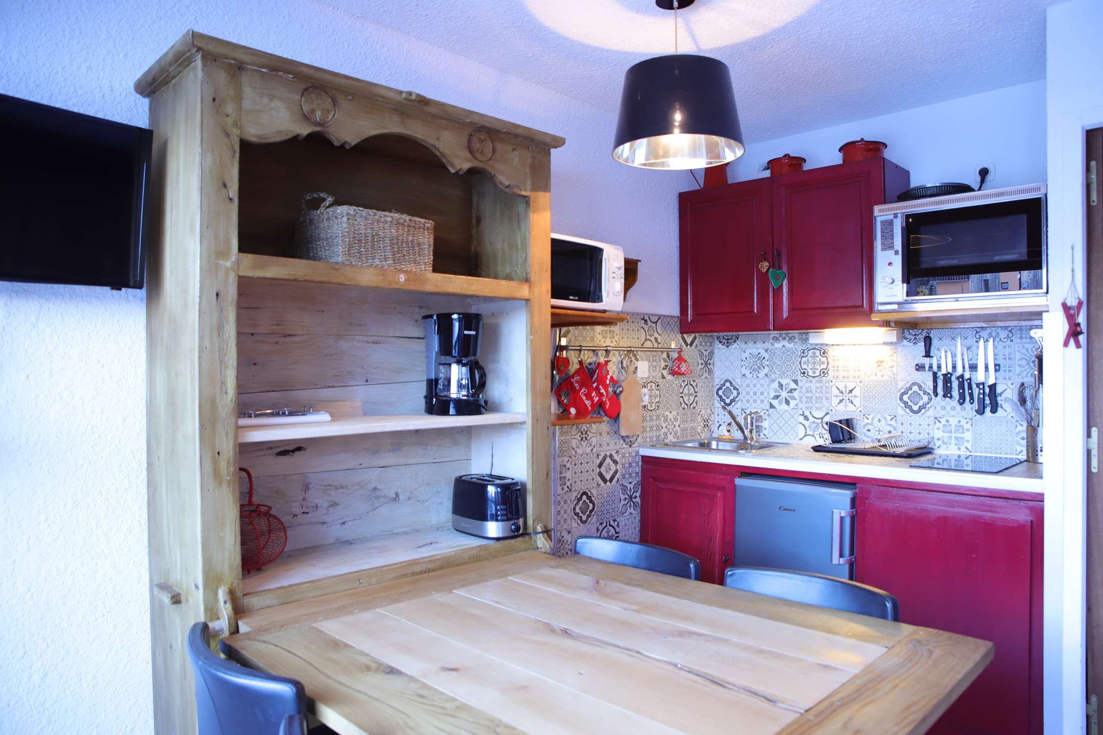 Coquet studio cabine, bien rénové. Son balcon suspendu donne une vue dégagée sur la place et les pistes.