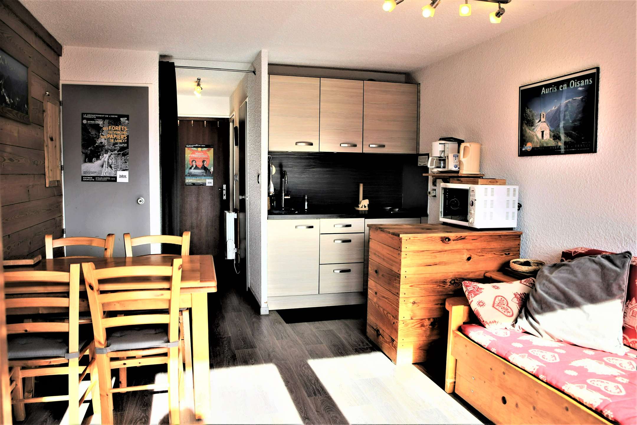 Chaleureux studio style montagne, tout confort, très bien équipé. Le balcon sud-est est muni d'un salon de jardin et offre vue magnifique sur les sommets des Ecrins