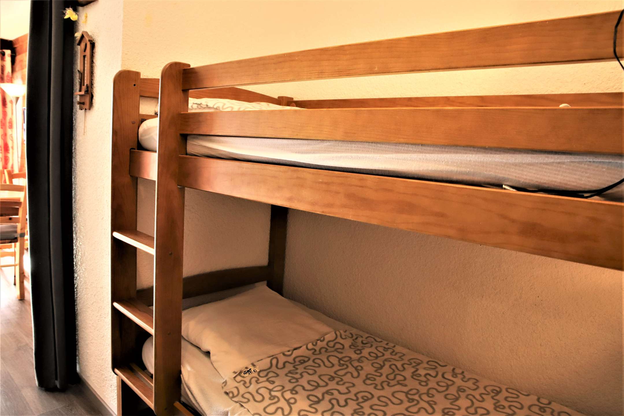 Il est composé d'un séjour avec un canapé convertible gigogne (2 personnes), d'un coin cuisine équipé, d'un coin cabine dans le couloir de l'entrée avec un lit superposé (2 lits 1 personne), d'une salle de bain douche et des WC séparés