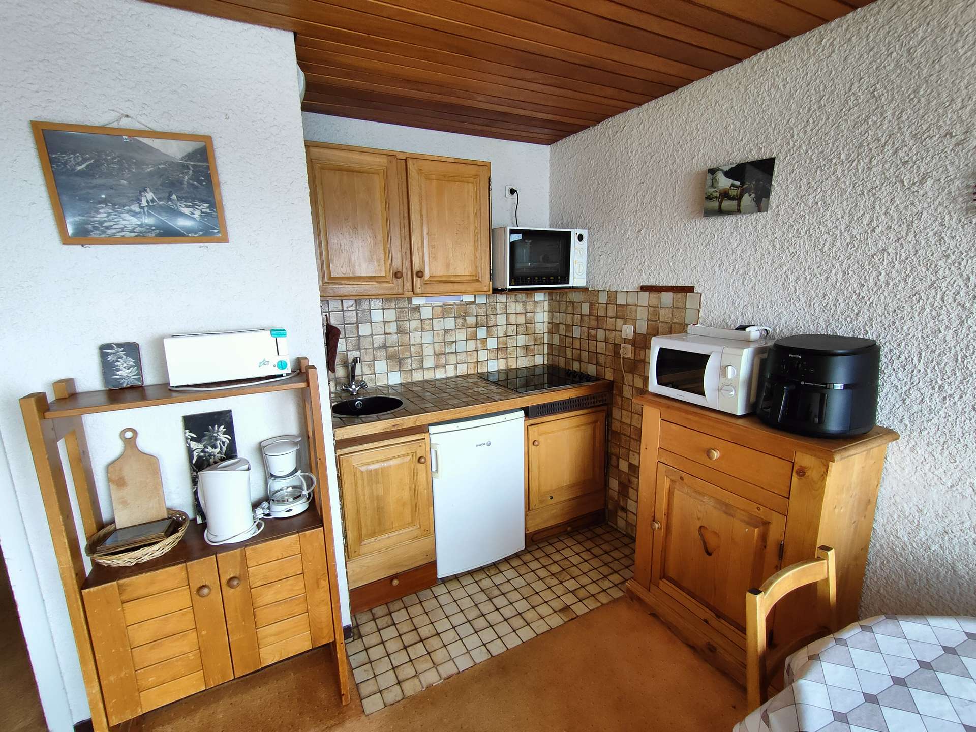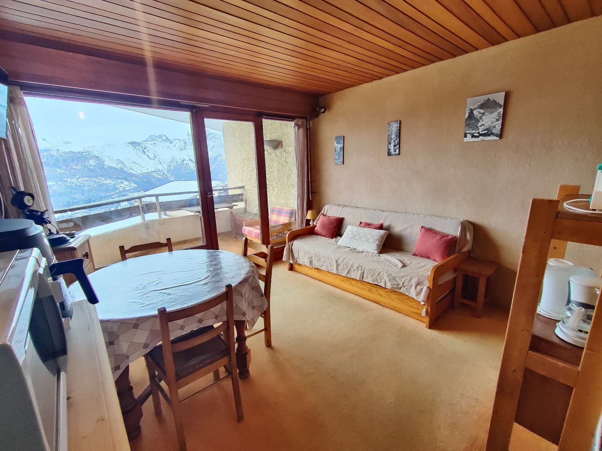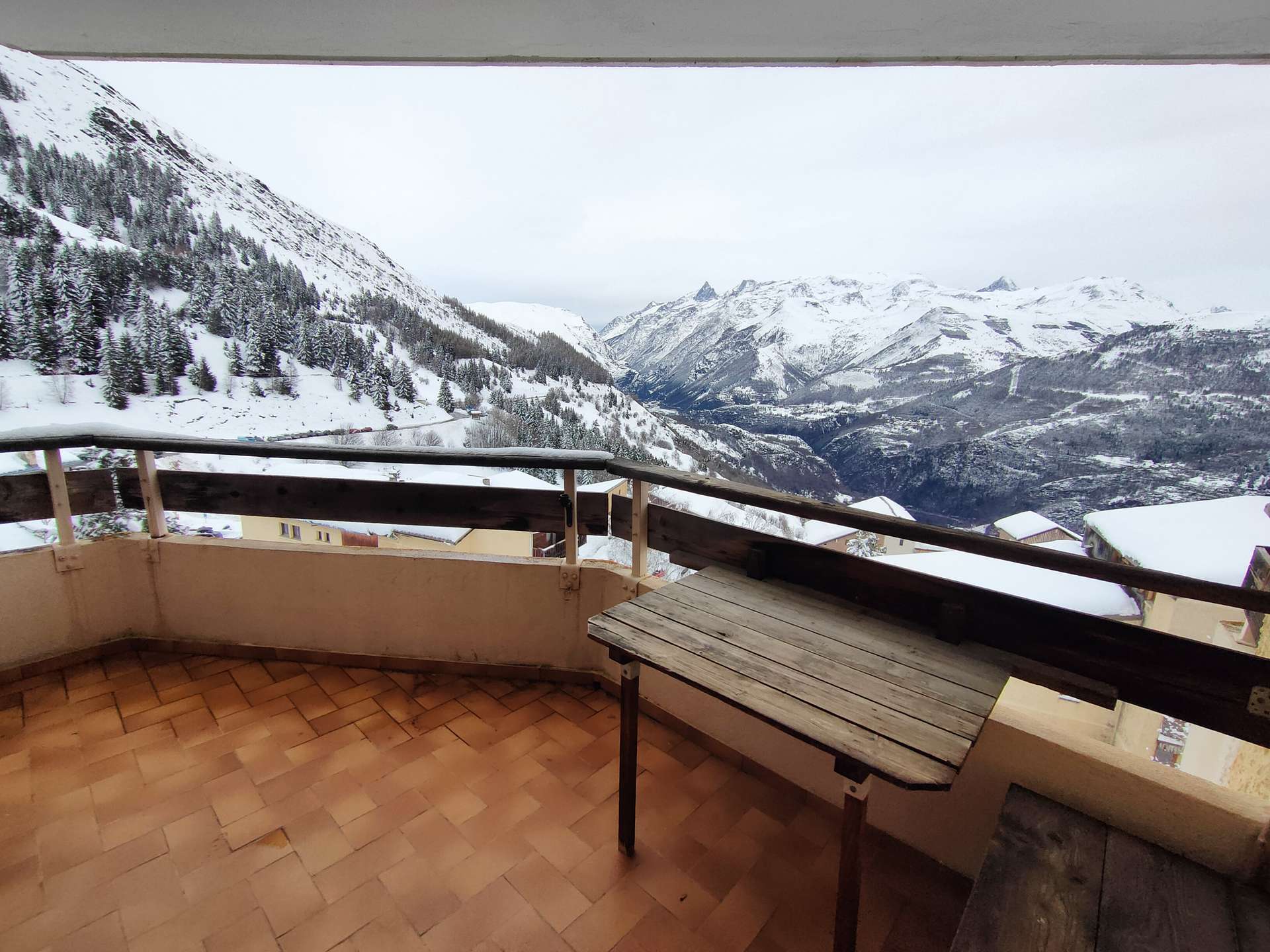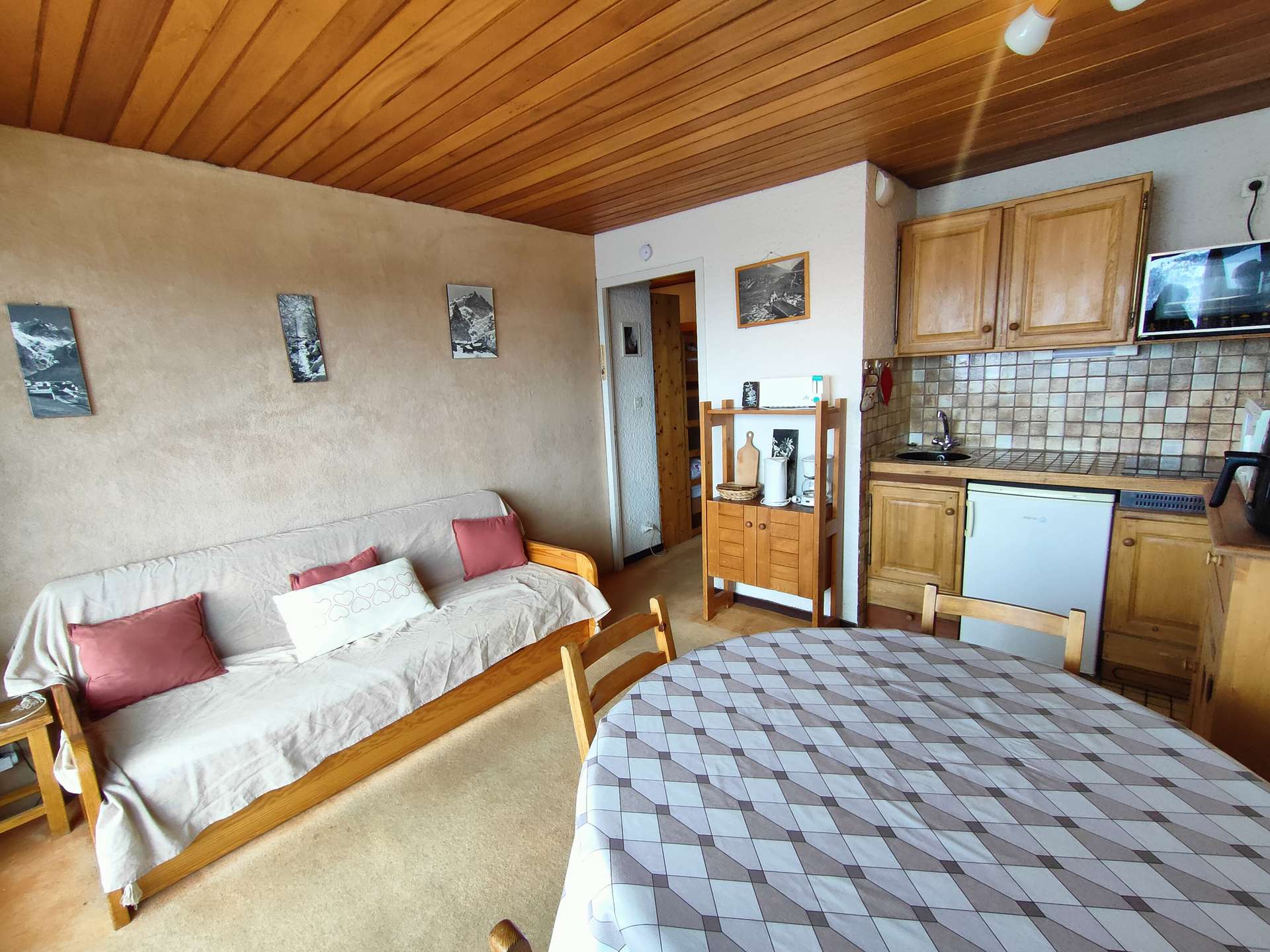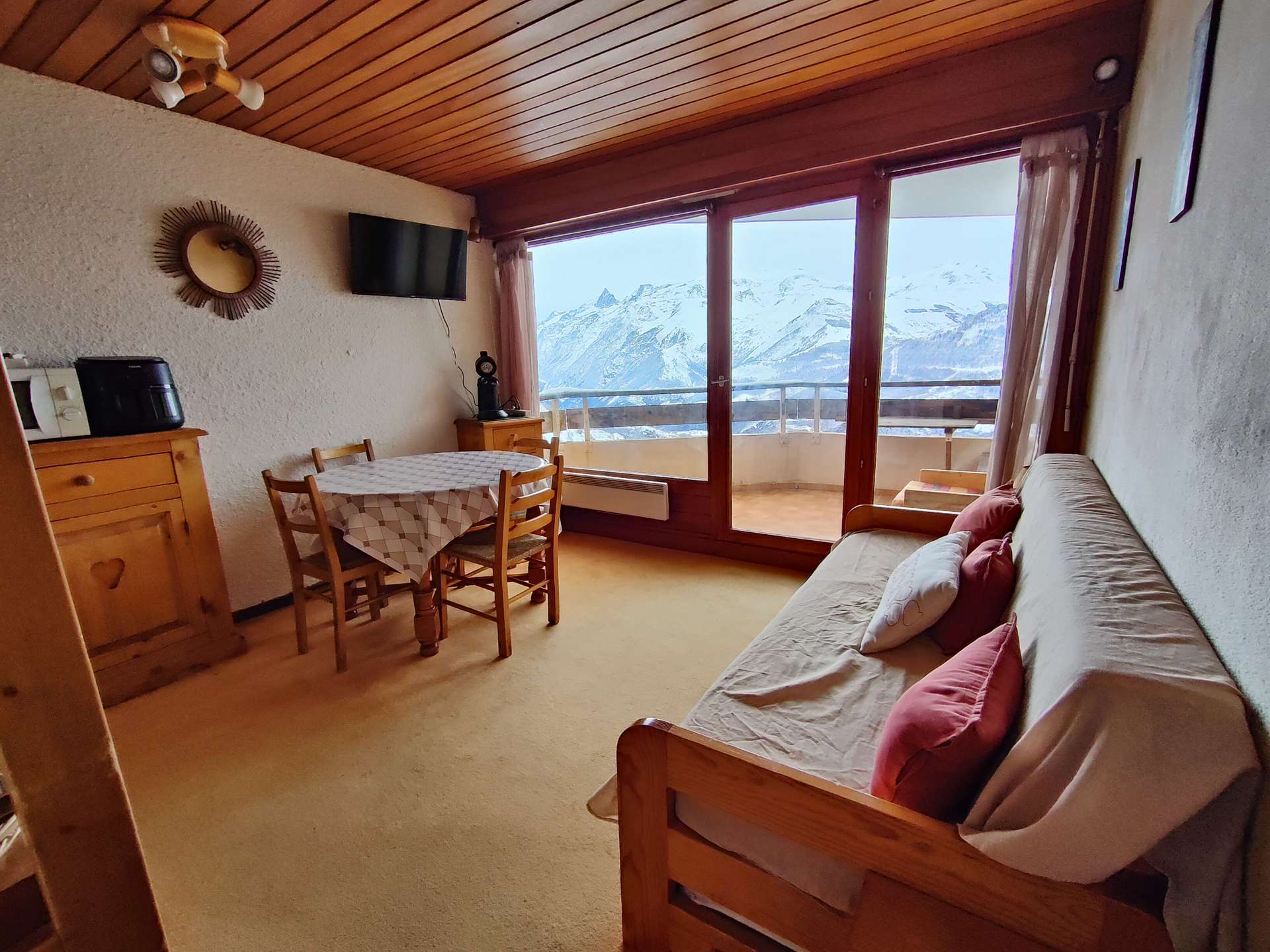 Studio cabine au pied des pistes et des commerces disposant d'un balcon sud-est avec une vue magnifique sur les 2 Alpes et le glacier de la Meije.
