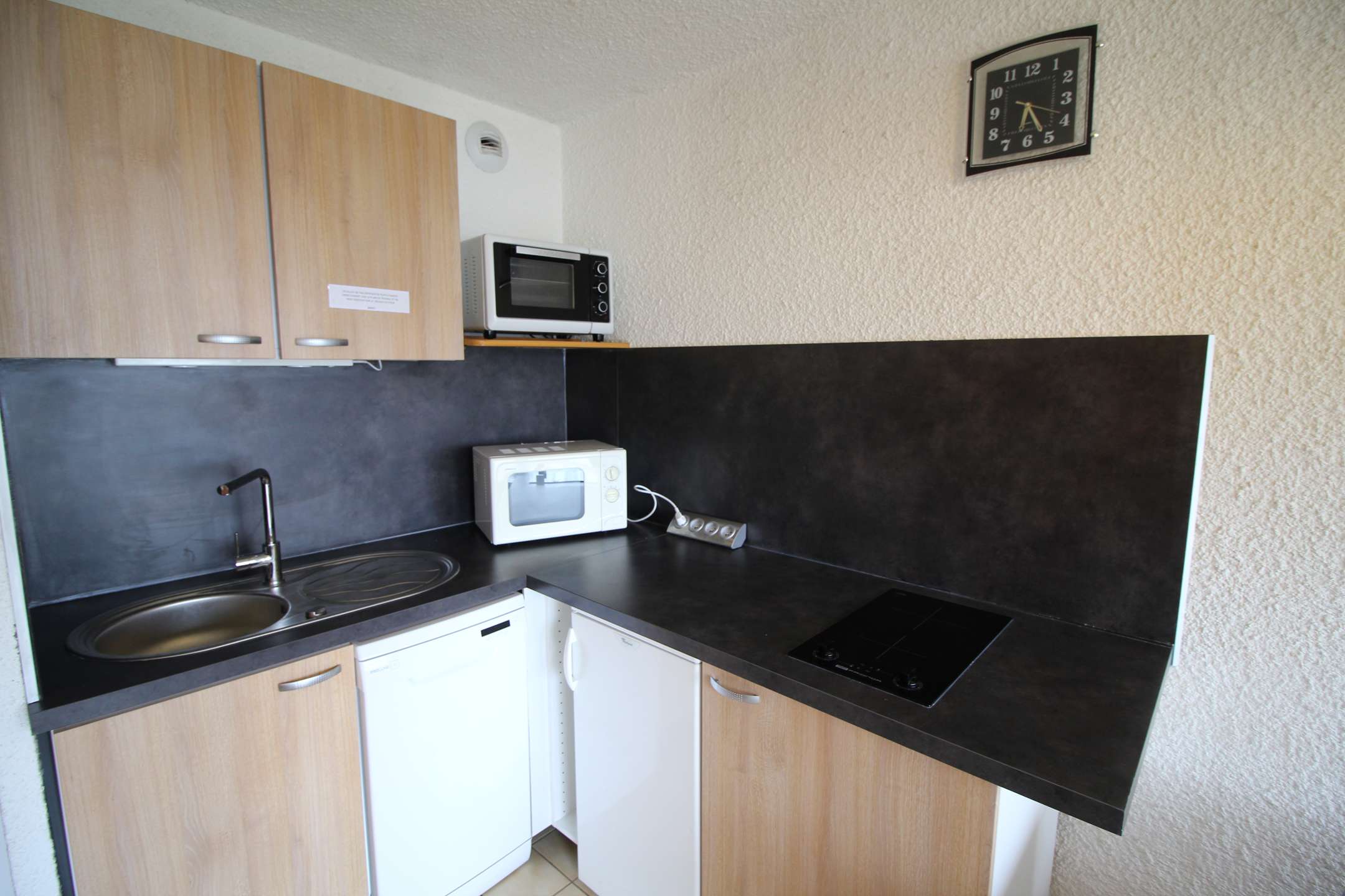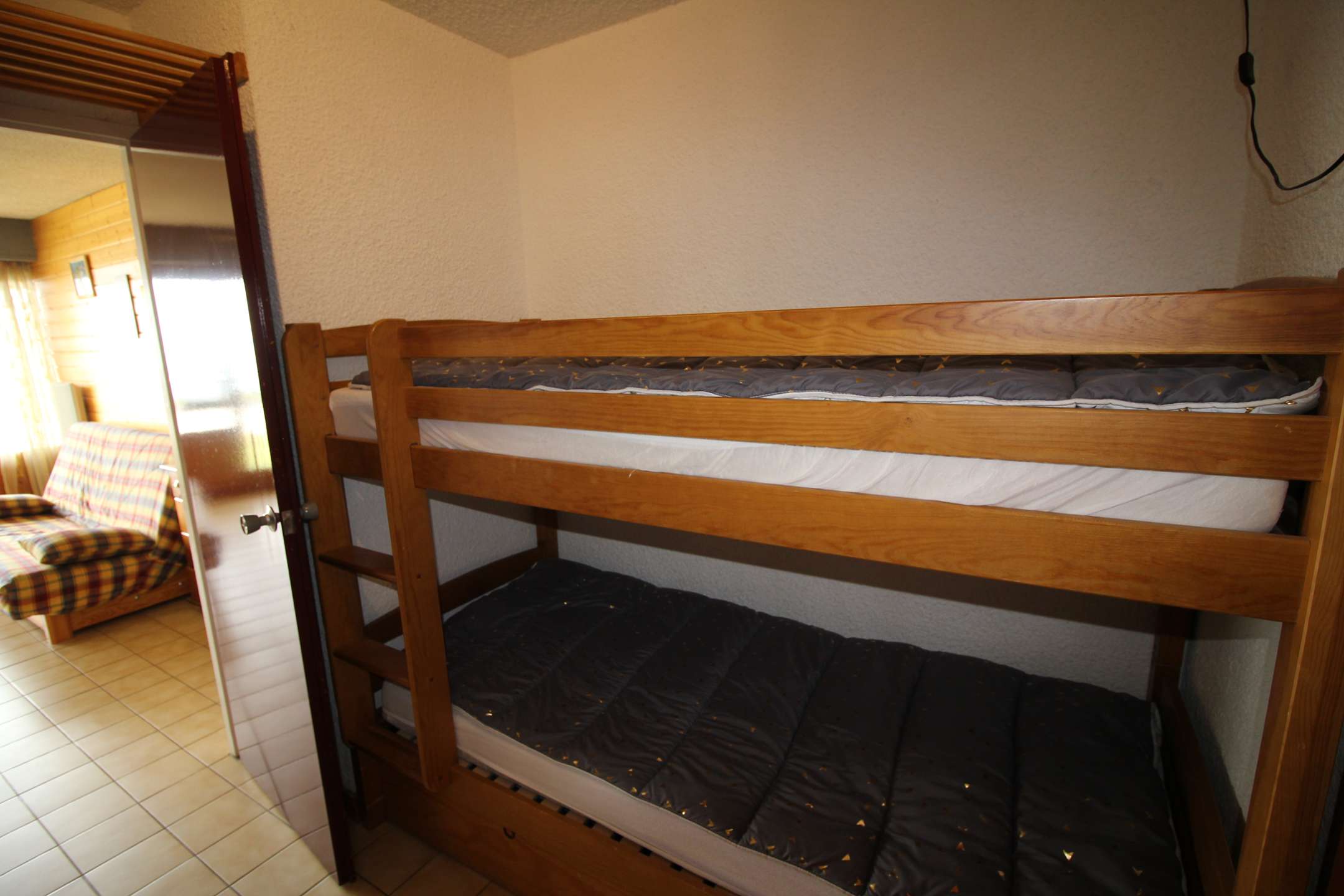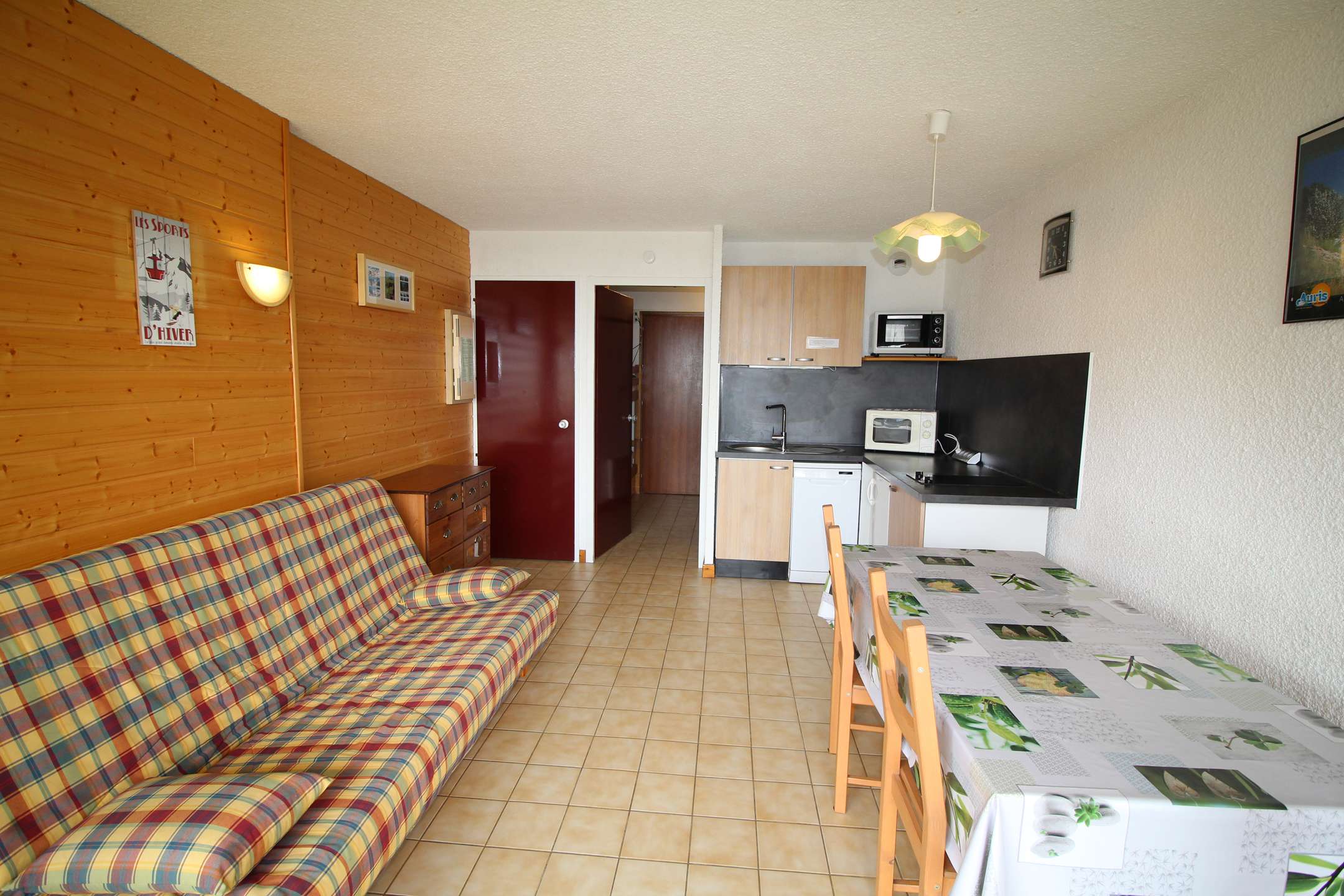 Il est composé d'un séjour avec un canapé convertible Clic Clac ( 2 personnes), d'un coin cuisine équipé, d'un coin cabine ouvert dans le couloir de l'entrée (2 lits 1 personne) et d'une salle de bain avec baignoire et WC séparé
