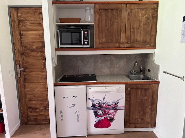 - un coin cuisine composé de 1 four mixte, 1 lave vaisselle, 3 plaques vitrocéramique, 1 réfrigérateur, bouilloire électrique, cafetière Senseo, appareil à raclette