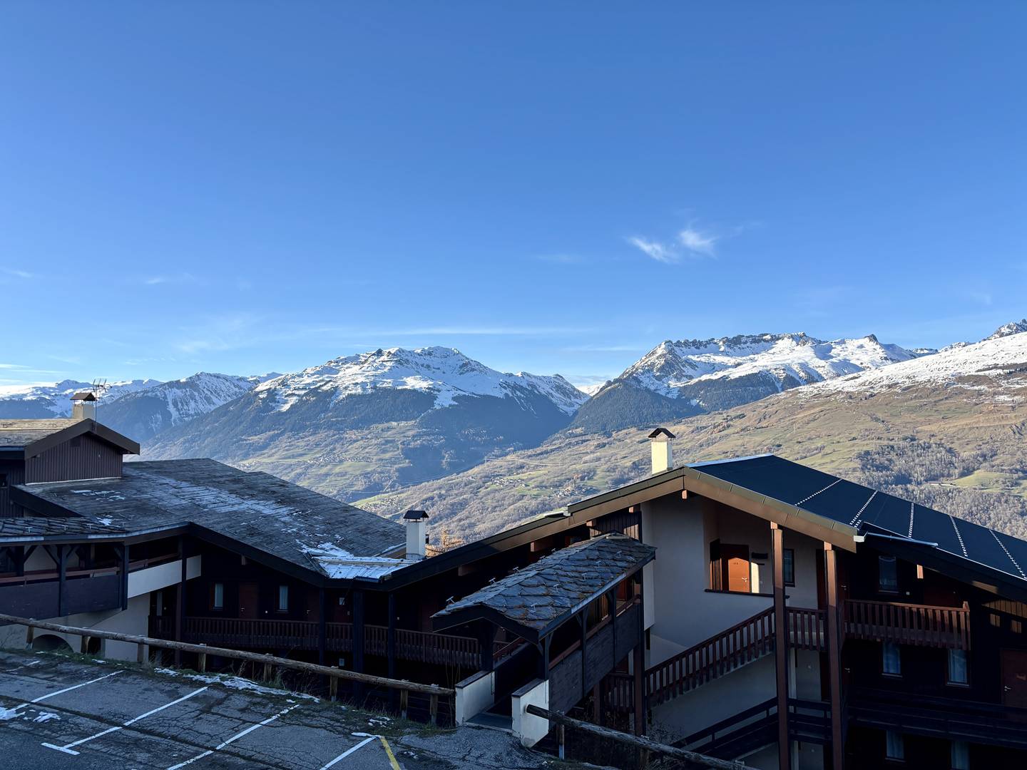 Un Balcon exposé nord-ouest avec vue sur le Mont-Blanc. Le casier a ski est dans la résidence.