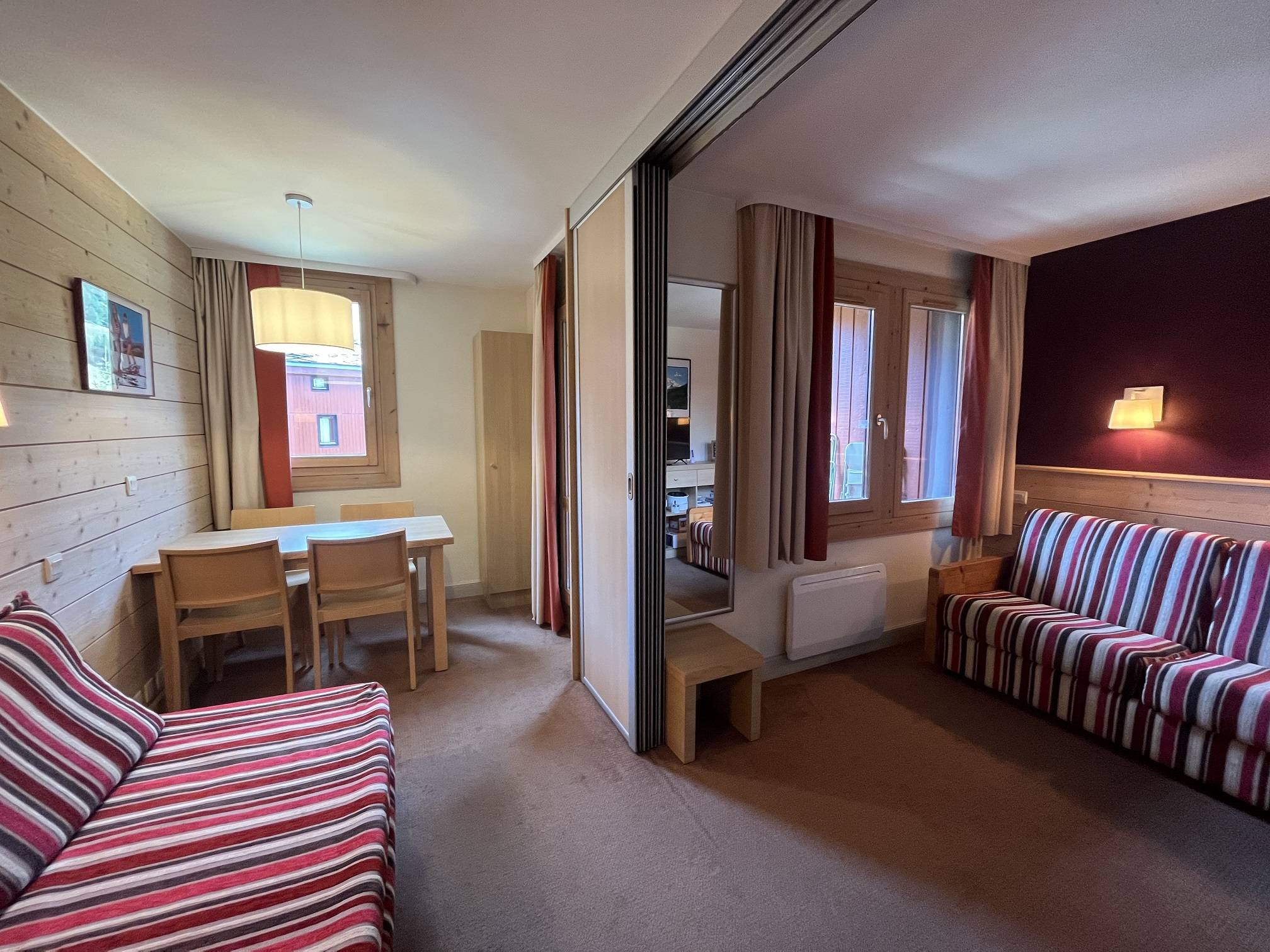 Le séjour, séparé en deux espaces par une cloison coulissante, est équipé d'un canapé lit convertible (140*200), d'un lit simple (90*190) et d'un lit gigogne (80*190). Il dispose d'un téléviseur.