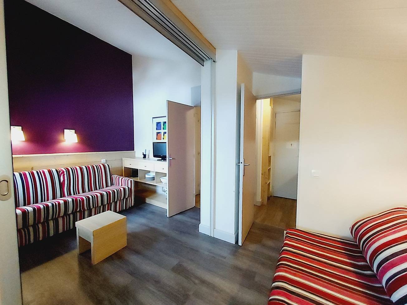 Le séjour, séparé en deux espaces par une cloison coulissante, est équipé d'un canapé lit convertible (140*200), d'un lit simple (90*190) et d'un lit gigogne (80*190). Il dispose d'un téléviseur.