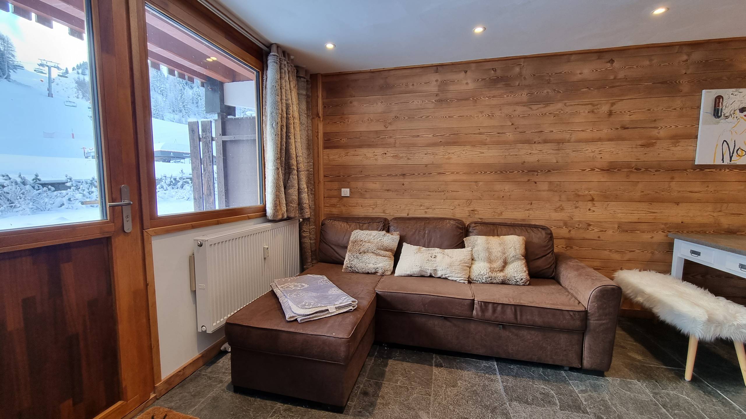 - Le séjour spacieux et très lumineux dispose d'un coin salon avec canapé convertible, fauteuil BZ et téléviseur, et d'un coin repas