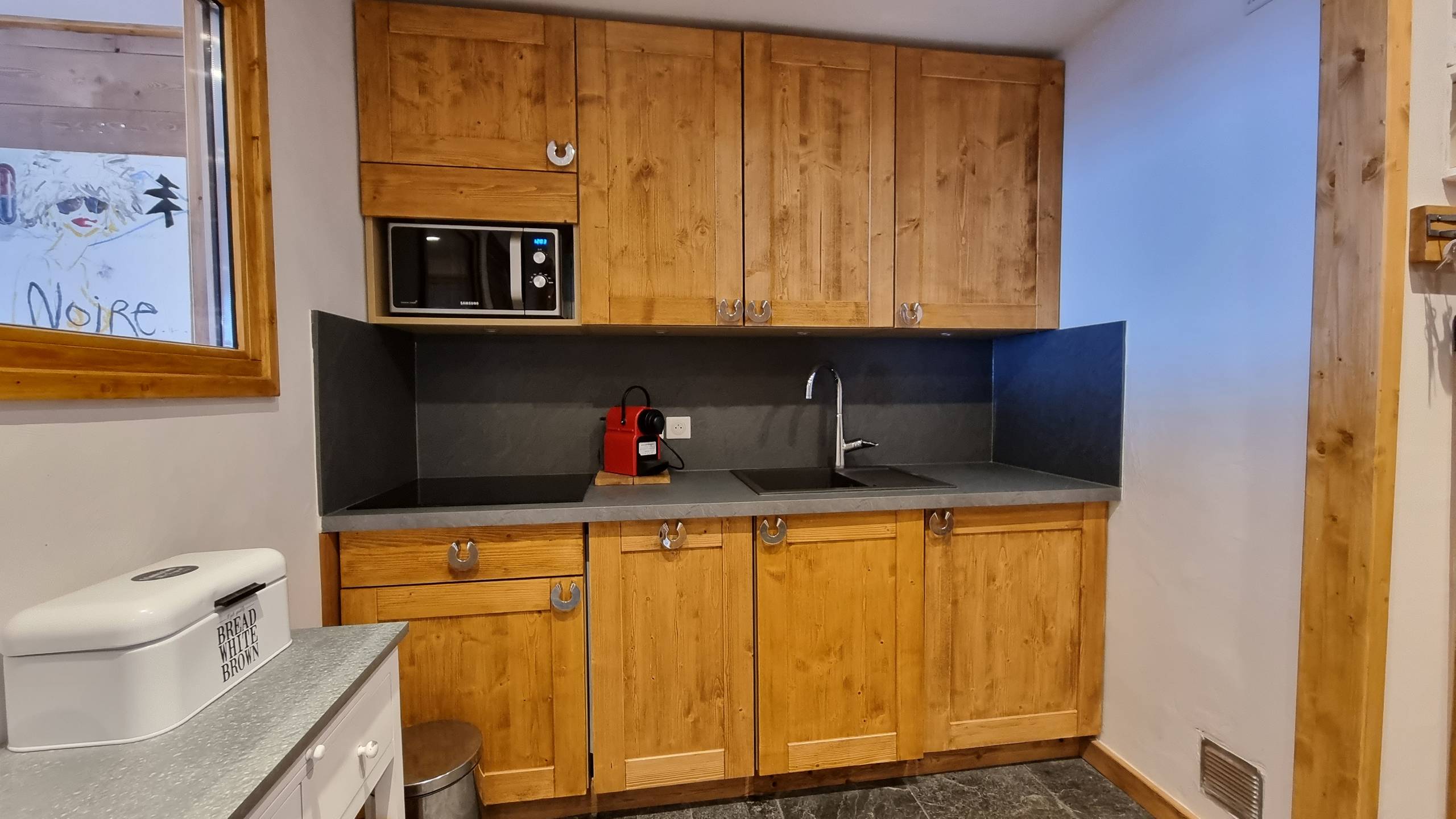 - La cuisine, séparée, offre de nombreux rangements, et est entièrement équipée avec lave-vaisselle, lave-linge, plaques de cuisson, micro-onde, réfrigérateur, cafetière et bouilloire électrique