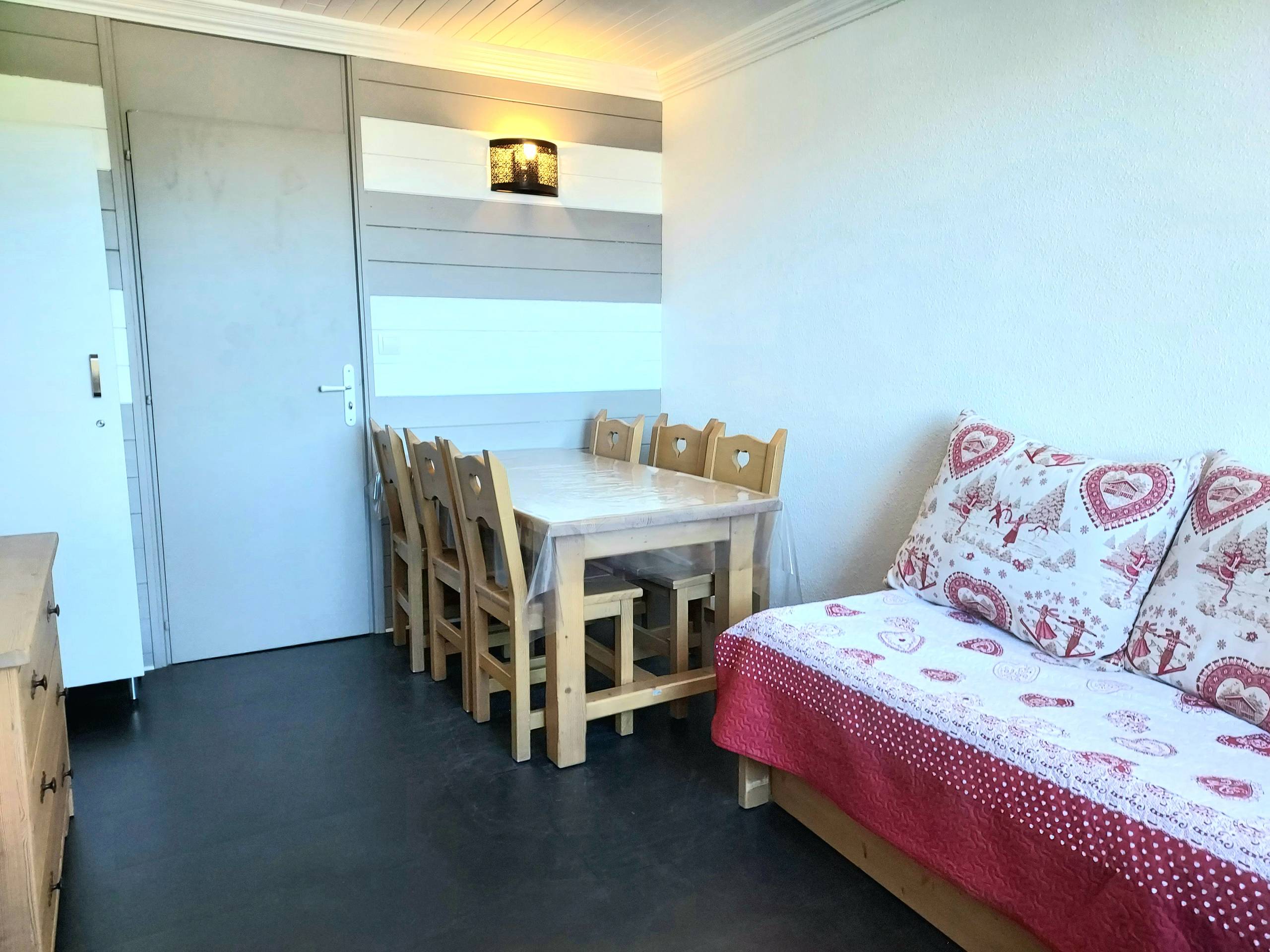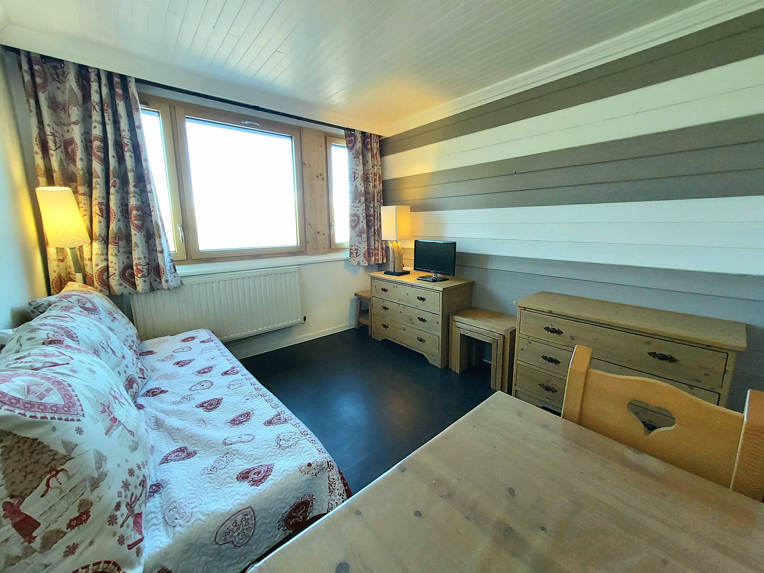 - Séjour avec téléviseur, un lit simple, un lit gigogne et coin repas.