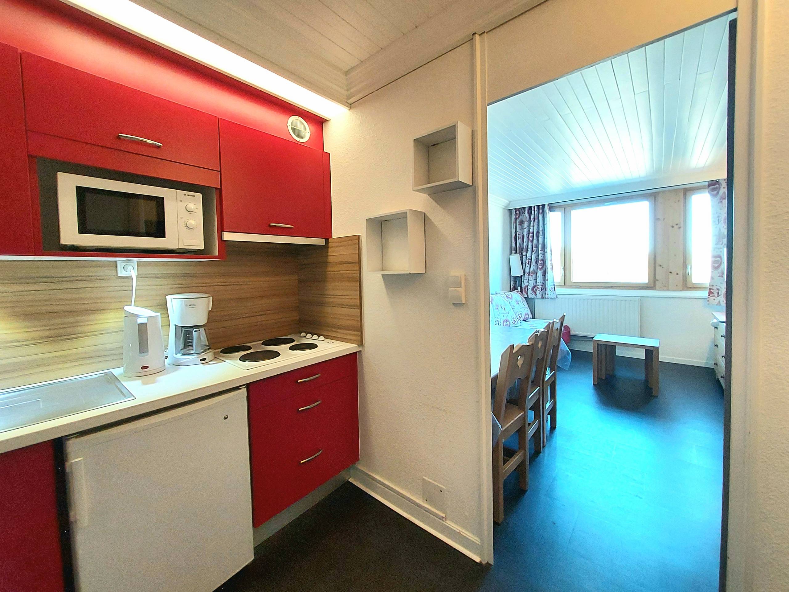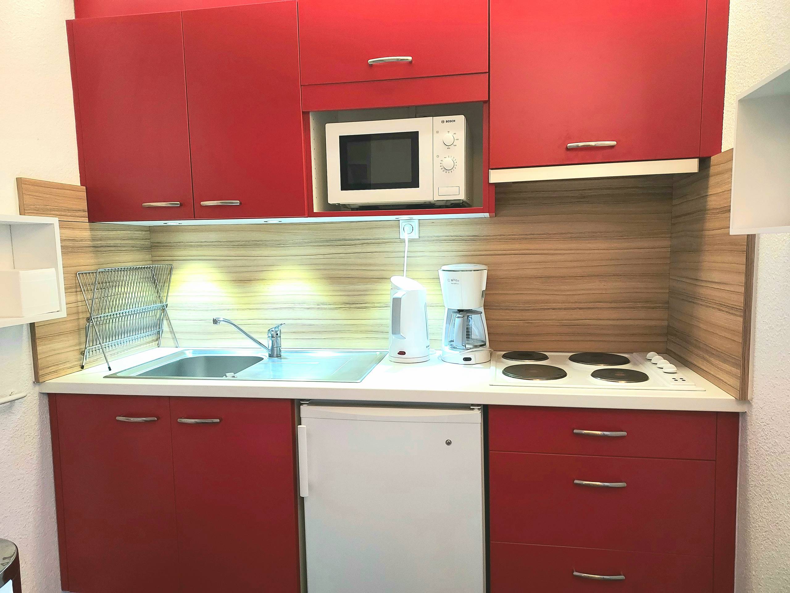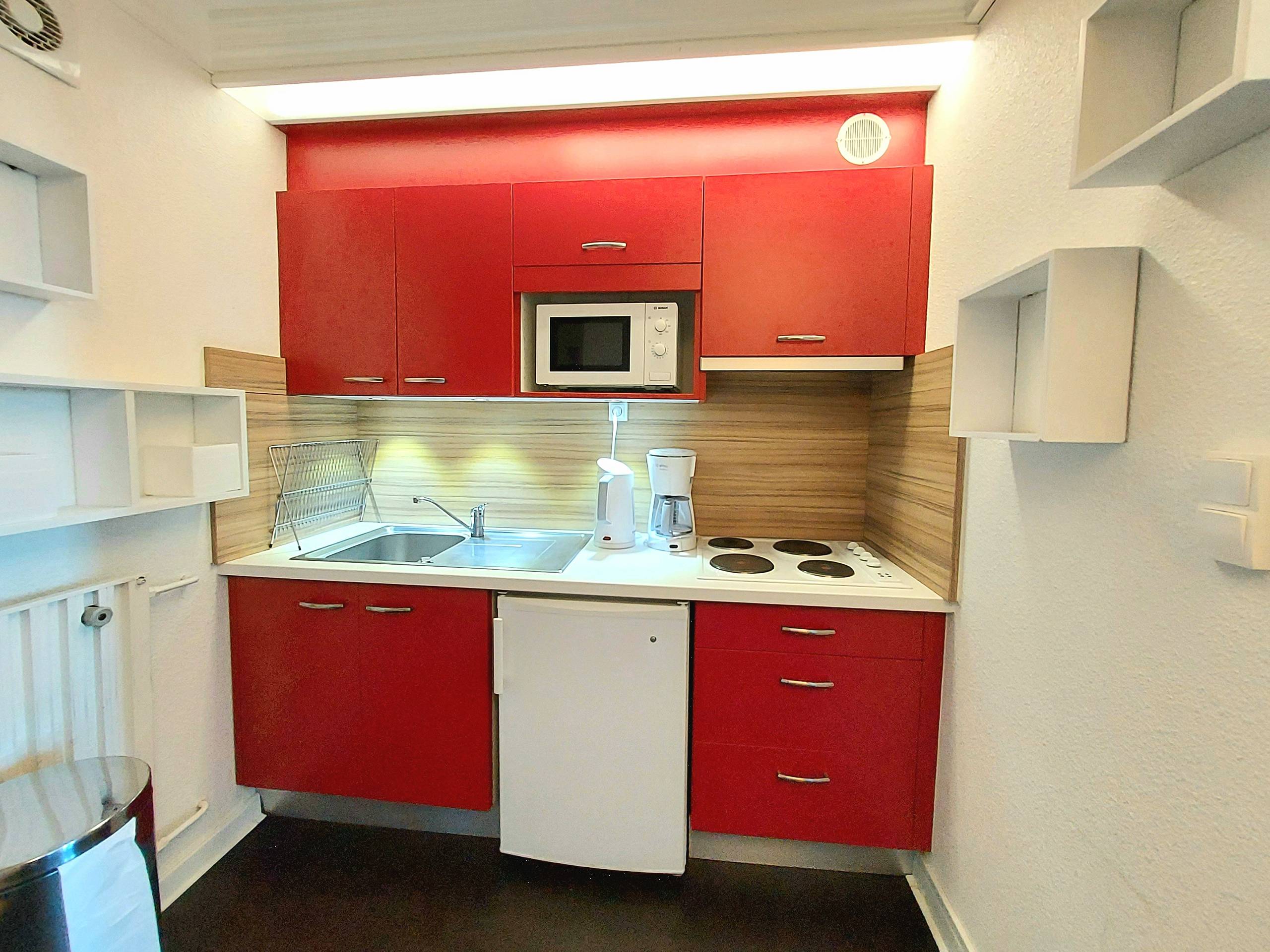 - Cuisine séparée avec réfrigérateur, grand placard de rangement, plaques électriques, micro-ondes, Airfryer.