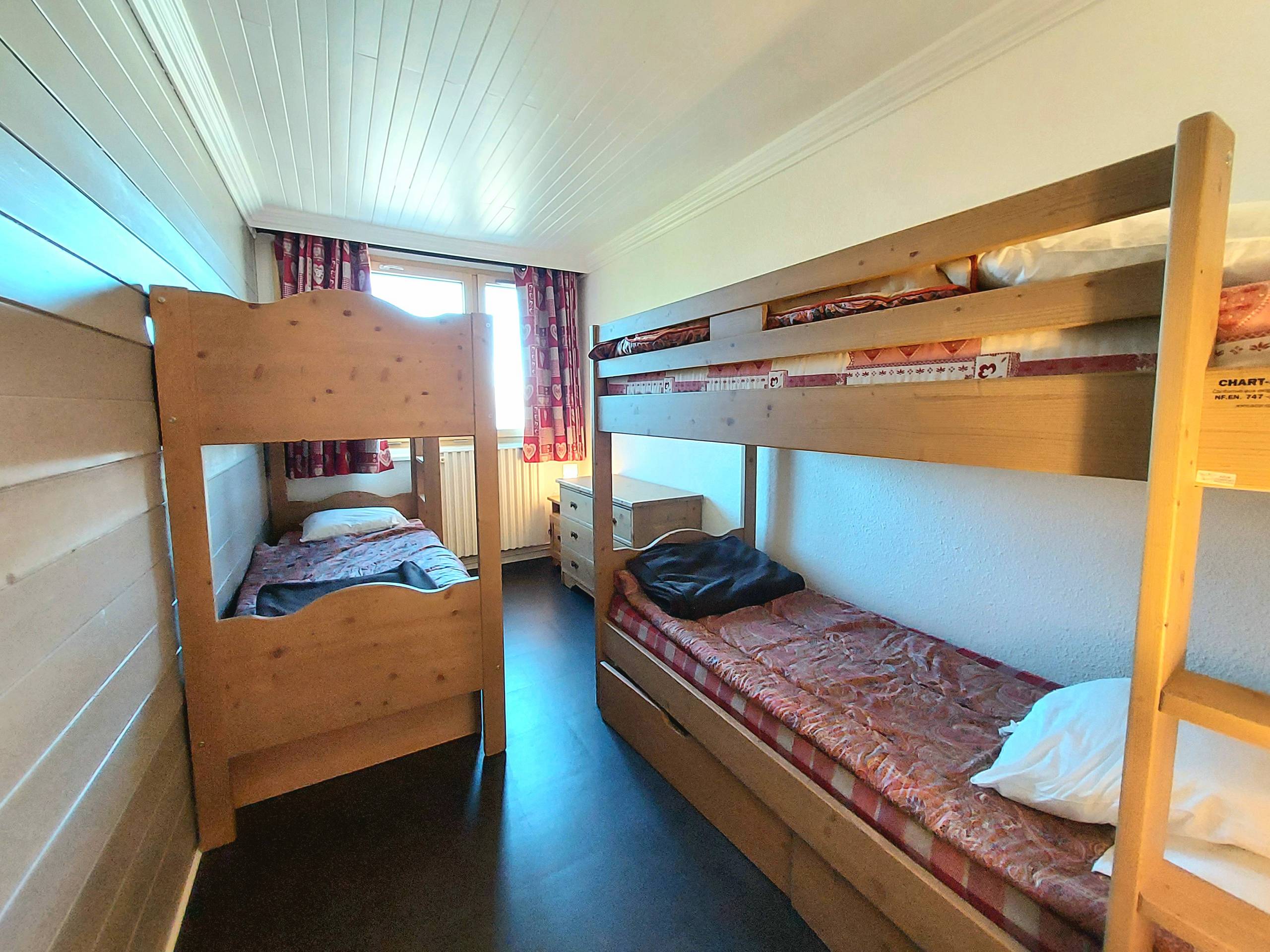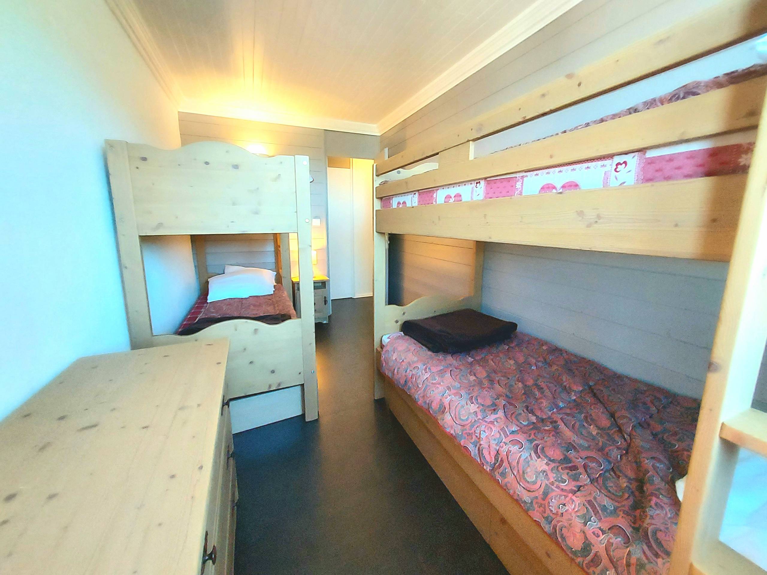 - Chambre avec deux lits superposés, rangement sous-lit.