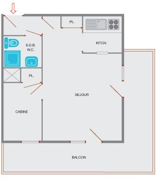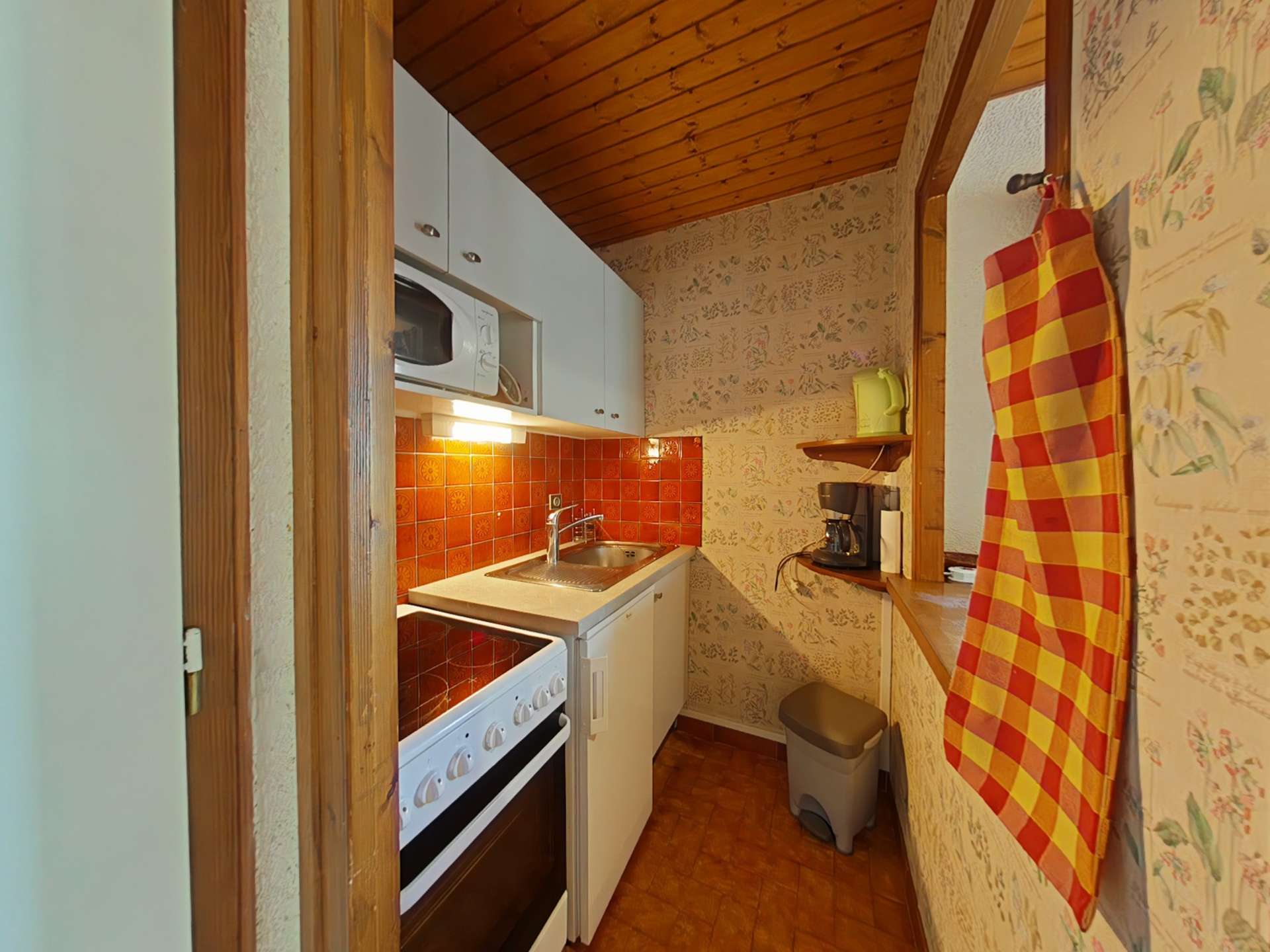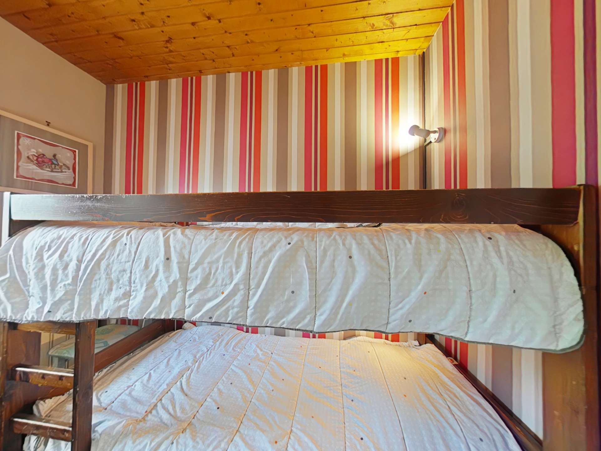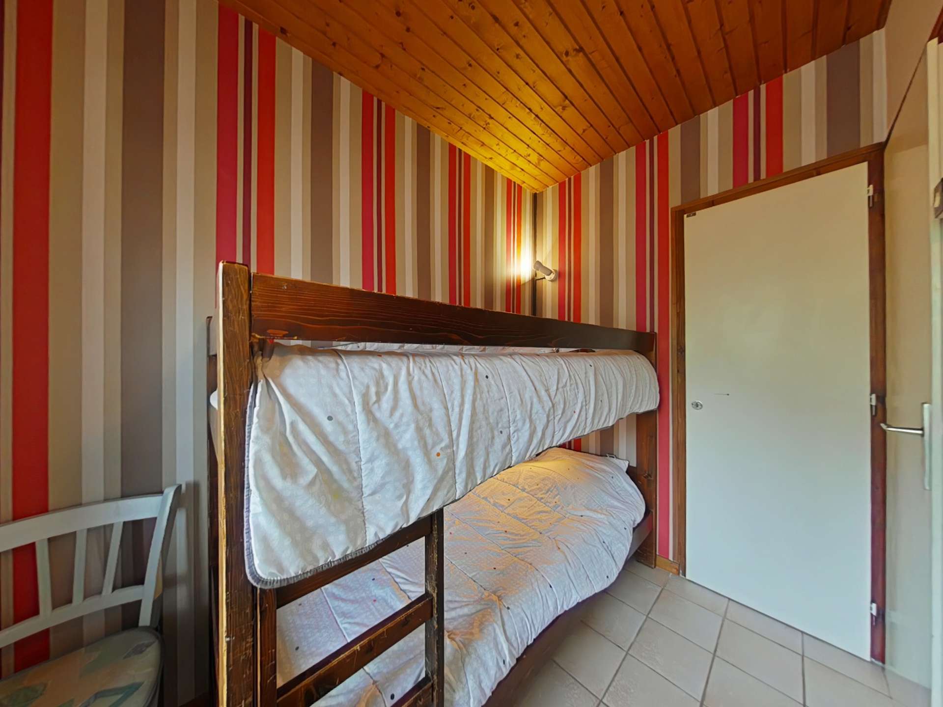 Cet appartement de vacances au 1er étage comprend un séjour avec canapé convertible 2 personnes et télévision, un coin cuisine équipé, une cabine avec 2 lits superposés, une salle de bains avec WC.