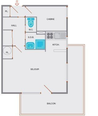 Cet appartement de vacances, en rez de chaussée surélevé, comprend un séjour avec un canapé convertible 2 places, télévision et coin repas, une kicthenette équipé d'un lave-vaisselle, une cabine avec deux lits superposés, une salle de bains et un WC indépendant.