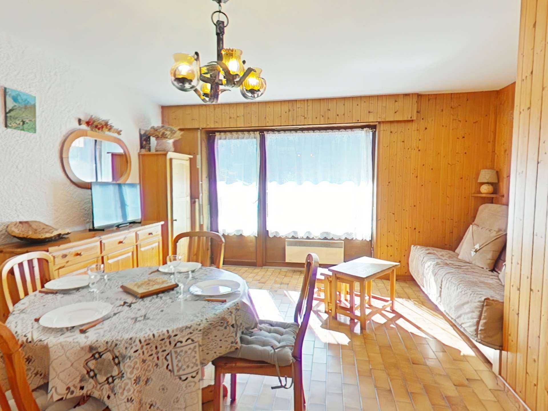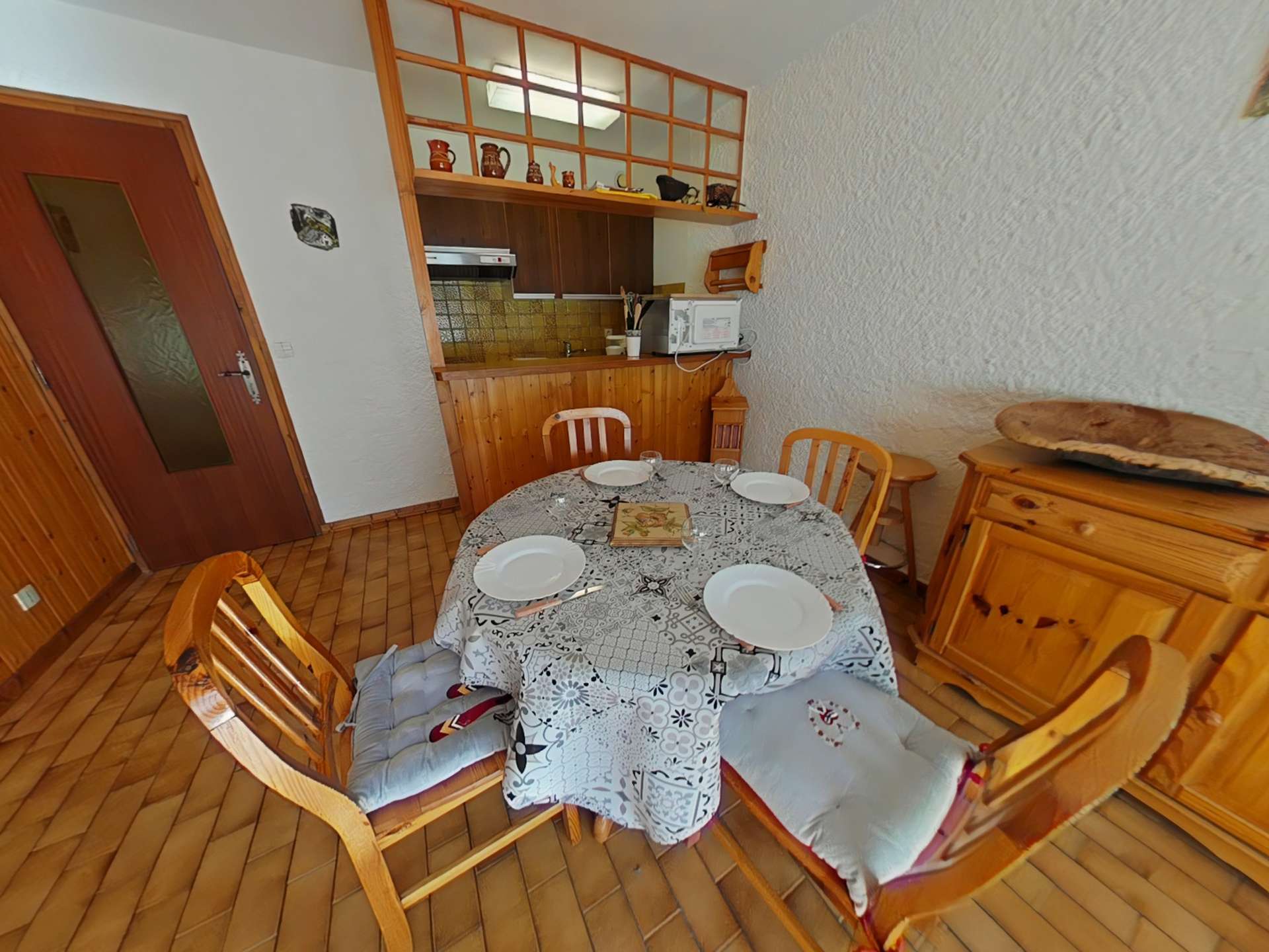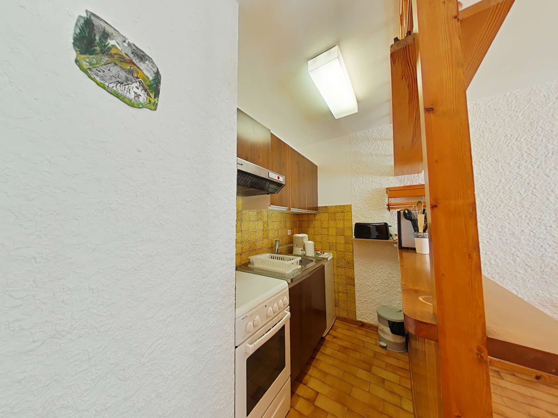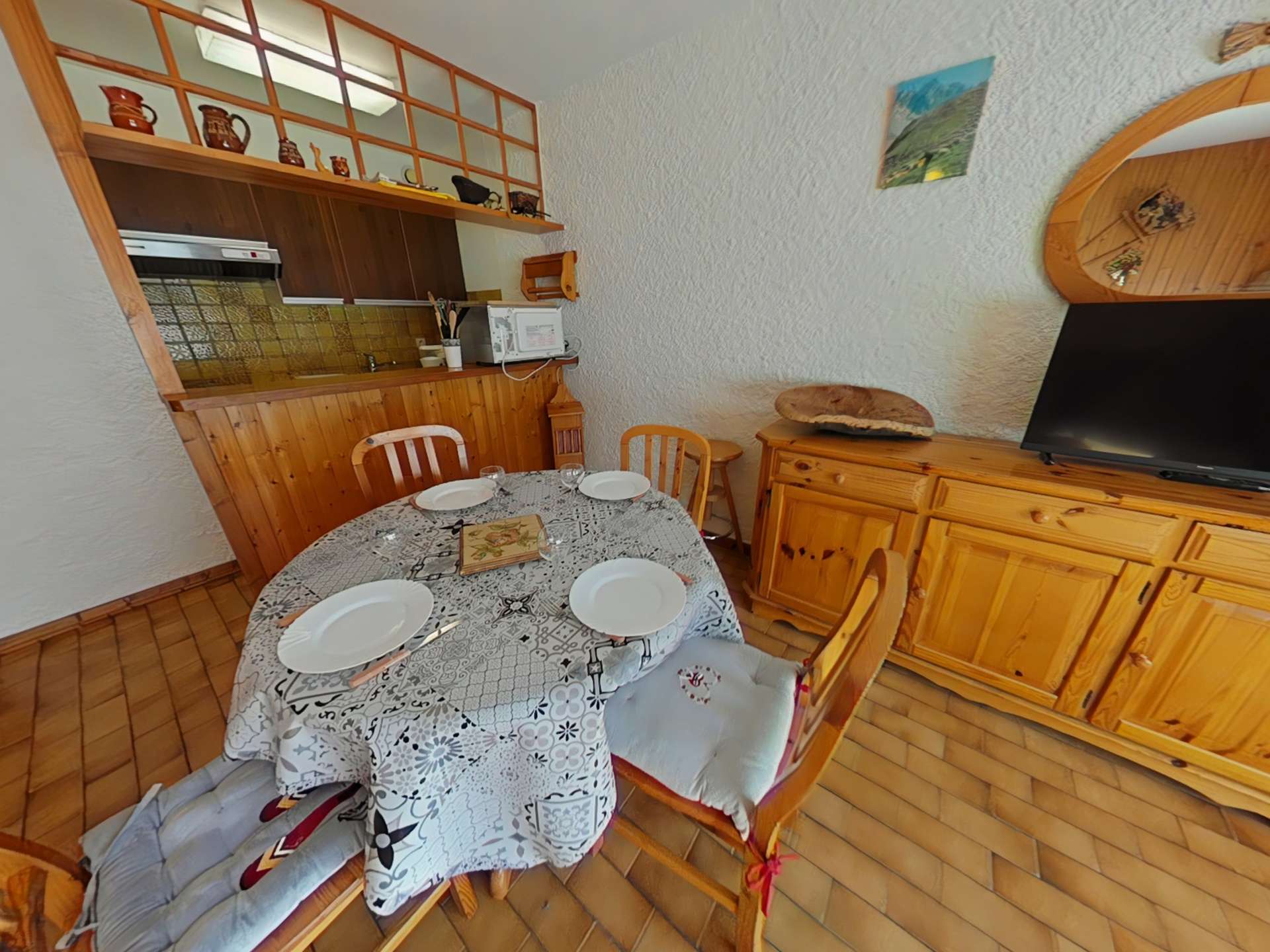 Cet appartement de vacances situé au 1er étage avec ascenseur, comprend un séjour avec canapé convertible 2 personnes et télévision, un coin cuisine équipé, un coins montagne avec deux lits superposés, une salle de bains avec WC.