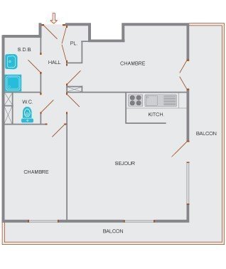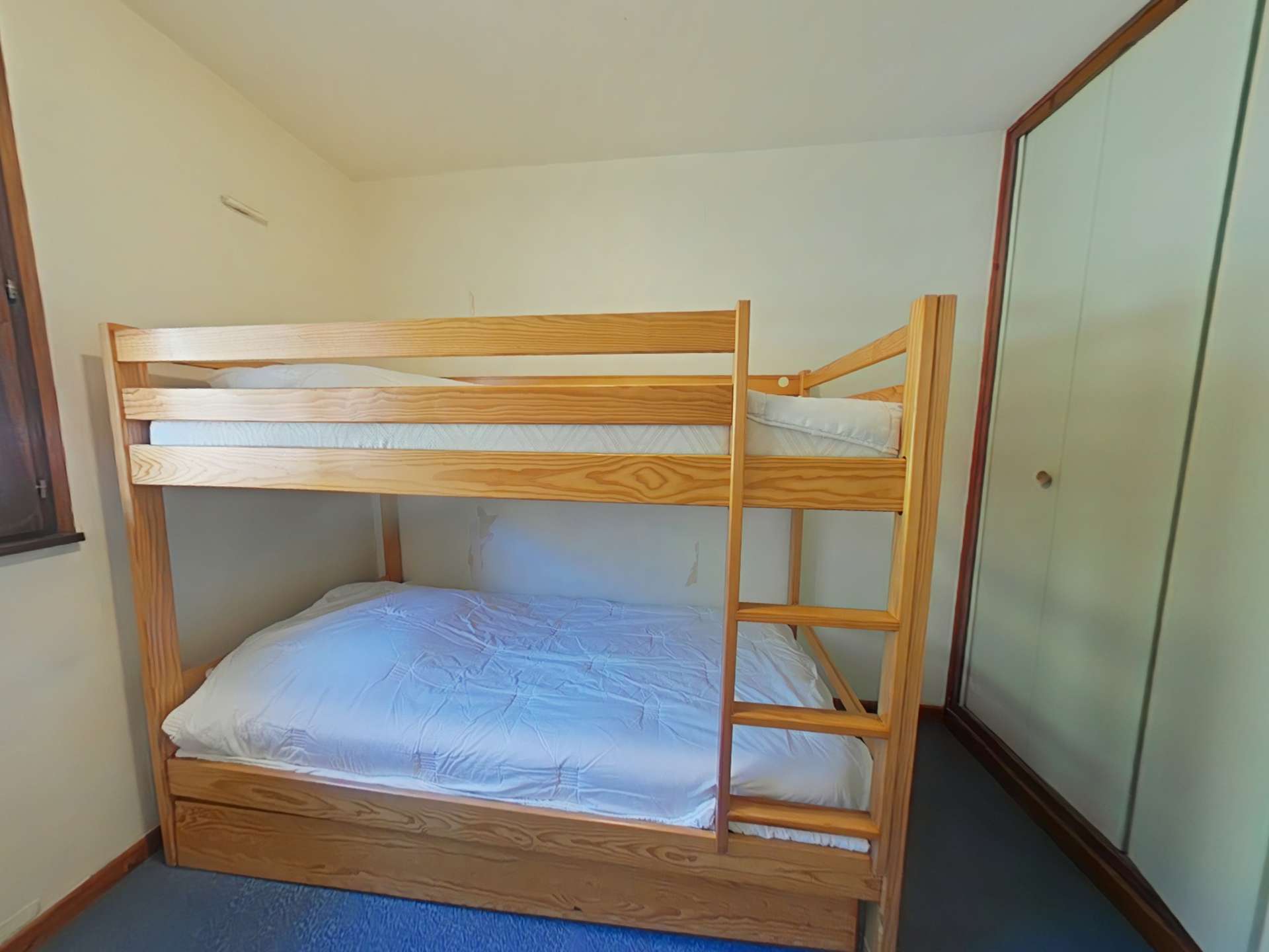 Cet appartement de vacances refait à neuf, au 2ème étage avec ascenseur, comprend un séjour avec canapé convertible deux places et télévision, un coin cuisine équipé d'un lave-vaisselle, une chambre avec un lit deux places, une chambre avec deux lits superposés, une salle de bains avec un lave-linge et un WC indépendant.