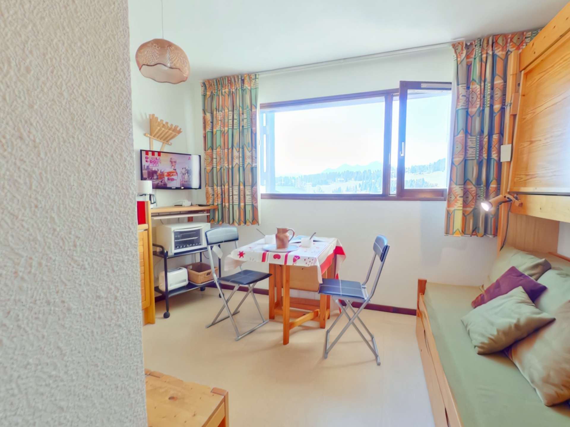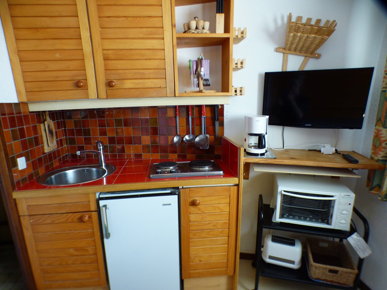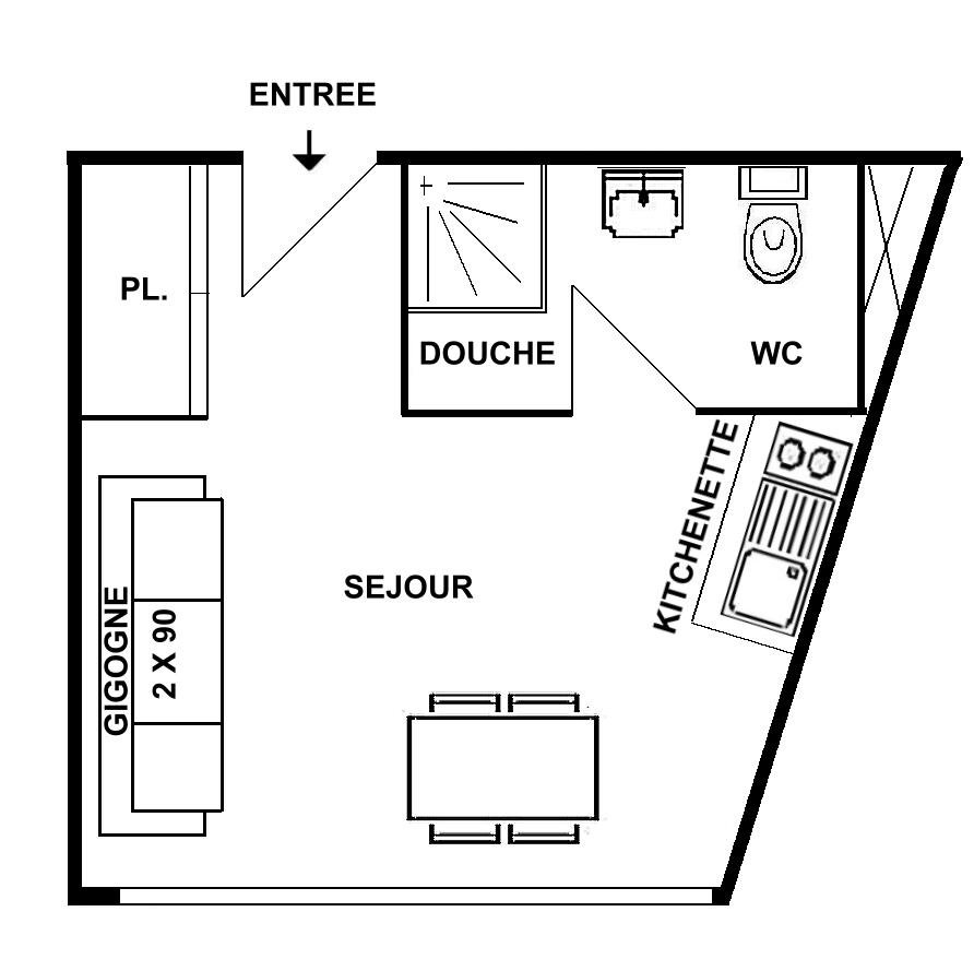 L'appartement se compose d'une kitchenette équipée, d'une pièce avec une banquette gigogne (2x80) d'une salle d'eau avec wc non séparé.