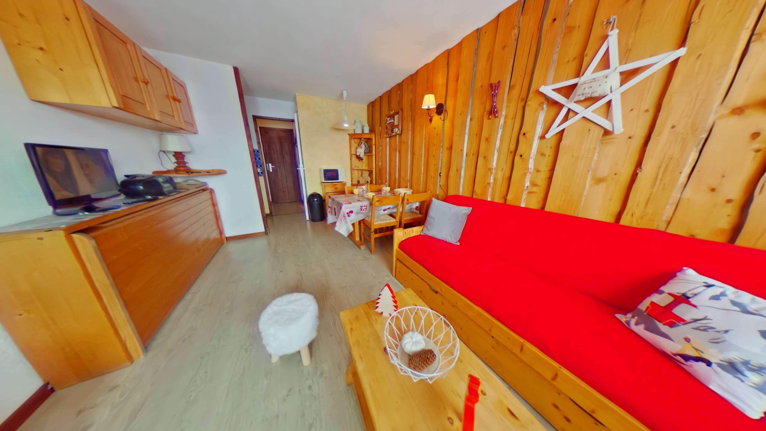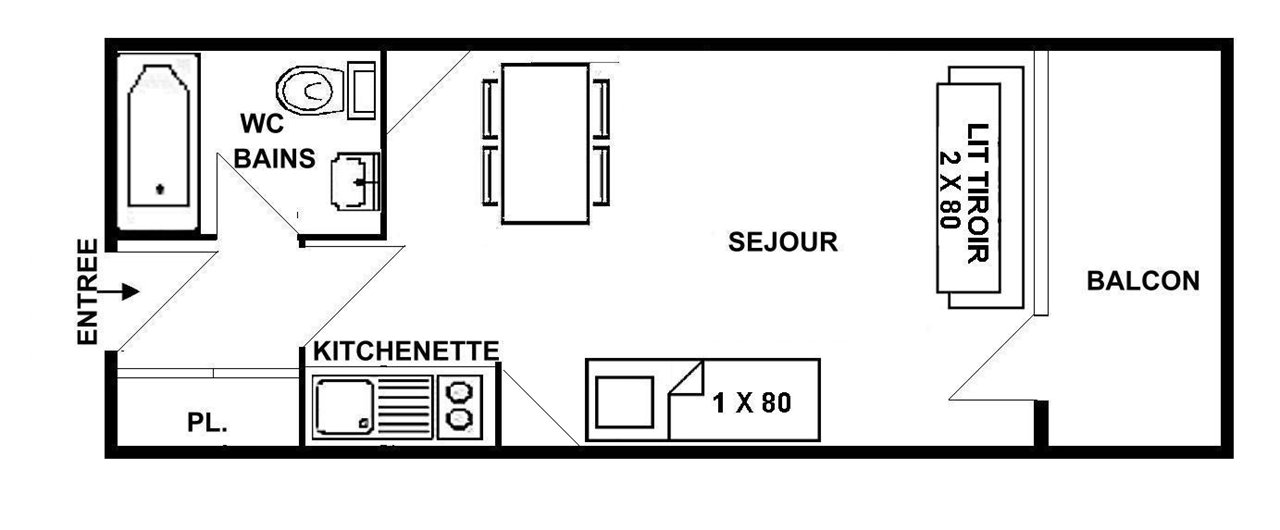L'appartement se compose d'une kitchenette équipée, d'un séjour avec un banquette gigogne 2x80, d'un lit placard en 80 et d'une salle de bains WC non séparé.