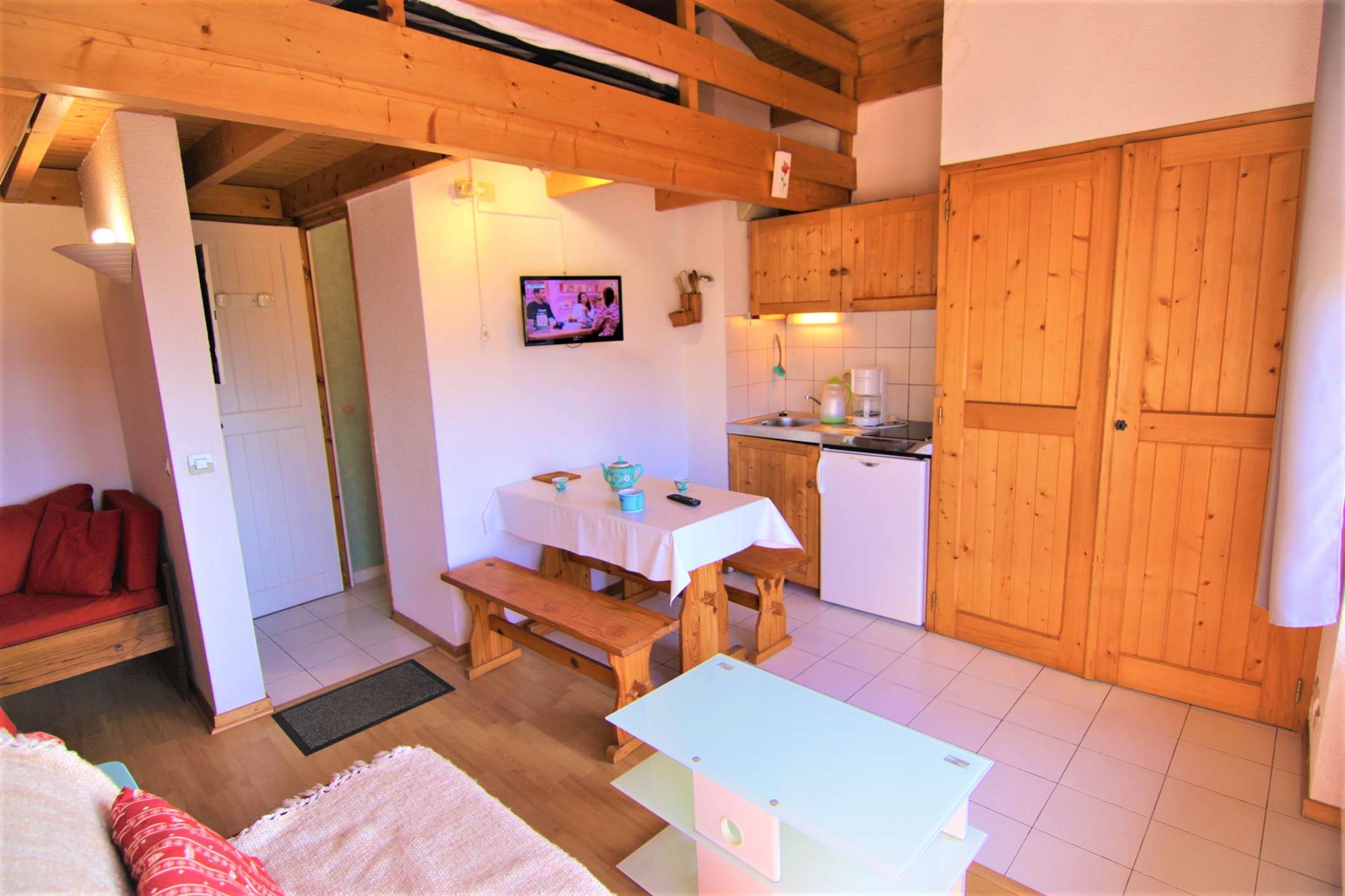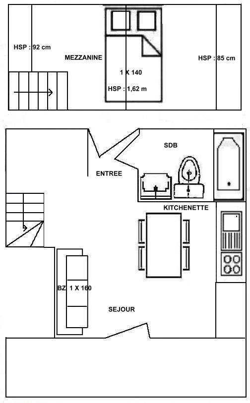 L’appartement comprend une kitchenette équipée, un séjour avec un canapé en 160, une mezzanine avec un lit en 140, une salle de bains et un wc non séparé.