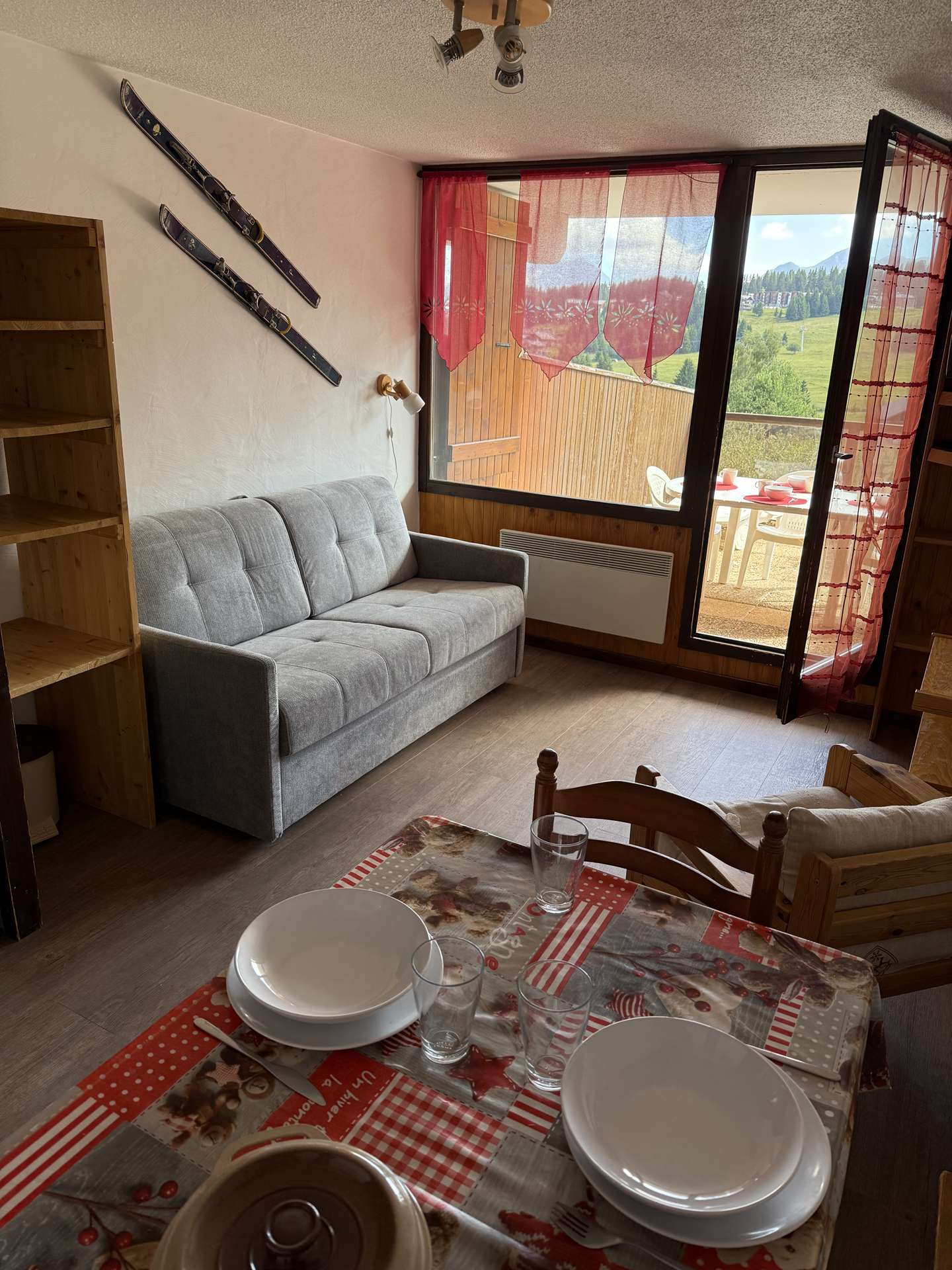L'appartement comprend une kitchenette équipée, un séjour avec un banquette BZ 140, une chambre avec lits superposés 2x90, une salle d'eau et un WC séparé.