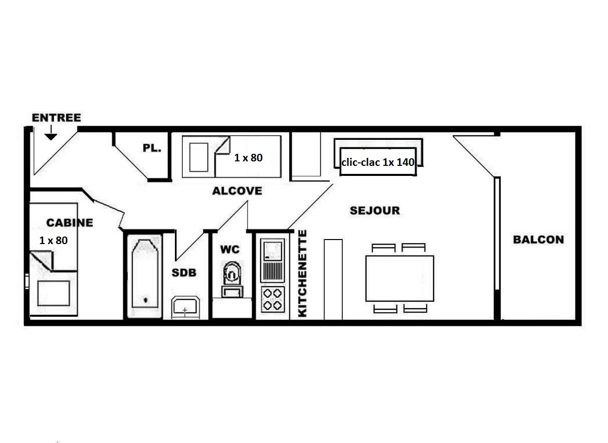 L’appartement comprend une kitchenette équipée, un séjour avec un canapé en 140, une cabine avec un lit 1 personne, une alcôve avec un lit 1 personne, une salle de bains et un wc séparé.
