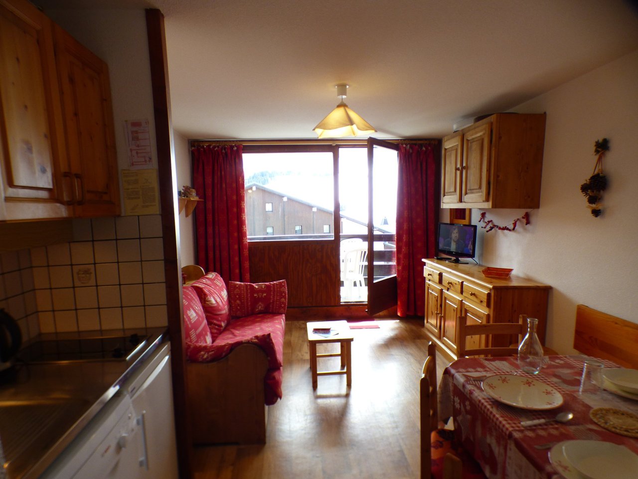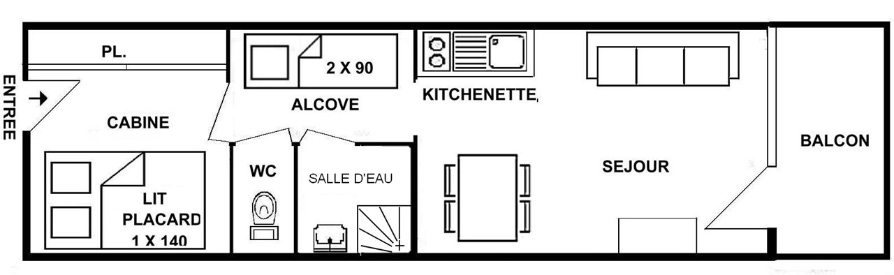 L'appartement se compose d'une kitchenette équipée, d'un séjour avec canapé, d'une alcôve avec 2 lits superposés (2x80), d'une cabine avec un lit placard de 140, d'une salle d'eau et d'un WC séparé. (NB: le lit supérieur d'un lit superposé est interdit aux - de 6 ans)