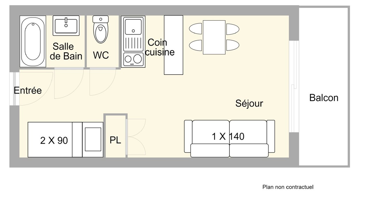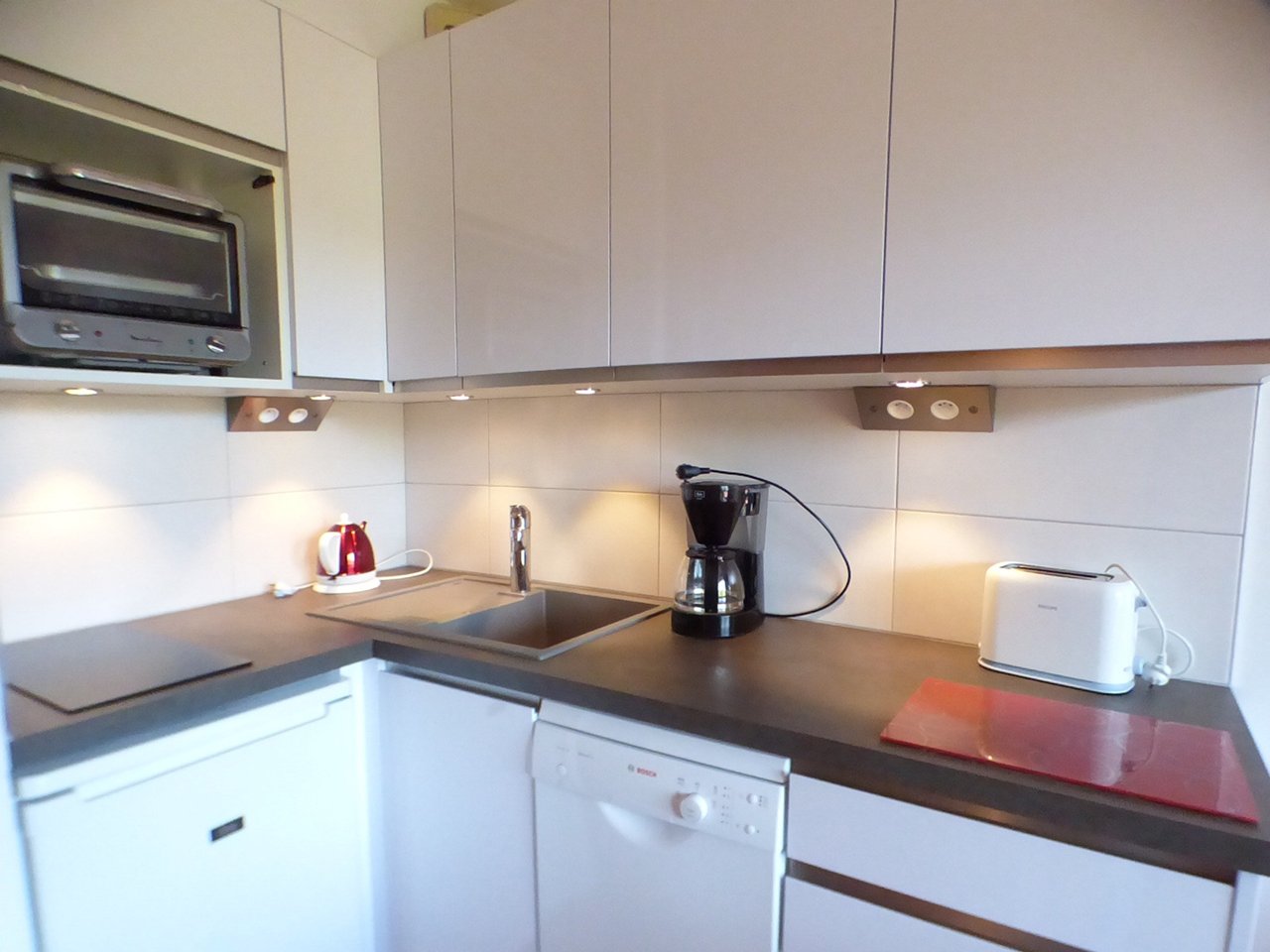 L'appartement comprend une kitchenette équipée, un séjour avec un canapé lit en 140, une alcôve avec des lits superposés 2 x 80 et une salle d'eau avec wc séparé (N.B: le lit supérieur des lits superposés est interdit aux - de 6 ans).