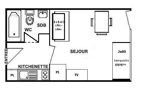 L’appartement comprend une kitchenette équipée, un séjour avec un canapé en 140 plus une banquette gigogne 2 x 80 et une salle de bains avec wc non séparé.