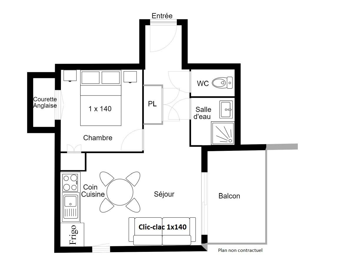 L'appartement se compose d'un séjour avec un canapé clic clac 140, d'une chambre avec un lit 140 (fenêtre ouvrant sur une courette anglaise), d'une salle d'eau et d'un WC séparé.